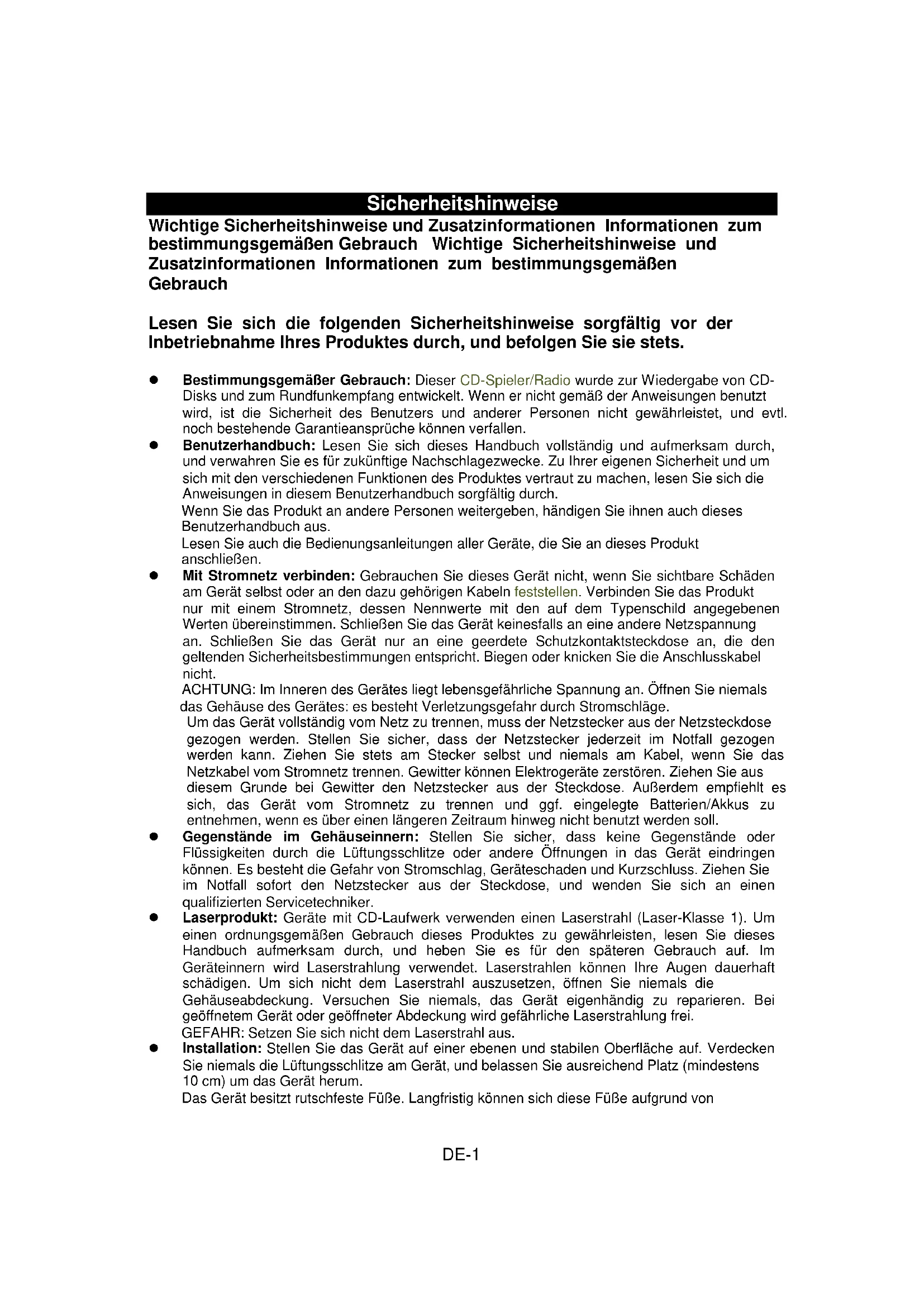 [U1]DE-1 Sicherheitshinweise Wichtige Sicherheitshinweise und Zusatzinformationen Informationen zum bestimmungsgemäßen Gebrauch Wichtige Sicherheitshinweise und Zusatzinformationen Informationen zum bestimmungsgemäßen Gebrauch Lesen Sie sich die folgenden Sicherheitshinweise sorgfältig vor der Inbetriebnahme Ihres Produktes durch, und befolgen Sie sie stets. Bestimmungsgemäßer Gebrauch: Dieser CD-Spieler/Radio wurde zur Wiedergabe von CD- Disks und zum Rundfunkempfang entwickelt. Wenn er nicht gemäß der Anweisungen benutzt wird, ist die Sicherheit des Benutzers und anderer Personen nicht gewährleistet, und evtl. noch bestehende Garantieansprüche können verfallen. Benutzerhandbuch: Lesen Sie sich dieses Handbuch vollständig und aufmerksam durch, und verwahren Sie es für zukünftige Nachschlagezwecke. Zu Ihrer eigenen Sicherheit und um sich mit den verschiedenen Funktionen des Produktes vertraut zu machen, lesen Sie sich die Anweisungen in diesem Benutzerhandbuch sorgfältig durch. Wenn Sie das Produkt an andere Personen weitergeben, händigen Sie ihnen auch dieses Benutzerhandbuch aus. Lesen Sie auch die Bedienungsanleitungen aller Geräte, die Sie an dieses Produkt anschließen. Mit Stromnetz verbinden: Gebrauchen Sie dieses Gerät nicht, wenn Sie sichtbare Schäden am Gerät selbst oder an den dazu gehörigen Kabeln feststellen. Verbinden Sie das Produkt nur mit einem Stromnetz, dessen Nennwerte mit den auf dem Typenschild angegebenen Werten übereinstimmen. Schließen Sie das Gerät keinesfalls an eine andere Netzspannung an. Schließen Sie das Gerät nur an eine geerdete Schutzkontaktsteckdose an, die den geltenden Sicherheitsbestimmungen entspricht. Biegen oder knicken Sie die Anschlusskabel nicht. ACHTUNG: Im Inneren des Gerätes liegt lebensgefährliche Spannung an. Öffnen Sie niemals das Gehäuse des Gerätes: es besteht Verletzungsgefahr durch Stromschläge. Um das Gerät vollständig vom Netz zu trennen, muss der Netzstecker aus der Netzsteckdose gezogen werden. Stellen Sie sicher, dass der Netzstecker jederzeit im Notfall gezogen werden kann. Ziehen Sie stets am Stecker selbst und niemals am Kabel, wenn Sie das Netzkabel vom Stromnetz trennen. Gewitter können Elektrogeräte zerstören. Ziehen Sie aus diesem Grunde bei Gewitter den Netzstecker aus der Steckdose. Außerdem empfiehlt es sich, das Gerät vom Stromnetz zu trennen und ggf. eingelegte Batterien/Akkus zu entnehmen, wenn es über einen längeren Zeitraum hinweg nicht benutzt werden soll. Gegenstände im Gehäuseinnern: Stellen Sie sicher, dass keine Gegenstände oder Flüssigkeiten durch die Lüftungsschlitze oder andere Öffnungen in das Gerät eindringen können. Es besteht die Gefahr von Stromschlag, Geräteschaden und Kurzschluss. Ziehen Sie im Notfall sofort den Netzstecker aus der Steckdose, und wenden Sie sich an einen qualifizierten Servicetechniker. Laserprodukt: Geräte mit CD-Laufwerk verwenden einen Laserstrahl (Laser-Klasse 1). Um einen ordnungsgemäßen Gebrauch dieses Produktes zu gewährleisten, lesen Sie dieses Handbuch aufmerksam durch, und heben Sie es für den späteren Gebrauch auf. Im Geräteinnern wird Laserstrahlung verwendet. Laserstrahlen können Ihre Augen dauerhaft schädigen. Um sich nicht dem Laserstrahl auszusetzen, öffnen Sie niemals die Gehäuseabdeckung. Versuchen Sie niemals, das Gerät eigenhändig zu reparieren. Bei geöffnetem Gerät oder geöffneter Abdeckung wird gefährliche Laserstrahlung frei. GEFAHR: Setzen Sie sich nicht dem Laserstrahl aus. Installation: Stellen Sie das Gerät auf einer ebenen und stabilen Oberfläche auf. Verdecken Sie niemals die Lüftungsschlitze am Gerät, und belassen Sie ausreichend Platz (mindestens 10 cm) um das Gerät herum. Das Gerät besitzt rutschfeste Füße. Langfristig können sich diese Füße aufgrund vonDE-2 Chemikalien auflösen. Daher empfehlen wir, das Gerät auf einer rutschfesten Oberfläche aufzustellen. ACHTUNG: Benutzen Sie das Gerät nur in geschlossenen Räumen und niemals im Freien! Kondensflüssigkeit: Wird das Gerät aus einer kalten in eine warme Umgebung gebracht (z.B. nach dem Transport), kann im Gehäuseinnern Kondensflüssigkeit entstehen. Um das Gerät vor Schäden und Ausfall zu schützen, warten Sie mindestens 2 Stunden, bevor Sie es benutzen. Gesundheitsschäden: Hohe Lautstärken können dauerhafte Gehörschäden hervorrufen. Regeln Sie die Lautstärke daher mit Vorsicht, insbesondere, wenn Sie (optionale) Kopf- oder Ohrhörer verwenden, sofern Ihr Gerät dafür vorgesehen ist. Schließen Sie die (optionalen) Kopf- bzw. Ohrhörer stets an das Gerät an, bevor Sie dieses einschalten. Anderenfalls können plötzliche Lautstärkespitzen Ihr Gehör schädigen. Kinder: Lassen Sie Kinder niemals elektrische Geräte benutzen. Kinder können mögliche Gefahren nicht immer richtig erkennen. Batterien: Halten Sie Batterien außerhalb der Reichweite von Kindern. Tauschen Sie immer alle Batterien gleichzeitig aus (mischen Sie keine verbrauchten mit neuen Batterien). Schließen Sie die Akkus und Batterien nicht kurz. Halten Sie Batterien von Hitzequellen (direktes Sonnenlicht, Feuer usw.) fern. Bei unsachgemäßer Handhabung von Akkus und Batterien besteht Explosionsgefahr. Stellen Sie keine Gegenstände auf das Gerät, und drücken Sie niemals auf das Gehäuse oder gar den Bildschirm. Stellen Sie keine Behälter mit Flüssigkeiten auf oder neben das Gerät (z.B. Getränke, Vasen usw.). Offene Brandquellen, wie z.B. brennende Kerzen dürfen nicht auf das Gerät gestellt werden. Anderenfalls kann Ihr Produkt beschädigt werden. Umgebungseffekte: Halten Sie das Gerät von Wärmequellen (Heizgeräten, Öfen, Kochstellen, Kerzen usw.), direkter Sonneneinstrahlung, Staub, Schmutz, Erschütterungen, starken Magnetfelder, Feuchtigkeit und Regen fern. Reinigung: Trennen Sie das Gerät vom Stromnetz. Reinigen Sie das Gerät mit einem weichen, leicht angefeuchteten Tuch. Verwenden Sie zur Reinigung keine Chemikalien wie Alk