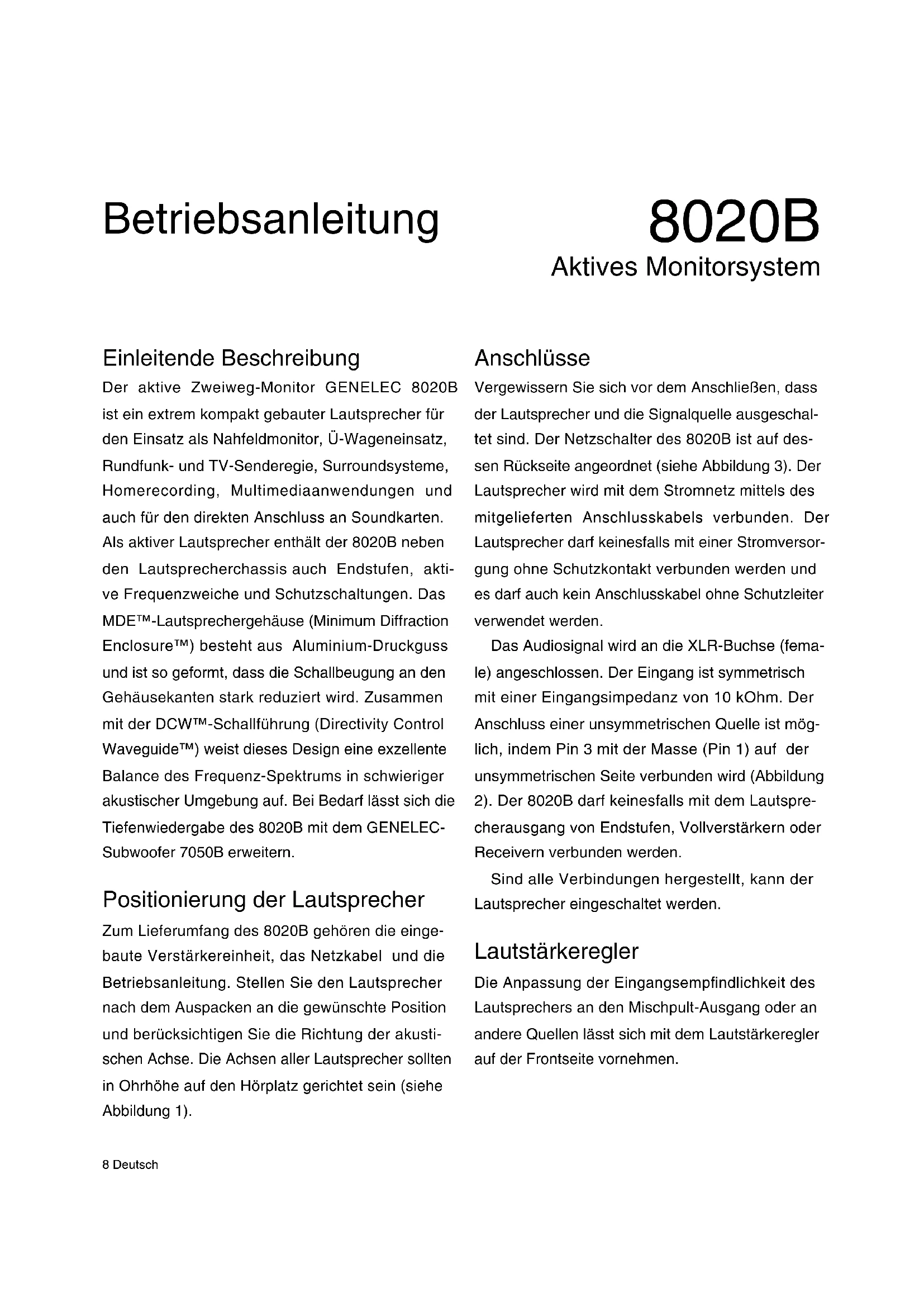 EN 55013: (2001)+ A1 : 2003 + A2: 2009 EN 61000-3-2: 2006 EN 61000-3-3 A2: 2005 The product herewith complies with the requirements of The Low Voltage Directive 2006/95/EC and EMC Directive 2004/108/EC Signed: Ilpo Martikainen Position: Chairman of the Board Date: 12-January-20098 Deutsch Einleitende Beschreibung Der aktive Zweiweg-Monitor GENELEC 8020B ist ein extrem kompakt gebauter Lautsprecher für den Einsatz als Nahfeldmonitor, Ü-Wageneinsatz, Rundfunk- und TV-Senderegie, Surroundsysteme, Homerecording, Multimediaanwendungen und auch für den direkten Anschluss an Soundkarten. Als aktiver Lautsprecher enthält der 8020B neben den Lautsprecherchassis auch Endstufen, akti- ve Frequenzweiche und Schutzschaltungen. Das MDE™-Lautsprechergehäuse (Minimum Diffraction Enclosure™) besteht aus Aluminium-Druckguss und ist so geformt, dass die Schallbeugung an den Gehäusekanten stark reduziert wird. Zusammen mit der DCW™-Schallführung (Directivity Control Waveguide™) weist dieses Design eine exzellente Balance des Frequenz-Spektrums in schwieriger akustischer Umgebung auf. Bei Bedarf lässt sich die Tiefenwiedergabe des 8020B mit dem GENELEC- Subwoofer 7050B erweitern. Positionierung der Lautsprecher Zum Lieferumfang des 8020B gehören die einge- baute Verstärkereinheit, das Netzkabel und die Betriebsanleitung. Stellen Sie den Lautsprecher nach dem Auspacken an die gewünschte Position und berücksichtigen Sie die Richtung der akusti- schen Achse. Die Achsen aller Lautsprecher sollten in Ohrhöhe auf den Hörplatz gerichtet sein (siehe Abbildung 1). Anschlüsse Vergewissern Sie sich vor dem Anschließen, dass der Lautsprecher und die Signalquelle ausgeschal- tet sind. Der Netzschalter des 8020B ist auf des- sen Rückseite angeordnet (siehe Abbildung 3). Der Lautsprecher wird mit dem Stromnetz mittels des mitgelieferten Anschlusskabels verbunden. Der Lautsprecher darf keinesfalls mit einer Stromversor- gung ohne Schutzkontakt verbunden werden und es darf auch kein Anschlusskabel ohne Schutzleiter verwendet werden. Das Audiosignal wird an die XLR-Buchse (fema- le) angeschlossen. Der Eingang ist symmetrisch mit einer Eingangsimpedanz von 10 kOhm. Der Anschluss einer unsymmetrischen Quelle ist mög- lich, indem Pin 3 mit der Masse (Pin 1) auf der unsymmetrischen Seite verbunden wird (Abbildung 2). Der 8020B darf keinesfalls mit dem Lautspre- cherausgang von Endstufen, Vollverstärkern oder Receivern verbunden werden. Sind alle Verbindungen hergestellt, kann der Lautsprecher eingeschaltet werden. Lautstärkeregler Die Anpassung der Eingangsempfindlichkeit des Lautsprechers an den Mischpult-Ausgang oder an andere Quellen lässt sich mit dem Lautstärkeregler auf der Frontseite vornehmen. 8020B Aktives Monitorsystem BetriebsanleitungDeutsch 9 Einstellung der Filter Der Frequenzgang des GENELEC 8020B lässt sich zur Anpassung an die akustische Umgebung justie- ren. Dazu sind DIP-Schalter an der Gehäuserück- seite angeordnet, mit denen die entsprechenden Filter aktiviert werden können. Die Filter sind „Treble Tilt“, Bass Tilt“ und „Bass Roll-Off“. Empfehlendwert ist der Einsatz eines akustischen Mess-System wie WinMLS, um das Ergebnis der Justierung zu über- prüfen. Allerdings kann auch sorgfältiges Hören mit ausgewähltem Audiomaterial zu guten Ergebnissen verhelfen, wenn ein Mess-System nicht verfügbar ist. Die Tabelle 1 zeigt einige typische Einstellungen für verschiedene Positionen im Raum. Die Tabelle 4 zeigt die Wirkung der Einstellmöglichkeiten im refle- xionsfreien Raum. Treble Tilt Das Treble-Tilt-Filter senkt hohe Frequenzen ober- halb von 5 kHz in 2 dB-Stufen ab (Schalter 1). Es kann eingesetzt werden, wenn eine übertriebene Höhenwiedergabe ausgeglichen werden soll. Bass Tilt Das Bass-Tilt-Filter erlaubt eine Abschwächung der Wiedergabe unter 2 kHz in drei Stufen. Die- se Abschwächung kann notwendig werden, wenn der Lautsprecher nahe einer Wand oder einer anderen Fläche aufgestellt wird. Die Absenkungs- stufen sind –2 dB (Schalter 3 auf „ON“), –4 dB (Schalter 4 auf „ON“) und –6 dB (beide Schalter auf „ON“). Abbildung 1: Lage der akustischen Achse Abbildung 2: Anschlusskabel für unsymmetrische Tonquellen (beispielsweise Cinch auf XLR) Abbildung 3: Einstellmöglichkeiten und Anschlüsse auf der Rückseite des 8020B.10 Deutsch Bass Roll-Off Der Bass-Roll-Off-Schalter (Schalter 2) aktiviert ein Hochpassfilter mit einer Grenzfrequenz von 85 Hz, das als Gegenstück zu dem in die Subwoofer 7050A und 7050B eingebauten Tiefpassfilter fungiert. Der Schalter muss immer dann aktiviert sein, wenn der 8020B in Kombination mit einem dieser beiden Sub- woofer eingesetzt wird. Ab Werk sind alle Filter auf „OFF“ gestellt (deak- tiviert), um einen ebenen Frequenzgang im refle- xionsfreien Raum zu erzeugen. Diese Einstellung sollte immer als Ausgangspunkt für Optimierungen dienen. Die beste Balance der Frequenzbereiche findet sich bei Messung oder Hörtest durch ver- suchsweise Aktivierung und Kombination der ver- schiedenen Einstellmöglichkeiten. Aufstellungsvorschläge Korrekte Monitorausrichtung Die Monitore sollten so ausgerichtet sein, dass ihre akustische Achse (siehe Abbildung 1) auf die Hörposition gerichtet ist. Empfehlenswert ist die vertikale Aufstellung, weil hier die Gefahr von Aus- löschungseffekten in der Nähe der Übergangsfre- quenz zwischen Bass- und Hochtonlautsprecher am geringsten ist. Symmetrie Die Monitore sollen symmetrisch und in gleicher Distanz zum Hörort positioniert werden. Nach Mög- lichkeit soll der Hörort auf einer gedachten Linie in der Mitte zwischen linker und rechter Raumbegren- zungswand liegen. Die Monitore stehen dann gleich weit von dieser Linie entfernt. Minimierung von Reflexionen Akustische Reflexionen durch in der Nähe der Mo- nitore befindliche Gegenstände wie beispielsweise Möbel oder PC-Monitore können unerwünsch- te klangliche Färbungen verursachen. Dies kann weitgehend vermieden werden, we