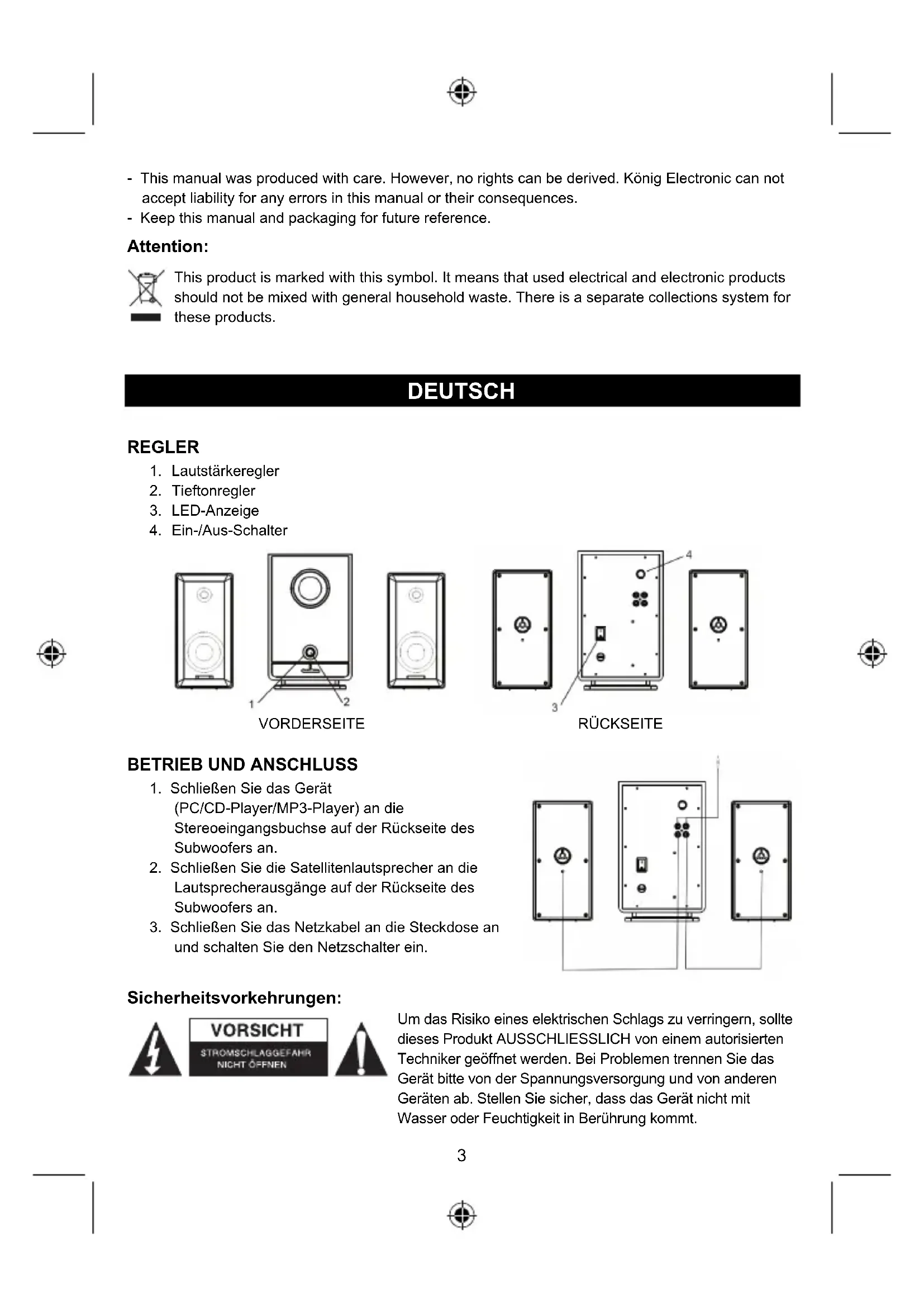 und schalten Sie den Netzschalter ein. Sicherheitsvorkehrungen: Um das Risiko eines elektrischen Schlags zu verringern, sollte dieses Produkt AUSSCHLIESSLICH von einem autorisierten Techniker geöffnet werden. Bei Problemen trennen Sie das Gerät bitte von der Spannungsversorgung und von anderen Geräten ab. Stellen Sie sicher, dass das Gerät nicht mit Wasser oder Feuchtigkeit in Berührung kommt.4 Wartung: Nur mit einem trockenen Tuch säubern. Keine Reinigungs- oder Scheuermittel verwenden. Garantie: Es kann keine Garantie oder Haftung für irgendwelche Änderungen oder Modifikationen des Produkts oder für Schäden übernommen werden, die aufgrund einer nicht ordnungsgemäßen Anwendung des Produkts entstanden sind. Allgemeines: - Design und technische Daten können ohne vorherige Ankündigung geändert werden. - Alle Logos, Marken und Produktnamen sind Marken oder eingetragene Marken ihrer jeweiligen Eigentümer und werden hiermit als solche anerkannt. - Diese Bedienungsanleitung wurde sorgfältig verfasst. Dennoch können daraus keine Rechte und Pflichten hergeleitet werden. König Electronic haftet nicht für mögliche Fehler in dieser Bedienungsanleitung oder deren Folgen. - Bitte bewahren Sie Bedienungsanleitung und Verpackung für spätere Verwendung auf. Achtung: Dieses Produkt ist mit diesem Symbol gekennzeichnet. Es bedeutet, dass die ausgedienten elektrischen und elektronischen Produkte nicht mit dem allgemeinen Haushaltsmüll entsorgt werden dürfen. Für diese Produkte stehen gesonderte Sammelsysteme zur Verfügung.