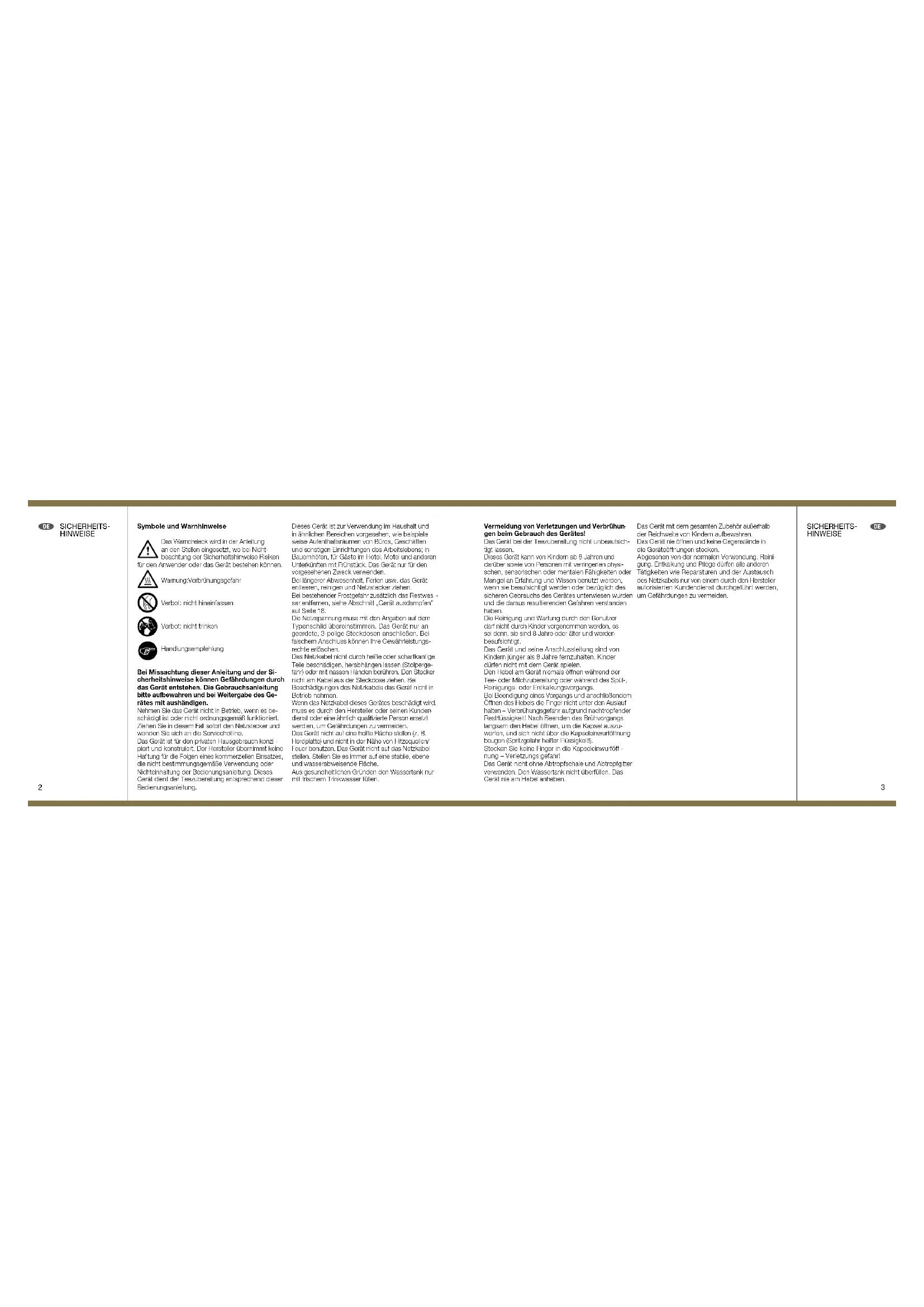 RUS IT2 3 Symbole und Warnhinweise Das Warndreieck wird in der Anleitung an den Stellen eingesetzt, wo bei Nicht- beachtung der Sicherheitshinweise Risiken für den Anwender oder das Gerät bestehen können. Warnung: Verbrühungs gefahr Verbot: nicht hineinfassen Verbot: nicht trinken Handlungsempfehlung Bei Missachtung dieser Anleitung und der Si- cherheitshinweise können Gefährdungen durch das Gerät entstehen. Die Gebrauchsanleitung bitte aufbewahren und bei Weitergabe des Ge- rätes mit aushändigen.