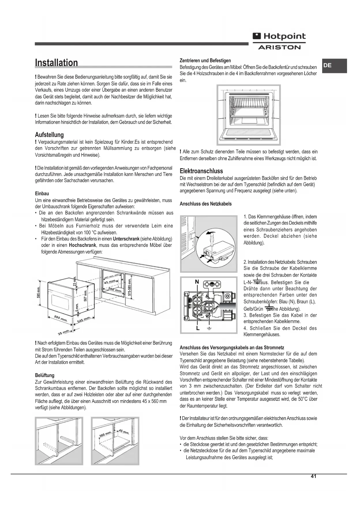 - Für den Einbau des Backofens in einen Unterschrank (siehe Abbildung) oder in einen Hochschrank, muss das entsprechende Möbel über folgende Abmessungen verfügen: 595 mm.595 mm.25 mm.545 mm.5 mm.567 mm.23 mm.575-585 mm.45 mm.560 mm. 547 mm. min. ! Nach erfolgtem Einbau des Gerätes muss die Möglichkeit einer Berührung mit Strom führenden Teilen ausgeschlossen sein. Die auf dem Typenschild enthaltenen Verbrauchsangaben wurden bei dieser Art der Installation ermittelt. Belüftung Zur Gewährleistung einer einwandfreien Belüftung die Rückwand des Schrankumbaus entfernen. Der Backofen sollte möglichst so installiert werden, dass er auf zwei Holzleisten oder aber auf einer durchgehenden Fläche auiegt, die über einen Ausschnitt von mindestens 45 x 560 mm verfügt (siehe Abbildungen). 560 mm. 45 mm. Zentrieren und Befestigen Befestigung des Gerätes am Möbel: Öffnen Sie die Backofentür und schrauben Sie die 4 Holzschrauben in die 4 im Backofenrahmen vorgesehenen Löcher ein. ! Alle zum Schutz dienenden Teile müssen so befestigt werden, dass ein Entfernen derselben ohne Zuhilfenahme eines Werkzeugs nicht möglich ist. Elektroanschluss Die mit einem Dreileiterkabel ausgerüsteten Backöfen sind für den Betrieb mit Wechselstrom bei der auf dem Typenschild (bendlich auf dem Gerät) angegebenen Spannung und Frequenz ausgelegt (siehe unten). Anschluss des Netzkabels
