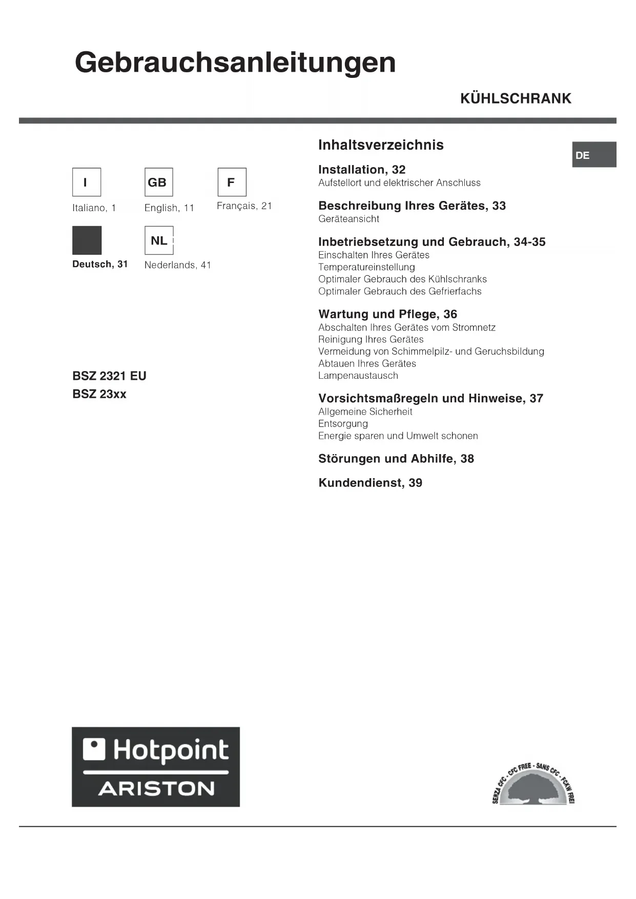BEDIENUNGSANLEITUNG BSZ 2333 HOTPOINT