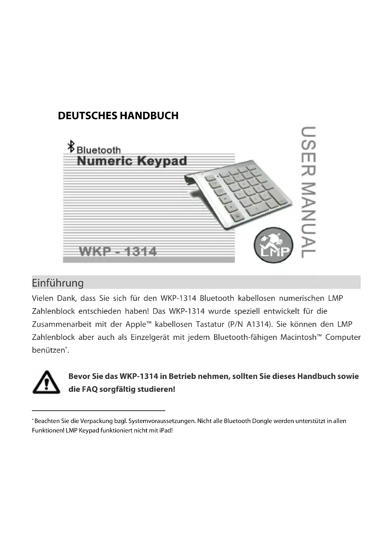 window displayed called “Keyboard identification”. I am supposed to press the key next to the shift key. But there is no shift key on the LMP Keypad. What do I need to do? The message can be ignored. Simply press the red button in the upper left corner to close this window. Your Macintosh™ will recognize the LMP Keypad.All rights reserved. All trade names are registered trademarks of the respective manufacturers listed. All specifications are subject to change without prior notice. Design & Copyrights by Cropmark AG, Switzerland. info@cropmark.ch, www.lmp-adapter.comDEUTSCHES HANDBUCH Einführung Vielen Dank, dass Sie sich für den WKP-1314 Bluetooth kabellosen numerischen LMP Zahlenblock entschieden haben! Das WKP-1314 wurde speziell entwickelt für die Zusammenarbeit mit der Apple™ kabellosen Tastatur (P/N A1314). Sie können den LMP Zahlenblock aber auch als Einzelgerät mit jedem Bluetooth-fähigen Macintosh™ Computer benützen
