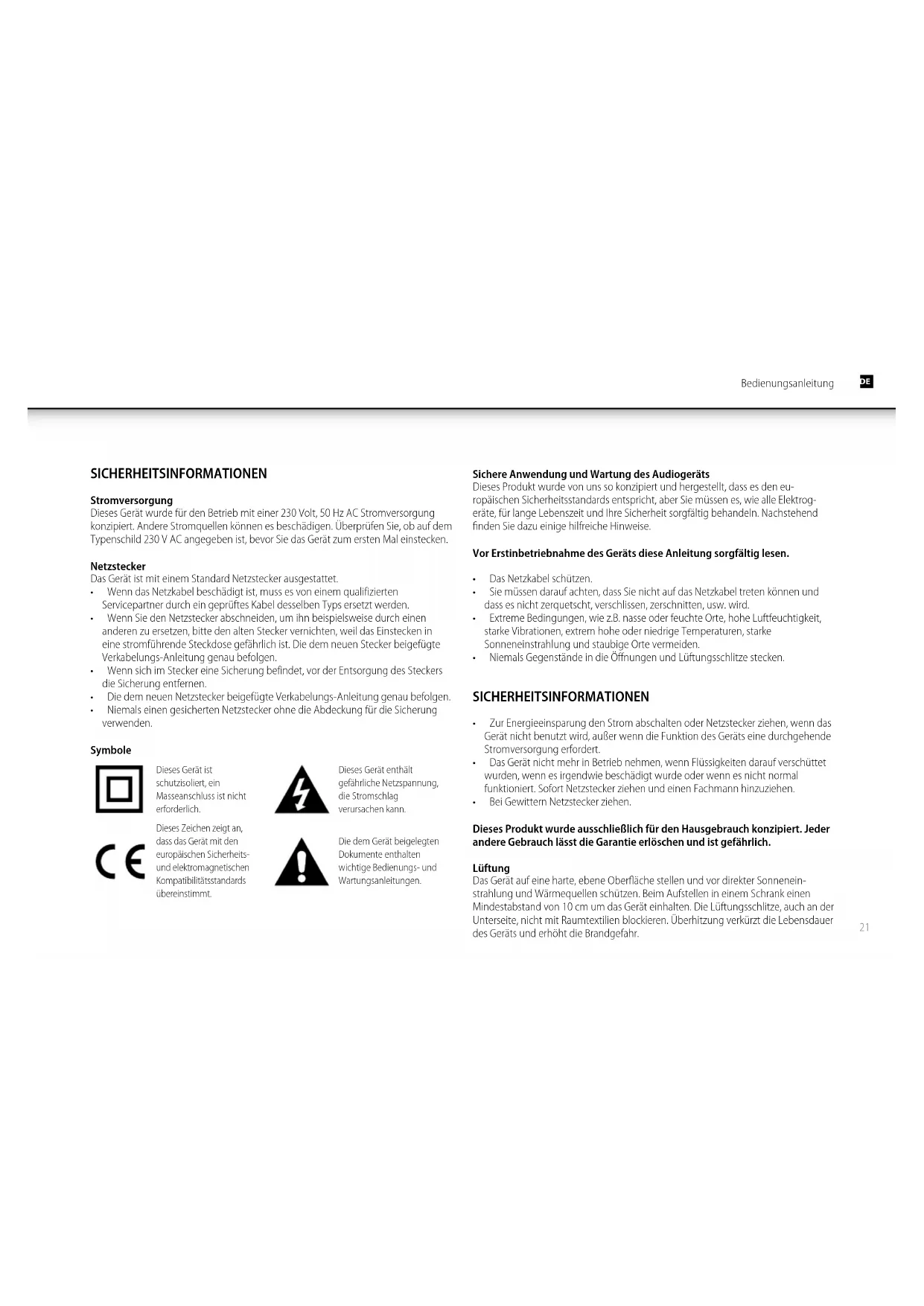- Niemals einen gesicherten Netzstecker ohne die Abdeckung für die Sicherung verwenden. Symbole Dieses Gerät ist schutzisoliert, ein Masseanschluss ist nicht erforderlich. Dieses Gerät enthält gefährliche Netzspannung, die Stromschlag verursachen kann. Dieses Zeichen zeigt an, dass das Gerät mit den europäischen Sicherheits- und elektromagnetischen Kompatibilitätsstandards übereinstimmt. Die dem Gerät beigelegten Dokumente enthalten wichtige Bedienungs- und Wartungsanleitungen. Sichere Anwendung und Wartung des Audiogeräts Dieses Produkt wurde von uns so konzipiert und hergestellt, dass es den eu- ropäischen Sicherheitsstandards entspricht, aber Sie müssen es, wie alle Elektrog- eräte, für lange Lebenszeit und Ihre Sicherheit sorgfältig behandeln. Nachstehend finden Sie dazu einige hilfreiche Hinweise. Vor Erstinbetriebnahme des Geräts diese Anleitung sorgfältig lesen.