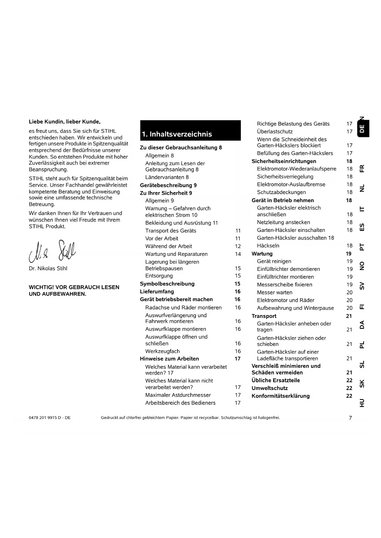 FRNLITESPTNOSVFIDAPLSLSKHU 0478 201 9915 D - DE Liebe Kundin, lieber Kunde, es freut uns, dass Sie sich für STIHL entschieden haben. Wir entwickeln und fertigen unsere Produkte in Spitzenqualität entsprechend der Bedürfnisse unserer Kunden. So entstehen Produkte mit hoher Zuverlässigkeit auch bei extremer Beanspruchung. STIHL steht auch für Spitzenqualität beim Service. Unser Fachhandel gewährleistet kompetente Beratung und Einweisung sowie eine umfassende technische Betreuung. Wir danken Ihnen für Ihr Vertrauen und wünschen Ihnen viel Freude mit Ihrem STIHL Produkt. Dr. Nikolas Stihl