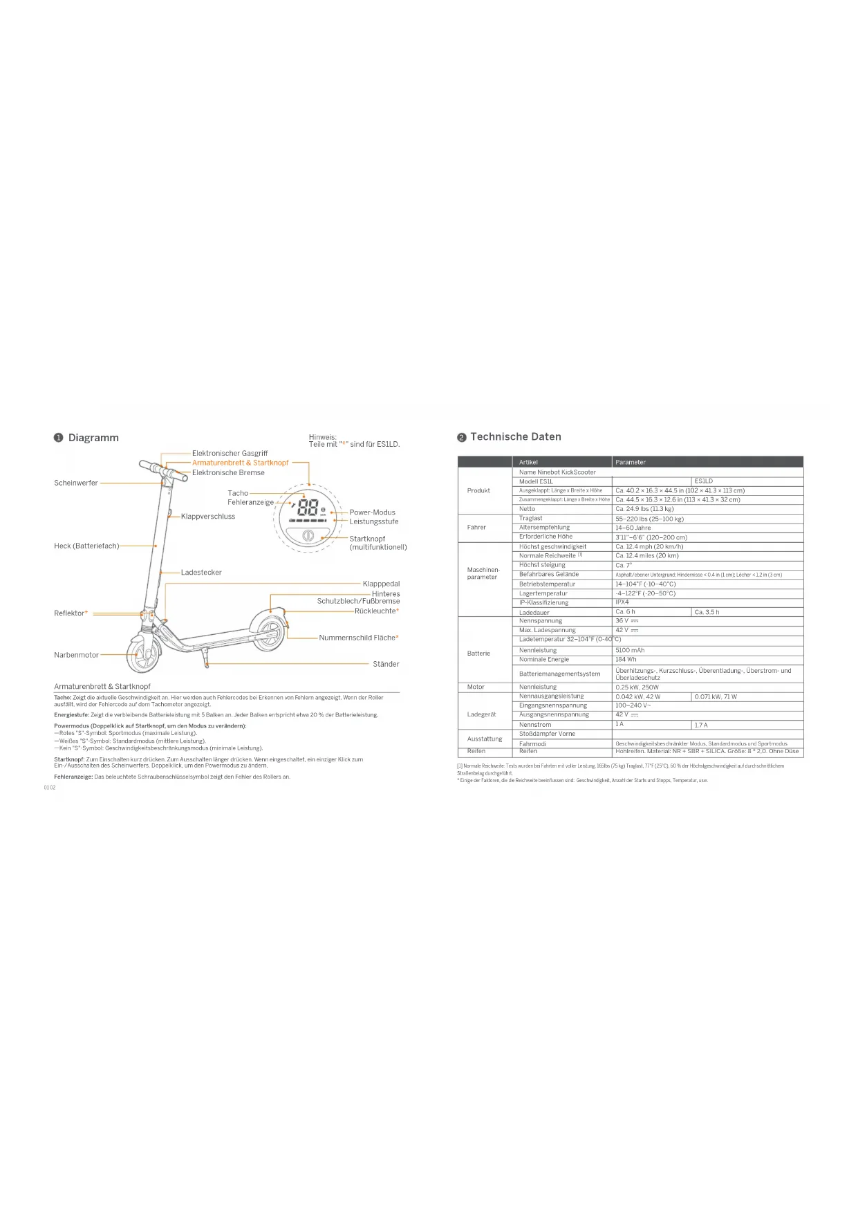 - Einige der Faktoren, die die Reichweite beeinflussen sind: Geschwindigkeit, Anzahl der Starts und Stopps, Temperatur, usw. Technische DatenArtikelProduktMaschinen-parameterBatterieMotorLadegerätAusstattungReifen Ausgeklappt: Länge x Breite x Höhe Zusammengeklappt: Länge x Breite x HöheTraglastFahrerAltersempfehlungErforderliche HöheHöchst geschwindigkeit Normale Reichweite [1] Höchst steigungBetriebstemperaturLagertemperaturIP-KlassifizierungBefahrbares GeländeMax. LadespannungLadetemperatur 32–104°F (0-40°C)NennleistungBatteriemanagementsystemEingangsnennspannungAusgangsnennspannungNennstromNennspannungNennleistungNennausgangsleistungLadedauerCa. 40.2 × 16.3 × 44.5 in (102 × 41.3 × 113 cm)Modell ES1LName Ninebot KickScooterCa. 44.5 × 16.3 × 12.6 in (113 × 41.3 × 32 cm)55–220 lbs (25–100 kg)Ca. 12.4 miles (20 km)Ca. 7°36 V 14–104°F (-10–40°C)-4–122°F (-20–50°C)42 V 5100 mAhNominale Energie184 Wh0.25 kW, 250WÜberhitzungs-, Kurzschluss-, Überentladung-, Überstrom- und Überladeschutz100–240 V~42 V 1 A