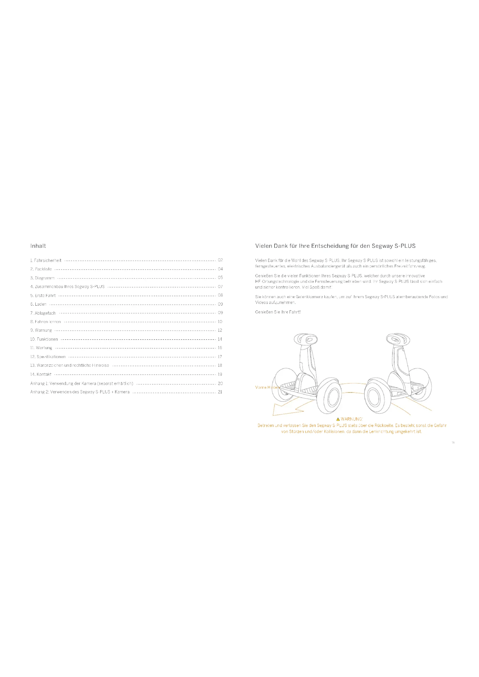 Anhang 1: Verwendung der Kamera (separat erhältlich) Anhang 2: Verwenden des Segway S-PLUS + Kamera Vielen Dank für Ihre Entscheidung für den Segway S-PLUS Vielen Dank für die Wahl des Segway S-PLUS. Ihr Segway S-PLUS ist sowohl ein leistungsfähiges, ferngesteuertes, elektrisches Ausbalanciergerät als auch ein persönliches Freizeitfahrzeug. Genießen Sie die vielen Funktionen Ihres Segway S-PLUS, welcher durch unsere innovative HF-Ortungstechnologie und die Fernsteuerung betrieben wird. Ihr Segway S-PLUS lässt sich einfach und sicher kontrollieren. Viel Spaß damit! Sie können auch eine Gelenkkamera kaufen, um auf Ihrem Segway S-PLUS atemberaubende Fotos und Videos aufzunehmen. Genießen Sie Ihre Fahrt! Vorne Hinten WARNUNG! Betreten und verlassen Sie den Segway S-PLUS stets über die Rückseite. Es besteht sonst die Gefahr von Stürzen und/oder Kollisionen, da dann die Lenkrichtung umgekehrt ist.02 03 1 Fahrsicherheit