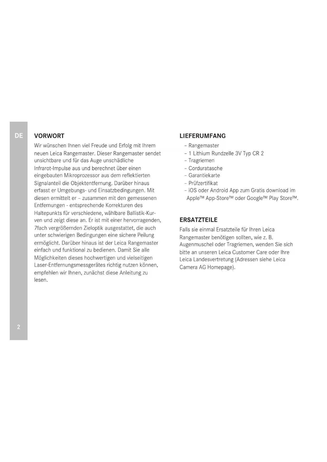 LIEFERUMFANG – Rangemaster – 1 Lithium Rundzelle 3V Typ CR 2 – Tragriemen – Corduratasche – Garantiekarte – Prüfzertifikat – iOS oder Android App zum Gratis download im Apple™ App-Store™ oder Google™ Play Store™. ERSATZTEILE Falls sie einmal Ersatzteile für Ihren Leica Rangemaster benötigen sollten, wie z.B. Augenmuschel oder Tragriemen, wenden Sie sich bitte an unseren Leica Customer Care oder Ihre Leica Landesvertretung (Adressen siehe Leica Camera AG Homepage). VORWORT Wir wünschen Ihnen viel Freude und Erfolg mit Ihrem neuen Leica Rangemaster. Dieser Rangemaster sendet unsichtbare und für das Auge unschädliche Infrarot-Impulse aus und berechnet über einen eingebauten Mikroprozessor aus dem reflektierten Signalanteil die Objektentfernung. Darüber hinaus erfasst er Umgebungs- und Einsatzbedingungen. Mit diesen ermittelt er – zusammen mit den gemessenen Entfernungen - entsprechende Korrekturen des Haltepunkts für verschiedene, wählbare Ballistik-Kur- ven und zeigt diese an. Er ist mit einer hervorragenden, 7fach vergrößernden Zieloptik ausgestattet, die auch unter schwierigen Bedingungen eine sichere Peilung ermöglicht. Darüber hinaus ist der Leica Rangemaster einfach und funktional zu bedienen. Damit Sie alle Möglichkeiten dieses hochwertigen und vielseitigen Laser-Entfernungsmessgerätes richtig nutzen können, empfehlen wir Ihnen, zunächst diese Anleitung zu lesen.DE