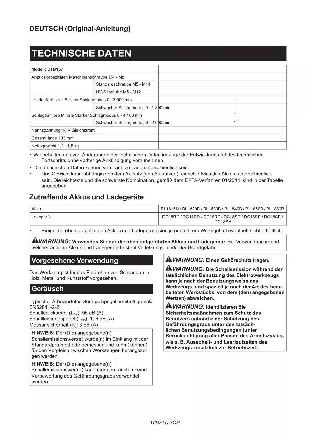 - EinigederobenaufgelistetenAkkusundLadegerätesindjenachIhremWohngebieteventuellnichterhältlich. WARNUNG: Verwenden Sie nur die oben aufgeführten Akkus und Ladegeräte. Bei Verwendung irgend- welcher anderer Akkus und Ladegeräte besteht Verletzungs- und/oder Brandgefahr. Vorgesehene Verwendung Das Werkzeug ist für das Eindrehen von Schrauben in Holz,MetallundKunststovorgesehen. Geräusch TypischerA-bewerteterGeräuschpegelermitteltgemäß EN62841-2-2: Schalldruckpegel(L