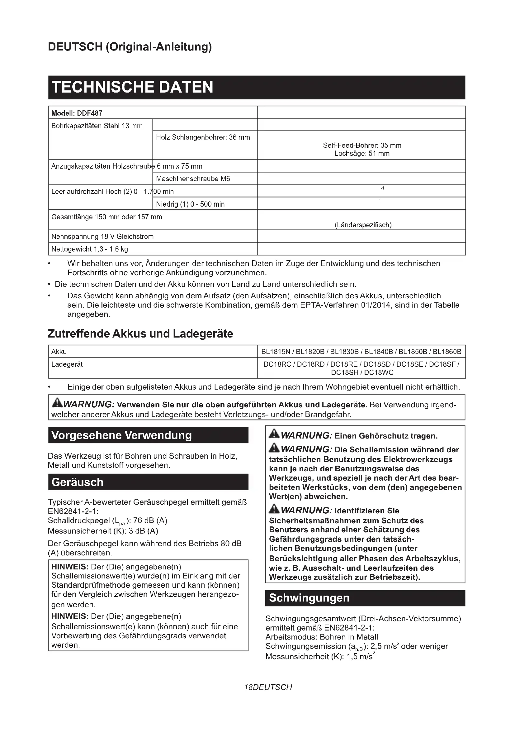 - Das Gewicht kann abhängig von dem Aufsatz (den Aufsätzen), einschließlich des Akkus, unterschiedlich sein. Die leichteste und die schwerste Kombination, gemäß dem EPTA-Verfahren 01/2014, sind in der Tabelle angegeben. Zutreende Akkus und Ladegeräte Akku BL1815N / BL1820B / BL1830B / BL1840B / BL1850B / BL1860B Ladegerät DC18RC / DC18RD / DC18RE / DC18SD / DC18SE / DC18SF / DC18SH / DC18WC