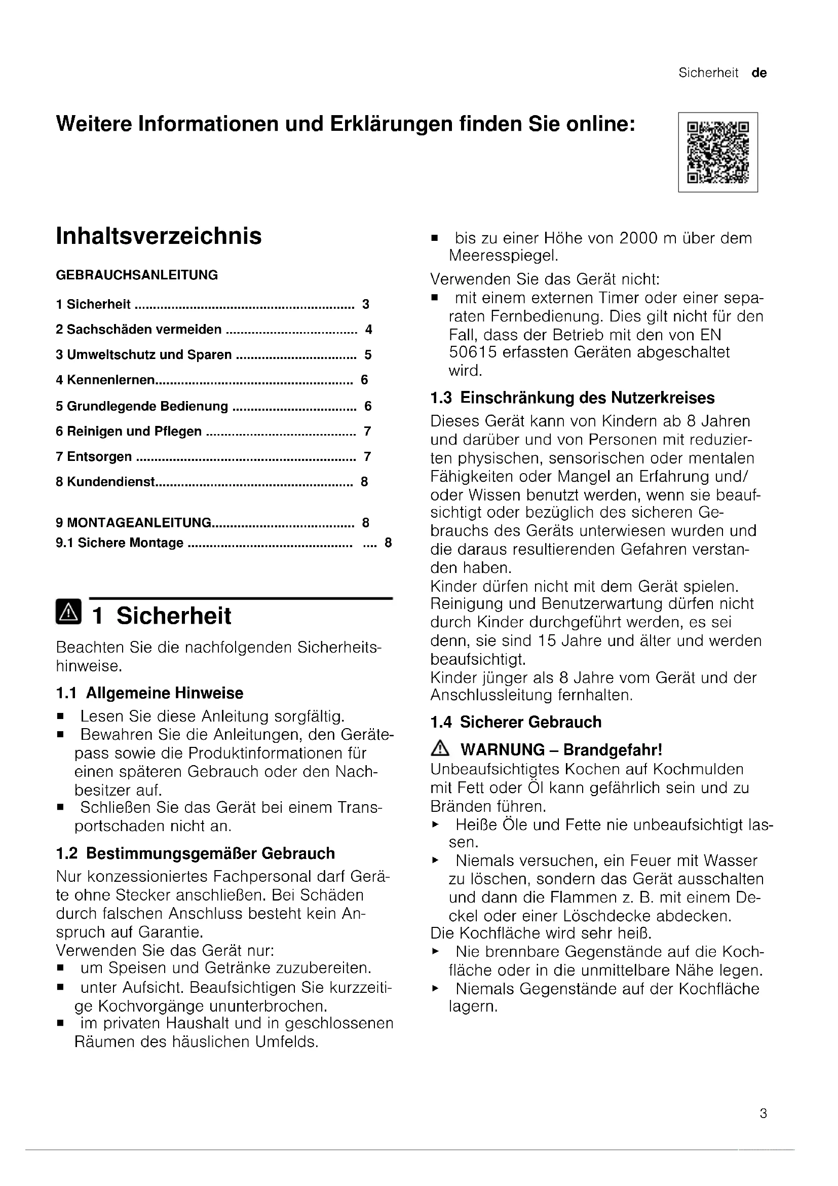 1 Sicherheit Beachten Sie die nachfolgenden Sicherheits- hinweise. 1.1 Allgemeine Hinweise ¡ Lesen Sie diese Anleitung sorgfältig. ¡ Bewahren Sie die Anleitungen, den Geräte- pass sowie die Produktinformationen für einen späteren Gebrauch oder den Nach- besitzer auf. ¡ Schließen Sie das Gerät bei einem Trans- portschaden nicht an. 1.2 Bestimmungsgemäßer Gebrauch Nur konzessioniertes Fachpersonal darf Gerä- te ohne Stecker anschließen. Bei Schäden durch falschen Anschluss besteht kein An- spruch auf Garantie. Verwenden Sie das Gerät nur: ¡ um Speisen und Getränke zuzubereiten. ¡ unter Aufsicht. Beaufsichtigen Sie kurzzeiti- ge Kochvorgänge ununterbrochen. ¡ im privaten Haushalt und in geschlossenen Räumen des häuslichen Umfelds. ¡ bis zu einer Höhe von 2000m über dem Meeresspiegel. Verwenden Sie das Gerät nicht: ¡ mit einem externen Timer oder einer sepa- raten Fernbedienung. Dies gilt nicht für den Fall, dass der Betrieb mit den von EN 50615 erfassten Geräten abgeschaltet wird. 1.3 Einschränkung des Nutzerkreises Dieses Gerät kann von Kindern ab 8 Jahren und darüber und von Personen mit reduzier- ten physischen, sensorischen oder mentalen Fähigkeiten oder Mangel an Erfahrung und/ oder Wissen benutzt werden, wenn sie beauf- sichtigt oder bezüglich des sicheren Ge- brauchs des Geräts unterwiesen wurden und die daraus resultierenden Gefahren verstan- den haben. Kinder dürfen nicht mit dem Gerät spielen. Reinigung und Benutzerwartung dürfen nicht durch Kinder durchgeführt werden, es sei denn, sie sind 15 Jahre und älter und werden beaufsichtigt. Kinder jünger als 8 Jahre vom Gerät und der Anschlussleitung fernhalten. 1.4 Sicherer Gebrauch WARNUNG‒Brandgefahr! Unbeaufsichtigtes Kochen auf Kochmulden mit Fett oder Öl kann gefährlich sein und zu Bränden führen. ▶ Heiße Öle und Fette nie unbeaufsichtigt las- sen. ▶ Niemals versuchen, ein Feuer mit Wasser zu löschen, sondern das Gerät ausschalten und dann die Flammen z. B. mit einem De- ckel oder einer Löschdecke abdecken. Die Kochfläche wird sehr heiß. ▶ Nie brennbare Gegenstände auf die Koch- fläche oder in die unmittelbare Nähe legen. ▶ Niemals Gegenstände auf der Kochfläche lagern.de Sachschäden vermeiden