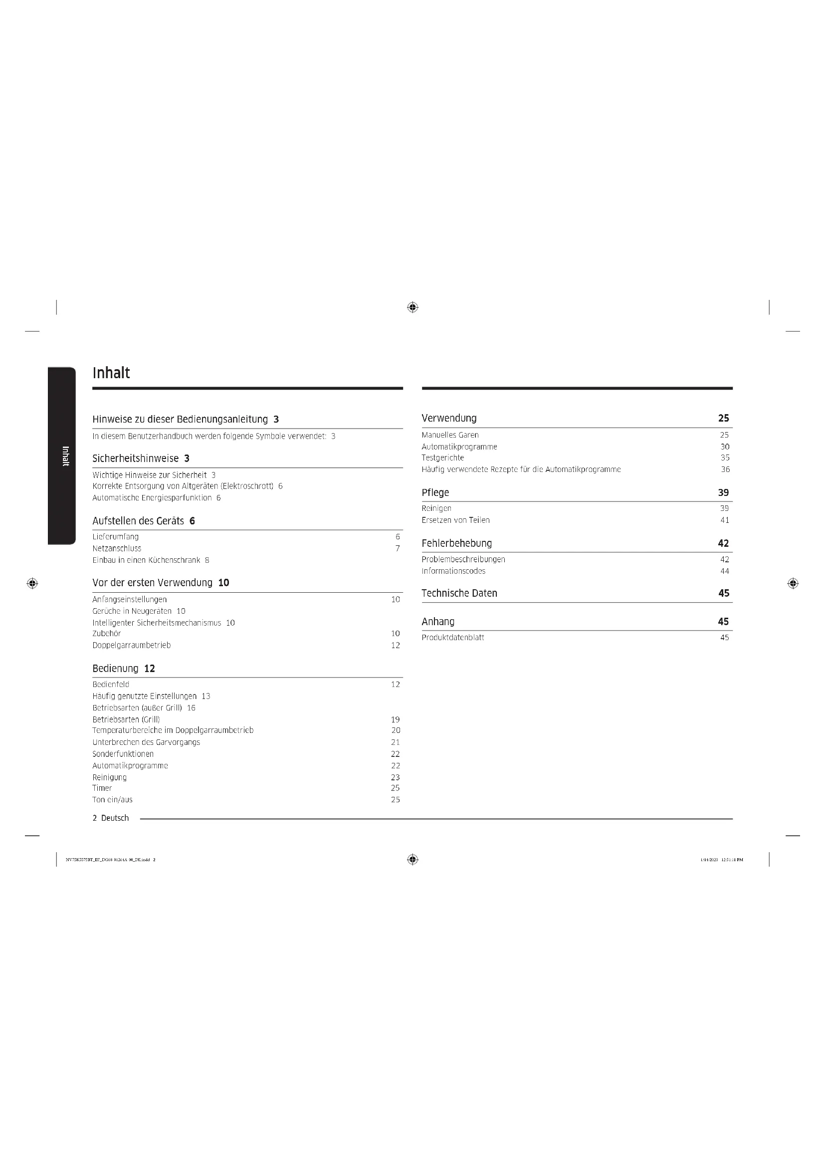 www.samsung.com/be/support (Dutch) www.samsung.com/be_fr/support (French) DENMARK 707 019 70 www.samsung.com/dk/support FINLAND 030-6227 515 www.samsung.com/fi/support FRANCE 01 48 63 00 00 www.samsung.com/fr/support GERMANY 06196 77 555 77 www.samsung.com/de/support ITALIA 800-SAMSUNG (800.7267864) www.samsung.com/it/support CYPRUS 8009 4000 only from landline, toll free www.samsung.com/gr/support GREECE 80111-SAMSUNG (80111 726 7864) only from land line (+30) 210 6897691 from mobile and land line www.samsung.com/gr/support LUXEMBURG 261 03 710 www.samsung.com/be_fr/support NETHERLANDS 088 90 90 100 www.samsung.com/nl/support NORWAY 21629099 www.samsung.com/no/support PORTUGAL 808 207 267 www.samsung.com/pt/support SPAIN 91 175 00 15 www.samsung.com/es/support SWEDEN 0771 726 786 www.samsung.com/se/support SWITZERLAND 0800 726 786 (0800-SAMSUNG) www.samsung.com/ch/support (German) www.samsung.com/ch_fr/support (French) UK 0330 SAMSUNG (7267864) www.samsung.com/uk/support IRELAND (EIRE) 0818 717100 www.samsung.com/ie/support DG68-01264A-00 NV75K5575BT_EF_DG68-01264A-00_NL.indd 48 1/14/2020 12:55:26 PMEinbaubackofen Benutzer- und Installationshandbuch NV75K5571** / NV75M5572** / NV75K5575** NV75K5575BT_EF_DG68-01264A-00_DE.indd 1 1/14/2020 12:51:11 PM2 Deutsch Inhalt Inhalt Hinweise zu dieser Bedienungsanleitung 3 In diesem Benutzerhandbuch werden folgende Symbole verwendet: 3 Sicherheitshinweise 3 Wichtige Hinweise zur Sicherheit 3 Korrekte Entsorgung von Altgeräten (Elektroschrott) 6 Automatische Energiesparfunktion 6 Aufstellen des Geräts 6 Lieferumfang 6 Netzanschluss 7 Einbau in einen Küchenschrank 8 Vor der ersten Verwendung 10 Anfangseinstellungen 10 Gerüche in Neugeräten 10 Intelligenter Sicherheitsmechanismus 10 Zubehör 10 Doppelgarraumbetrieb 12 Bedienung 12 Bedienfeld 12 Häufig genutzte Einstellungen 13 Betriebsarten (außer Grill) 16 Betriebsarten (Grill) 19 Temperaturbereiche im Doppelgarraumbetrieb 20 Unterbrechen des Garvorgangs 21 Sonderfunktionen 22 Automatikprogramme 22 Reinigung 23 Timer 25 Ton ein/aus 25 Verwendung 25 Manuelles Garen 25 Automatikprogramme 30 Testgerichte 35 Häufig verwendete Rezepte für die Automatikprogramme 36 Pflege 39 Reinigen 39 Ersetzen von Teilen 41 Fehlerbehebung 42 Problembeschreibungen 42 Informationscodes 44 Technische Daten 45 Anhang 45 Produktdatenblatt 45 NV75K5575BT_EF_DG68-01264A-00_DE.indd 2 1/14/2020 12:51:11 PMDeutsch 3 Hinweise zu dieser Bedienungsanleitung Hinweise zu dieser Bedienungsanleitung Vielen Dank, dass Sie sich für einen Einbaubackofen von SAMSUNG entschieden haben. Dieses Handbuch enthält wichtige Informationen zur Sicherheit und Anweisungen, die Ihnen helfen sollen, Ihr Gerät zu bedienen und zu pflegen. Bitte nehmen Sie sich vor der Inbetriebnahme Ihres Geräts Zeit, um dieses Handbuch zu lesen und halten Sie es zur späteren Nutzung bereit. In diesem Benutzerhandbuch werden folgende Symbole verwendet: WARNUNG Gefährliche bzw. unsichere Praktiken, die zu schweren Verletzungen, Tod und/oder Sachschäden führen können. VORSICHT Gefährliche bzw. unsichere Praktiken, die zu Verletzungen und/oder Sachschäden führen können. HINWEIS Nützliche Tipps, Empfehlungen oder Informationen, die Ihnen den Umgang mit dem Gerät erleichtern. Sicherheitshinweise Die Installation dieses Geräts darf nur von einem zugelassenen Elektriker durchgeführt werden. Der Installateur ist dafür verantwortlich, das Gerät an das Stromnetz anzuschließen und dabei die relevanten Sicherheitsbestimmungen zu beachten. Wichtige Hinweise zur Sicherheit WARNUNG Dieses Gerät ist nicht zur Verwendung durch Personen (einschließlich Kindern) mit verringerten körperlichen, sensorischen oder mentalen Fähigkeiten oder einem Mangel an Erfahrung und Wissen bestimmt, sofern sie nicht von einer für ihre Sicherheit verantwortlichen Person im Umgang mit dem Gerät unterwiesen wurden und von dieser beaufsichtigt werden. Kinder müssen beaufsichtigt werden, um zu verhindern, dass sie mit dem Gerät spielen. Die Trennungsvorrichtungen sind entsprechend den Anschlussvorschriften in die fest verlegte Leitung einzubauen. Das Gerät muss so aufgestellt werden, dass es auch nach der Installation vom Netz getrennt werden kann. Dies kann erreicht werden, indem der Stecker stets zugänglich bleibt oder in die fest verlegte Leitung ein den Anschlussvorschriften entsprechender Schalter eingebaut wird. Falls das Netzkabel beschädigt ist, muss es vom Hersteller oder vom Kundendienst bzw. von einer entsprechend qualifizierten Fachkraft ausgetauscht werden, um Gefährdungen auszuschließen. NV75K5575BT_EF_DG68-01264A-00_DE.indd 3 1/14/2020 12:51:12 PM4 Deutsch Sicherheitshinweise Sicherheitshinweise Bei der angegebenen Befestigungsart dürfen keine Klebemittel eingesetzt werden, da sie keinen ausreichenden Halt bieten. Dieses Gerät darf von Kindern ab 8 Jahren und Personen mit verminderten körperlichen, sensorischen oder geistigen Fähigkeiten oder einem Mangel an Erfahrung und Wissen bedient werden, wenn sie unter Aufsicht stehen oder eine Unterweisung zum sicheren Umgang mit dem Gerät erhalten haben und die damit verbundenen Gefahren verstehen. Kinder dürfen nicht mit dem Gerät spielen. Kinder dürfen bei Reinigung und Wartung nur dann helfen, wenn sie dabei beaufsichtigt werden. Halten Sie das Gerät und das Netzkabel außerhalb der Reichweite von Kindern unter 8 Jahren. Das Gerät erhitzt sich im Betrieb. Es ist Vorsicht geboten, damit Sie die Heizelemente im Innern des Geräts nicht berühren. WARNUNG: Zugängliche Teile können sich im Betrieb erwärmen. Halten Sie Kinder deshalb fern. Benutzen Sie keine scharfen Scheuermittel oder Metallschaber, um den Glaseinsatz der Gerätetür zu reinigen. Sie könnten die Oberfläche zerkratzen und damit das Glas zerbrechen lassen. Wenn dieses Gerät über eine Reinigungsfunktion verfügt, müssen Sie überschüssiges Wasser und Kochutensilien vor Verwendung der Dampf- oder Selbstreinigung aus dem Gerät entfern
