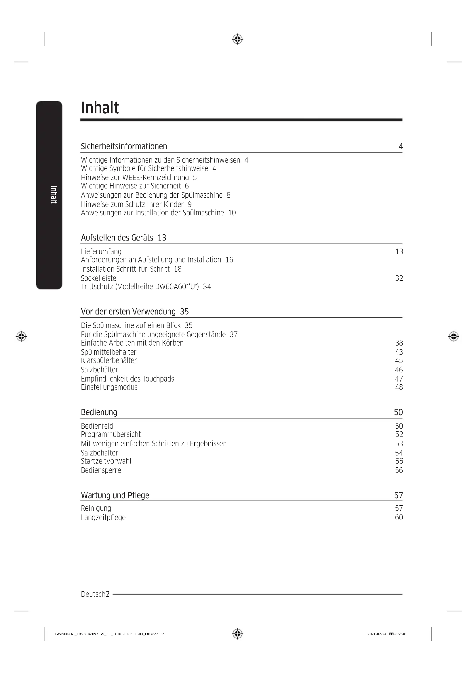 Spülmaschine Benutzerhandbuch DW60A609*/DW60A608* Series DW6500AM_DW60A6092FW_ET_DD81-04050D-00_DE.indd 1 2021-02-24 4:36:40Deutsch2 Inhalt Inhalt Sicherheitsinformationen 4 Wichtige Informationen zu den Sicherheitshinweisen 4 Wichtige Symbole für Sicherheitshinweise 4 Hinweise zur WEEE-Kennzeichnung 5 Wichtige Hinweise zur Sicherheit 6 Anweisungen zur Bedienung der Spülmaschine 8 Hinweise zum Schutz Ihrer Kinder 9 Anweisungen zur Installation der Spülmaschine 10 Aufstellen des Geräts 13 Lieferumfang 13 Anforderungen an Aufstellung und Installation 16 Installation Schritt-für-Schritt 18 Sockelleiste 32 Trittschutz (Modellreihe DW60A60**U*) 34 Vor der ersten Verwendung 35 Die Spülmaschine auf einen Blick 35 Für die Spülmaschine ungeeignete Gegenstände 37 Einfache Arbeiten mit den Körben 38 Spülmittelbehälter 43 Klarspülerbehälter 45 Salzbehälter 46 Empndlichkeit des Touchpads 47 Einstellungsmodus 48 Bedienung 50 Bedienfeld 50 Programmübersicht 52 Mit wenigen einfachen Schritten zu Ergebnissen 53 Salzbehälter 54 Startzeitvorwahl 56 Bediensperre 56 Wartung und Pege 57 Reinigung 57 Langzeitpege 60 DW6500AM_DW60A6092FW_ET_DD81-04050D-00_DE.indd 2 2021-02-24 4:36:40Deutsch 3 Inhalt Fehlerbehebung 61 Prüfpunkte 61 Informationscodes 64 Programmübersicht 65 Anhang 67 Transport/Umzug 67 Schutz vor Frost 67 Entsorgung der Spülmaschine und Umweltschutz 67 Tipp zum Energie- und Wassersparen 68 Technische Daten 69 Für Standardtest 70 DW6500AM_DW60A6092FW_ET_DD81-04050D-00_DE.indd 3 2021-02-24 4:36:40Deutsch4 Sicherheitsinformationen Sicherheitsinformationen Wir freuen uns, dass Sie sich für eine neue Spülmaschine von Samsung entschieden haben. Dieses Handbuch enthält wichtige Informationen bezüglich des Anschlusses, der Verwendung und der Pege Ihres neuen Geräts. Nehmen Sie sich bitte etwas Zeit, um dieses Handbuch zu lesen, denn nur so können Sie die vielen Vorteile und Funktionen Ihrer Spülmaschine voll nutzen. Wichtige Informationen zu den Sicherheitshinweisen Bitte lesen Sie dieses Handbuch sorgfältig durch, damit sichergestellt ist, dass Sie die umfangreichen Produktmerkmale und Funktionen Ihres neuen Geräts sicher und efzient einsetzen können. Bewahren Sie das Handbuch an einem sicheren Platz in der Nähe des Geräts auf, damit Sie auch in Zukunft schnell darauf zurückgreifen können. Verwenden Sie das Gerät nur zu den in diesem Benutzerhandbuch beschriebenen Zwecken. Die Warnungen und wichtigen Sicherheitshinweise dieses Handbuchs decken nicht alle denkbaren Umstände und Situationen ab. Lassen Sie den gesunden Menschenverstand, Vorsicht und die notwendige Sorgfalt nicht außer Acht, wenn Sie Ihre Spülmaschine installieren, warten und einsetzen. Da die folgenden Hinweise zum Betrieb für verschiedene Modelle gelten, können die Eigenschaften Ihrer Spülmaschine sich leicht von den in diesem Handbuch beschriebenen unterscheiden, und es kann sein, dass nicht alle Warnhinweise zutreffen. Bei Fragen oder Problemen wenden Sie sich an Ihr nächstgelegenes Kundendienstzentrum, oder holen Sie sich Hilfe und Informationen online unter „www. samsung.com“. Wichtige Symbole für Sicherheitshinweise Bedeutung der Symbole und Zeichen in diesem Benutzerhandbuch: WARNUNG Gefährliche bzw. unsichere Praktiken, die zu schweren Verletzungen, Tod und/oder Sachschäden führen können. VORSICHT Gefährliche bzw. unsichere Praktiken, die zu Verletzungen und/oder Sachschäden führen können. HINWEIS Dieses Symbol weist darauf hin, dass die Gefahr von Personen- oder Sachschäden besteht. Die folgenden Warnhinweise sollen Sie und andere vor Verletzungen schützen. Befolgen Sie die Hinweise genau. Bewahren Sie diese Anweisungen an einem sicheren Ort auf und stellen Sie sicher, dass neue Benutzer mit dem Inhalt vertraut sind. Geben Sie sie an zukünftige Besitzer weiter. DW6500AM_DW60A6092FW_ET_DD81-04050D-00_DE.indd 4 2021-02-24 4:36:40Deutsch 5 Sicherheitsinformationen Hinweise zur WEEE-Kennzeichnung Korrekte Entsorgung von Altgeräten (Elektroschrott) (Gilt für Länder mit Abfalltrennsystemen) Die Kennzeichnung auf dem Produkt, Zubehörteilen bzw. auf der dazugehörigen Dokumentation gibt an, dass das Produkt und Zubehörteile (z. B. Ladegerät, Kopfhörer, USB-Kabel) nach ihrer Lebensdauer nicht zusammen mit dem normalen Haushaltsmüll entsorgt werden dürfen. Entsorgen Sie dieses Gerät und Zubehörteile bitte getrennt von anderen Abfällen, um der Umwelt bzw. der menschlichen Gesundheit nicht durch unkontrollierte Müllbeseitigung zu schaden. Helfen Sie mit, das Altgerät und Zubehörteile fachgerecht zu entsorgen, um die nachhaltige Wiederverwertung von stofichen Ressourcen zu fördern. Private Nutzer wenden sich an den Händler, bei dem das Produkt gekauft wurde, oder kontaktieren die zuständigen Behörden, um in Erfahrung zu bringen, wo Sie das Altgerät bzw. Zubehörteile für eine umweltfreundliche Entsorgung abgeben können. Gewerbliche Nutzer wenden sich an ihren Lieferanten und gehen nach den Bedingungen des Verkaufsvertrags vor. Dieses Produkt und elektronische Zubehörteile dürfen nicht zusammen mit anderem Gewerbemüll entsorgt werden. Weitere Informationen zum Engagement von Samsung für die Umwelt und zu den aufsichtsrechtlichen Bestimmungen für bestimmte Produkte wie z. B. REACH, WEEE oder Batterien, nden Sie unter Samsung.com auf der Seite, auf der wir uns mit Nachhaltigkeitsfragen beschäftigen. DW6500AM_DW60A6092FW_ET_DD81-04050D-00_DE.indd 5 2021-02-24 4:36:40Deutsch6 Sicherheitsinformationen Sicherheitsinformationen Wichtige Hinweise zur Sicherheit Beachten Sie bei Verwendung des Geräts die folgenden grundlegenden Sicherheitshinweise, um die Gefahr von Bränden, Stromschlägen oder Verletzungen zu verringern: