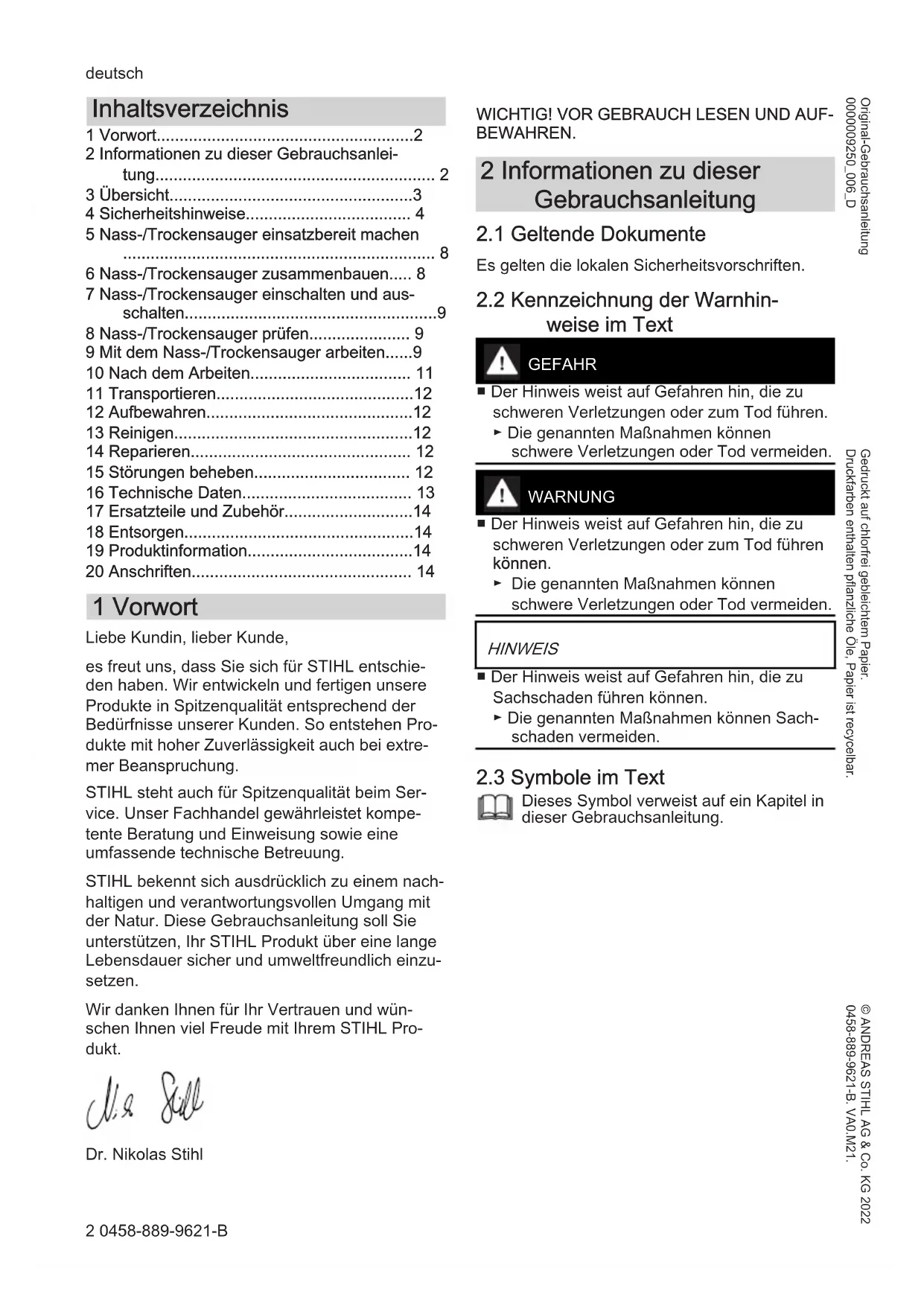 - 20 Anschriften 1 Vorwort Liebe Kundin, lieber Kunde, es freut uns, dass Sie sich für STIHL entschie‐ den haben. Wir entwickeln und fertigen unsere Produkte in Spitzenqualität entsprechend der Bedürfnisse unserer Kunden. So entstehen Pro‐ dukte mit hoher Zuverlässigkeit auch bei extre‐ mer Beanspruchung. STIHL steht auch für Spitzenqualität beim Ser‐ vice. Unser Fachhandel gewährleistet kompe‐ tente Beratung und Einweisung sowie eine umfassende technische Betreuung. STIHL bekennt sich ausdrücklich zu einem nach‐ haltigen und verantwortungsvollen Umgang mit der Natur. Diese Gebrauchsanleitung soll Sie unterstützen, Ihr STIHL Produkt über eine lange Lebensdauer sicher und umweltfreundlich einzu‐ setzen. Wir danken Ihnen für Ihr Vertrauen und wün‐ schen Ihnen viel Freude mit Ihrem STIHL Pro‐ dukt. Dr. Nikolas Stihl p. 14
