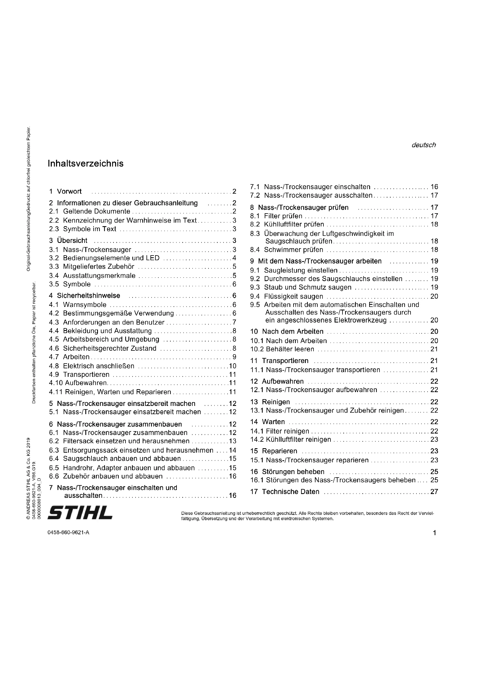 deutsch 15 Reparieren ► Falls der Nass-/Trockensauger oder das Zubehör beschädigt sind: Nass-/Trockensauger oder das Zubehör nicht verwenden und einen STIHL Fachhändler aufsuchen.0458-660-9621-A