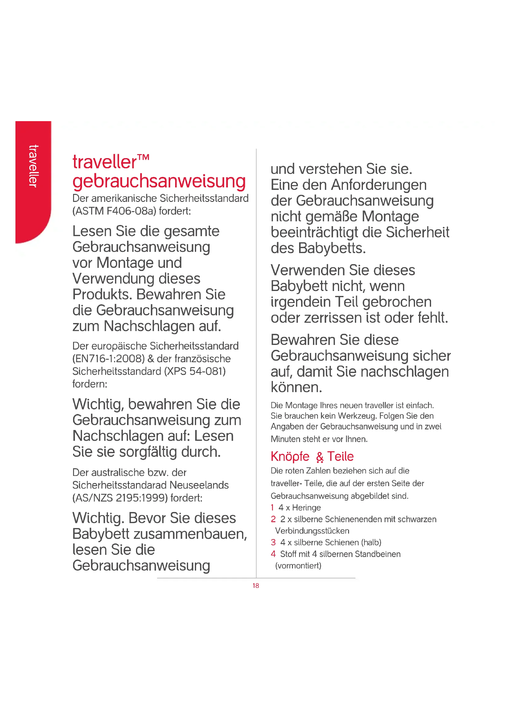 - réduire la hauteur des cotés du lit et faciliter la chute de l’enfant en dehors du lit. Veillez à ne rien laisser dans le lit (comme un jouet par exemple) qui pourrait servir de marchepied à l’enfant. N’utilisez pas le lit pliant à proximité d’une source importante de chaleur comme une flamme, un radiateur, d’un appareil de cuisson etc… Veillez à garder le lit éloigné de toute corde, cordelette, lien. Veillez à conserver les médicaments et les petits objets loin du lit afin d’éviter les risques d’étouffement. l’épaisseur du matelas a été spéciale- ment étudiée afin que la distance entre le matelas et le haut des cotés soit au moins de 500mm. Cette distance per- met de limiter les risques de chute de l’enfant en dehors du lit. AVERTISSEMENTS La norme de sécurité Canadienne (CRC c.932) stipule : ATTENTION ATTENTIONtraveller traveller gebrauchsanweisung Der amerikanische Sicherheitsstandard (ASTM F406-08a) fordert: Lesen Sie die gesamte Gebrauchsanweisung vor Montage und Verwendung dieses Produkts. Bewahren Sie die Gebrauchsanweisung zum Nachschlagen auf. Der europäische Sicherheitsstandard (EN716-1:2008) & der französische Sicherheitsstandard (XPS 54-081) fordern: Wichtig, bewahren Sie die Gebrauchsanweisung zum Nachschlagen auf: Lesen Sie sie sorgfältig durch. Der australische bzw. der Sicherheitsstandarad Neuseelands (AS/NZS 2195:1999) fordert: Wichtig. Bevor Sie dieses Babybett zusammenbauen, lesen Sie die Gebrauchsanweisung und verstehen Sie sie. Eine den Anforderungen der Gebrauchsanweisung nicht gemäße Montage beeinträchtigt die Sicherheit des Babybetts. Verwenden Sie dieses Babybett nicht, wenn irgendein Teil gebrochen oder zerrissen ist oder fehlt. Bewahren Sie diese Gebrauchsanweisung sicher auf, damit Sie nachschlagen können. Die Montage Ihres neuen traveller ist einfach. Sie brauchen kein Werkzeug. Folgen Sie den Angaben der Gebrauchsanweisung und in zwei Minuten steht er vor Ihnen. Knöpfe ~ Teile Die roten Zahlen beziehen sich auf die traveller- Teile, die auf der ersten Seite der Gebrauchsanweisung abgebildet sind. 1 4 x Heringe 2 2 x silberne Schienenenden mit schwarzen Verbindungsstücken 3 4 x silberne Schienen (halb) 4 Stoff mit 4 silbernen Standbeinen (vormontiert) 18deutsch 5 4 x Füße (vormontiert an Standbeinen und Gewebe) 6 Befestigungsknöpfe aus Plastik 7 elastische Schlaufe 8 Luftmatratze (selbstaufblasend) 9 Tragetasche selbstverständlich ~ sicher Dieses Produkt entspricht folgenden Sicherheitsstandards: