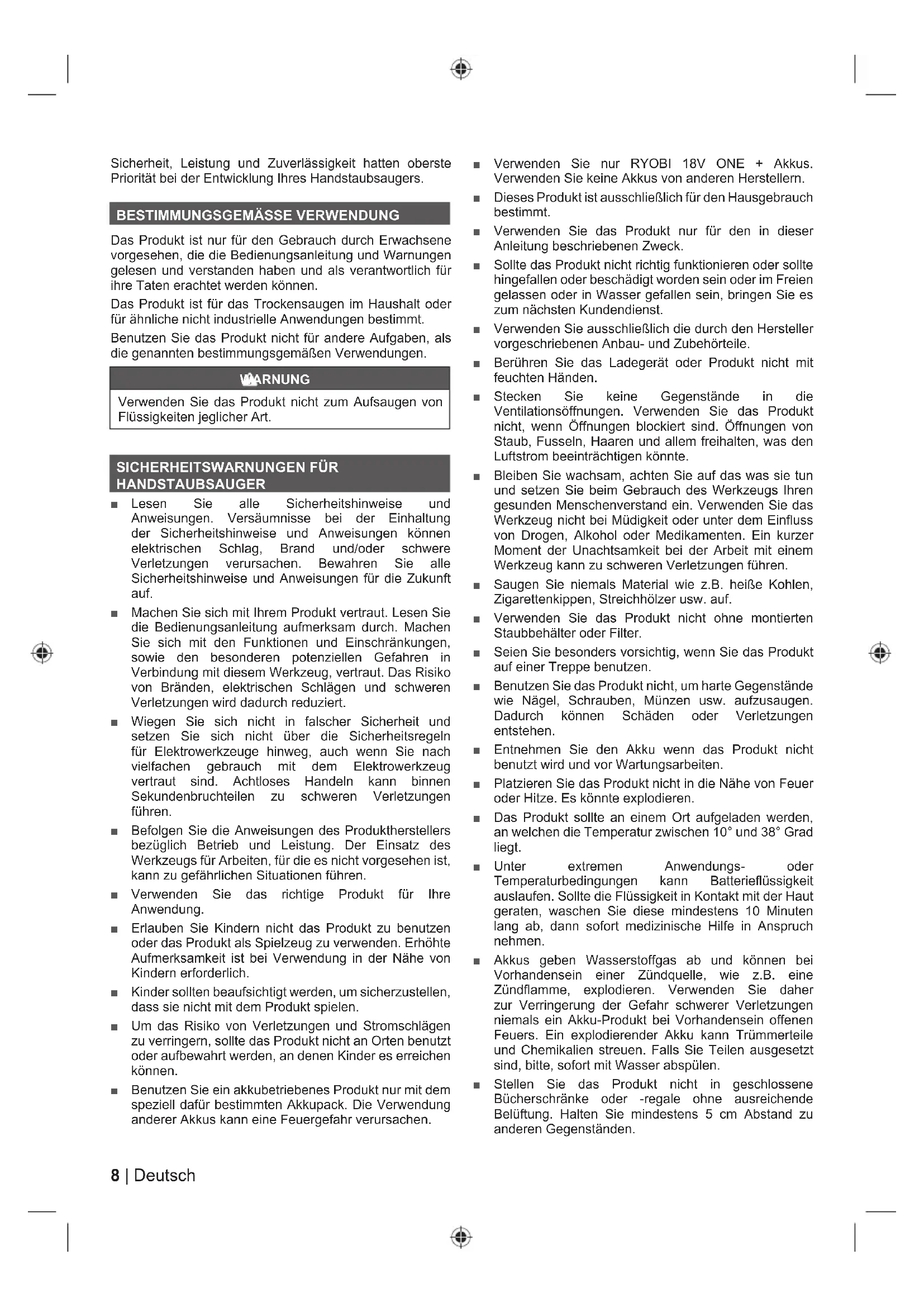 Das Produkt ist nur für den Gebrauch durch Erwachsene vorgesehen, die die Bedienungsanleitung und Warnungen gelesen und verstanden haben und als verantwortlich für ihre Taten erachtet werden können. Das Produkt ist für das Trockensaugen im Haushalt oder für ähnliche nicht industrielle Anwendungen bestimmt. Benutzen Sie das Produkt nicht für andere Aufgaben, als die genannten bestimmungsgemäßen Verwendungen. WARNUNG Verwenden Sie das Produkt nicht zum Aufsaugen von Flüssigkeiten jeglicher Art.