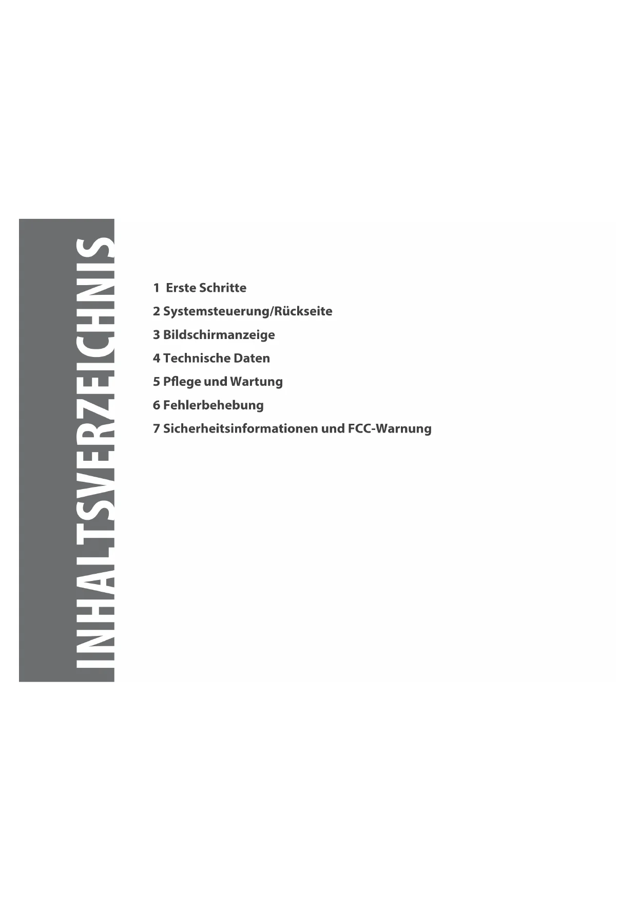 L27ADS 27Zoll Full-HD Widescreen LED MonitorINHALTSVERZEICHNIS 1 Erste Schritte 2 Systemsteuerung/Rückseite 3 Bildschirmanzeige 4 Technische Daten 5 Pege und Wartung 6 Fehlerbehebung 7 Sicherheitsinformationen und FCC-Warnung1 ERSTE SCHRITTE Paket beinhaltet: