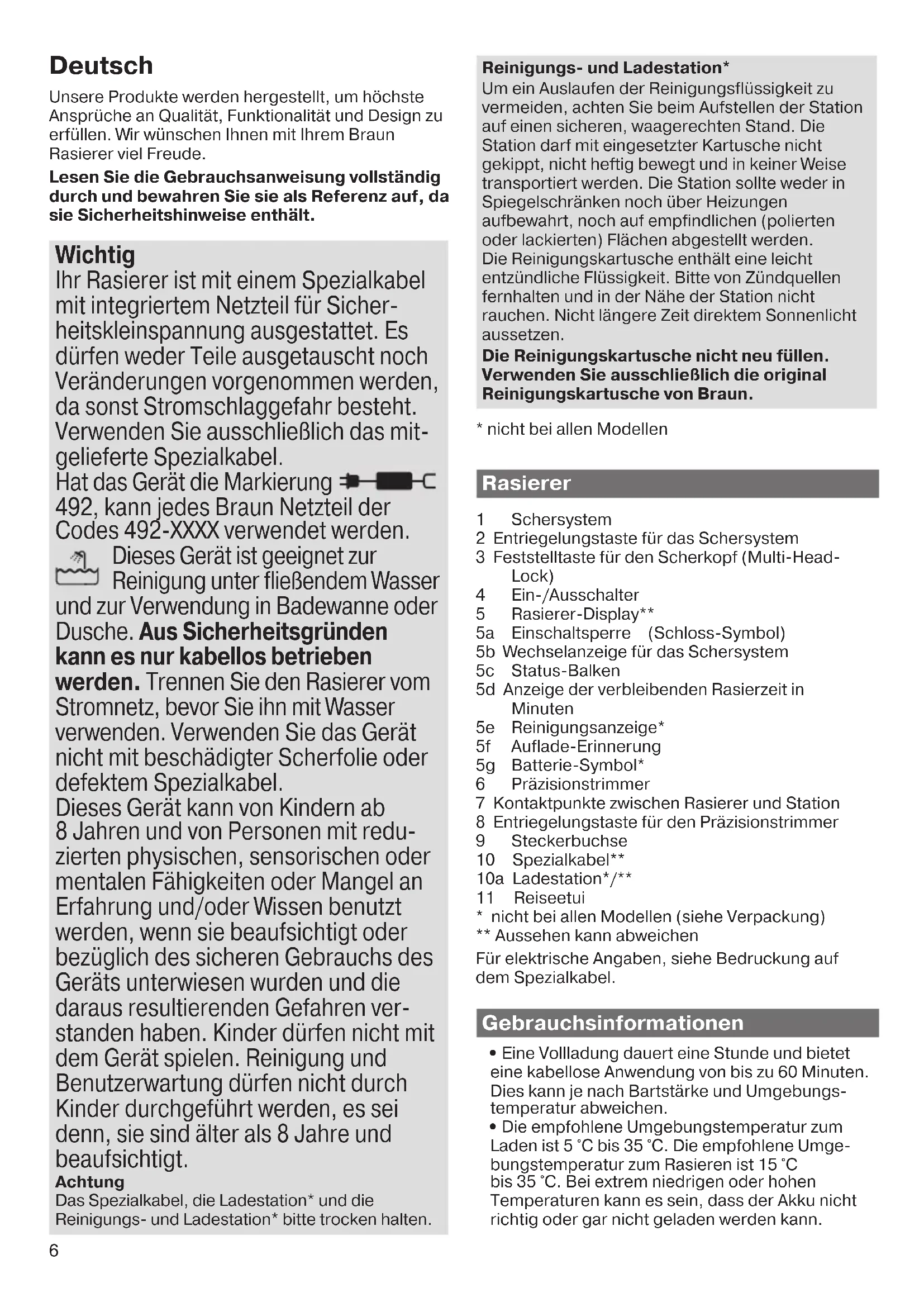 91611492_93XXcc_W&D_MN_Type_5793_S5.indd 191611492_93XXcc_W&D_MN_Type_5793_S5.indd 1 25.09.17 11:2725.09.17 11:27 CSS APPROVED Effective Date 23Oct2017 GMT - Printed 22Nov2017 Page 5 of 766 Deutsch Unsere Produkte werden hergestellt, um höchste Ansprüche an Qualität, Funktionalität und Design zu erfüllen. Wir wünschen Ihnen mit Ihrem Braun Rasierer viel Freude. Lesen Sie die Gebrauchsanweisung vollständig durch und bewahren Sie sie als Referenz auf, da sie Sicherheitshinweise enthält. Wichtig Ihr Rasierer ist mit einem Spezialkabel mit integriertem Netzteil für Sicher- heitskleinspannung ausgestattet. Es dürfen weder Teile ausgetauscht noch Veränderungen vorgenommen werden, da sonst Stromschlaggefahr besteht. Verwenden Sie ausschließlich das mit- gelieferte Spezialkabel. Hat das Gerät die Markierung 492, kann jedes Braun Netzteil der Codes 492-XXXX verwendet werden. Dieses Gerät ist geeignet zur Reinigung unter fließendem Wasser und zur Verwendung in Badewanne oder Dusche. Aus Sicherheitsgründen kann es nur kabellos betrieben werden. Trennen Sie den Rasierer vom Stromnetz, bevor Sie ihn mit Wasser verwenden. Verwenden Sie das Gerät nicht mit beschädigter Scherfolie oder defektem Spezialkabel. Dieses Gerät kann von Kindern ab 8 Jahren und von Personen mit redu- zierten physischen, sensorischen oder mentalen Fähigkeiten oder Mangel an Erfahrung und/oder Wissen benutzt werden, wenn sie beaufsichtigt oder bezüglich des sicheren Gebrauchs des Geräts unterwiesen wurden und die daraus resultierenden Gefahren ver- standen haben. Kinder dürfen nicht mit dem Gerät spielen. Reinigung und Benutzerwartung dürfen nicht durch Kinder durchgeführt werden, es sei denn, sie sind älter als 8 Jahre und beaufsichtigt. Achtung Das Spezialkabel, die Ladestation* und die Reinigungs- und Ladestation* bitte trocken halten. Reinigungs- und Ladestation* Um ein Auslaufen der Reinigungsflüssigkeit zu vermeiden, achten Sie beim Aufstellen der Station auf einen sicheren, waagerechten Stand. Die Station darf mit eingesetzter Kartusche nicht gekippt, nicht heftig bewegt und in keiner Weise transportiert werden. Die Station sollte weder in Spiegelschränken noch über Heizungen aufbewahrt, noch auf empfindlichen (polierten oder lackierten) Flächen abgestellt werden. Die Reinigungskartusche enthält eine leicht entzündliche Flüssigkeit. Bitte von Zündquellen fernhalten und in der Nähe der Station nicht rauchen. Nicht längere Zeit direktem Sonnenlicht aussetzen. Die Reinigungskartusche nicht neu füllen. Verwenden Sie ausschließlich die original Reinigungskartusche von Braun.