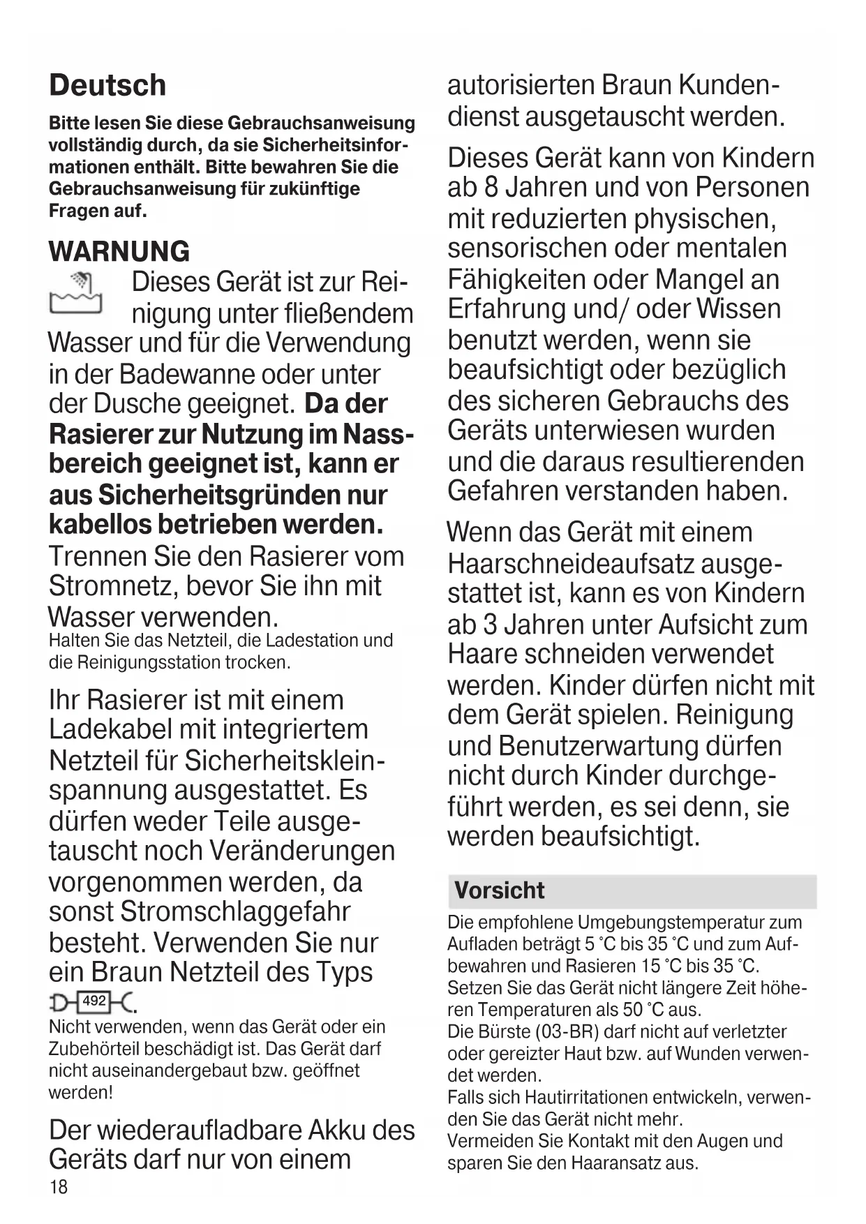 90081363_UI_S7_Shaver+Attachments_EURO+KOREA.indd 1790081363_UI_S7_Shaver+Attachments_EURO+KOREA.indd 17 05.11.21 11:0305.11.21 11:0318 Deutsch Bitte lesen Sie diese Gebrauchsanweisung vollständig durch, da sie Sicherheitsinfor- mationen enthält. Bitte bewahren Sie die Gebrauchsanweisung für zukünftige Fragen auf. WARNUNG Dieses Gerät ist zur Rei- nigung unter fließendem Wasser und für die Verwendung in der Badewanne oder unter der Dusche geeignet. Da der Rasierer zur Nutzung im Nass- bereich geeignet ist, kann er aus Sicherheitsgründen nur kabellos betrieben werden. Trennen Sie den Rasierer vom Stromnetz, bevor Sie ihn mit Wasser verwenden. Halten Sie das Netzteil, die Ladestation und die Reinigungsstation trocken. Ihr Rasierer ist mit einem Ladekabel mit integriertem Netzteil für Sicherheitsklein- spannung ausgestattet. Es dürfen weder Teile ausge- tauscht noch Veränderungen vorgenommen werden, da sonst Stromschlaggefahr besteht. Verwenden Sie nur ein Braun Netzteil des Typs