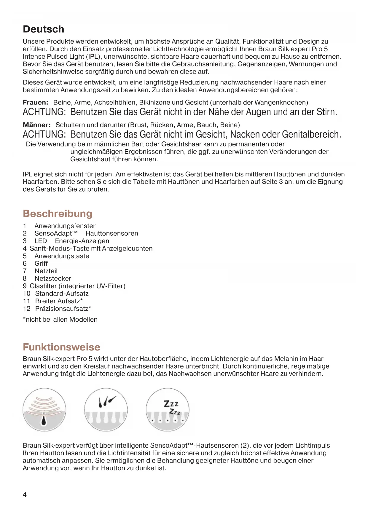 geeignet / suitable / approprié / apto / adequado / adatto / geschikt / egnet / passende / lämplig / sopii nicht geeignet / not suitable / non approprié / uso no apto / não adequado / non adatto / niet geschikt / ikke egnet / ikke passende / inte lämplig / ei sovi käyttöön 91590833_Victoria2_PL5_Euro1.indd 391590833_Victoria2_PL5_Euro1.indd 3 30.10.20 13:4230.10.20 13:424 Deutsch Unsere Produkte werden entwickelt, um höchste Ansprüche an Qualität, Funktionalität und Design zu erfüllen. Durch den Einsatz professioneller Lichttechnologie ermöglicht Ihnen Braun Silk·expert Pro 5 Intense Pulsed Light (IPL), unerwünschte, sichtbare Haare dauerhaft und bequem zu Hause zu entfernen. Bevor Sie das Gerät benutzen, lesen Sie bitte die Gebrauchsanleitung, Gegenanzeigen, Warnungen und Sicherheitshinweise sorgfältig durch und bewahren diese auf. Dieses Gerät wurde entwickelt, um eine langfristige Reduzierung nachwachsender Haare nach einer bestimmten Anwendungszeit zu bewirken. Zu den idealen Anwendungsbereichen gehören: Frauen: Beine, Arme, Achselhöhlen, Bikinizone und Gesicht (unterhalb der Wangenknochen) ACHTUNG: Benutzen Sie das Gerät nicht in der Nähe der Augen und an der Stirn. Männer: Schultern und darunter (Brust, Rücken, Arme, Bauch, Beine) ACHTUNG: Benutzen Sie das Gerät nicht im Gesicht, Nacken oder Genitalbereich. Die Verwendung beim männlichen Bart oder Gesichtshaar kann zu permanenten oder ungleichmäßigen Ergebnissen führen, die ggf. zu unerwünschten Veränderungen der Gesichtshaut führen können. IPL eignet sich nicht für jeden. Am effektivsten ist das Gerät bei hellen bis mittleren Hauttönen und dunklen Haarfarben. Bitte sehen Sie sich die Tabelle mit Hauttönen und Haarfarben auf Seite 3 an, um die Eignung des Geräts für Sie zu prüfen. Beschreibung 1 Anwendungsfenster 2 SensoAdapt™ Hauttonsensoren 3 LED Energie-Anzeigen 4 Sanft-Modus-Taste mit Anzeigeleuchten 5 Anwendungstaste 6 Griff 7 Netzteil 8 Netzstecker 9 Glasfilter (integrierter UV-Filter) 10 Standard-Aufsatz 11 Breiter Aufsatz* 12 Präzisionsaufsatz* *nicht bei allen Modellen Funktionsweise Braun Silk·expert Pro 5 wirkt unter der Hautoberfläche, indem Lichtenergie auf das Melanin im Haar einwirkt und so den Kreislauf nachwachsender Haare unterbricht. Durch kontinuierliche, regelmäßige Anwendung trägt die Lichtenergie dazu bei, das Nachwachsen unerwünschter Haare zu verhindern. Braun Silk·expert verfügt über intelligente SensoAdapt™-Hautsensoren (2), die vor jedem Lichtimpuls Ihren Hautton lesen und die Lichtintensität für eine sichere und zugleich höchst effektive Anwendung automatisch anpassen. Sie ermöglichen die Behandlung geeigneter Hauttöne und beugen einer Anwendung vor, wenn Ihr Hautton zu dunkel ist. 91590833_Victoria2_PL5_Euro1.indd 491590833_Victoria2_PL5_Euro1.indd 4 30.10.20 13:4230.10.20 13:425 Gegenanzeigen Benutzen Sie das Gerät nicht, …