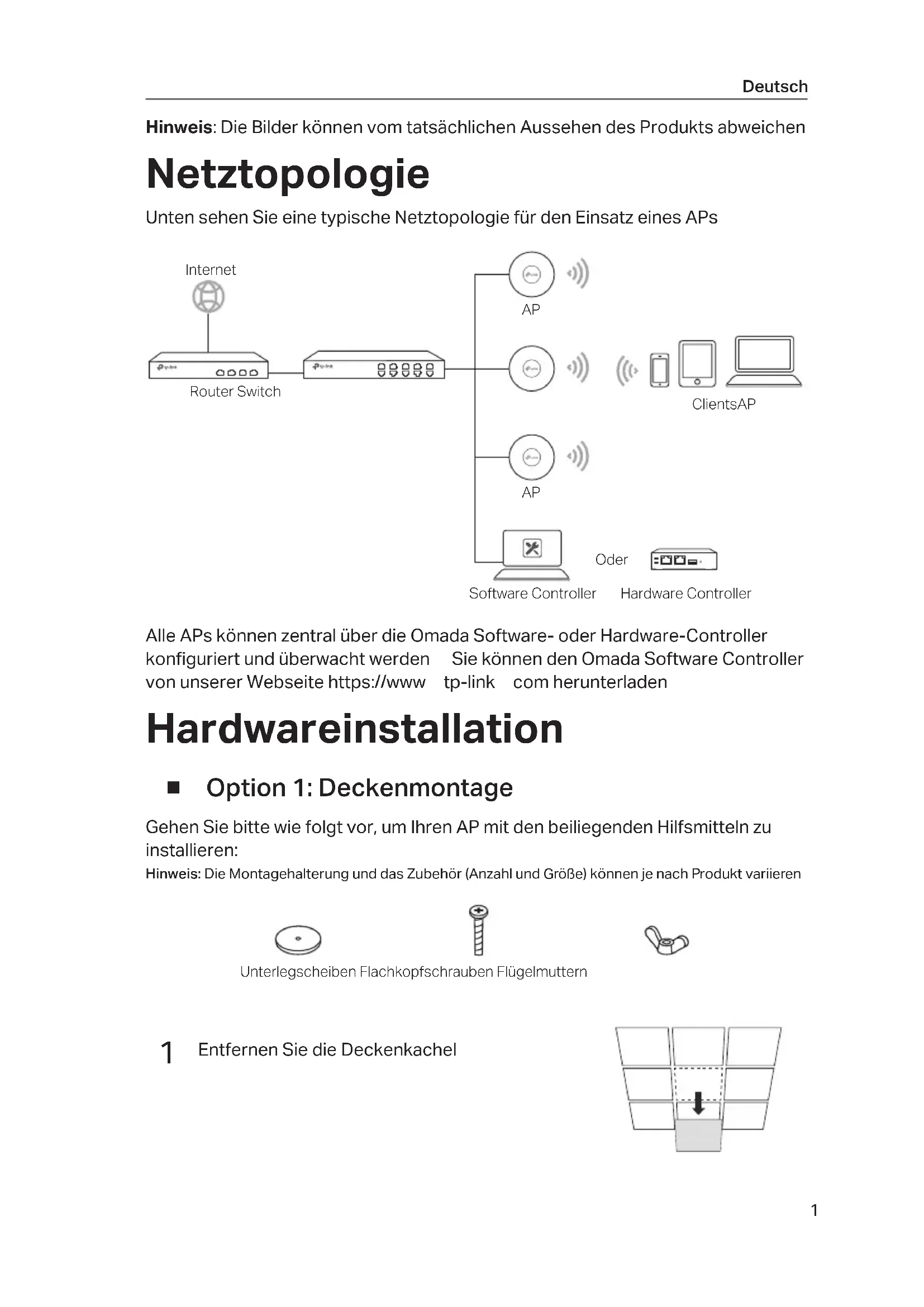 Installation Guide Indoor Access PointCONTENTS Deutsch 01 English 05 Español 09 Eλληνικά 13 Français 17 Italiano 21 Português 25 Suomi 29 Nederlands 33 Svenska 37 Norsk 41 Dansk 451 Deutsch Hinweis: Die Bilder können vom tatsächlichen Aussehen des Produkts abweichen Netztopologie Unten sehen Sie eine typische Netztopologie für den Einsatz eines APs Alle APs können zentral über die Omada Software- oder Hardware-Controller konfiguriert und überwacht werden Sie können den Omada Software Controller von unserer Webseite https://wwwtp-linkcom herunterladen Hardwareinstallation ■ Option 1: Deckenmontage Gehen Sie bitte wie folgt vor, um Ihren AP mit den beiliegenden Hilfsmitteln zu installieren: Hinweis: Die Montagehalterung und das Zubehör (Anzahl und Größe) können je nach Produkt variieren Unterlegscheiben Flachkopfschrauben Flügelmuttern