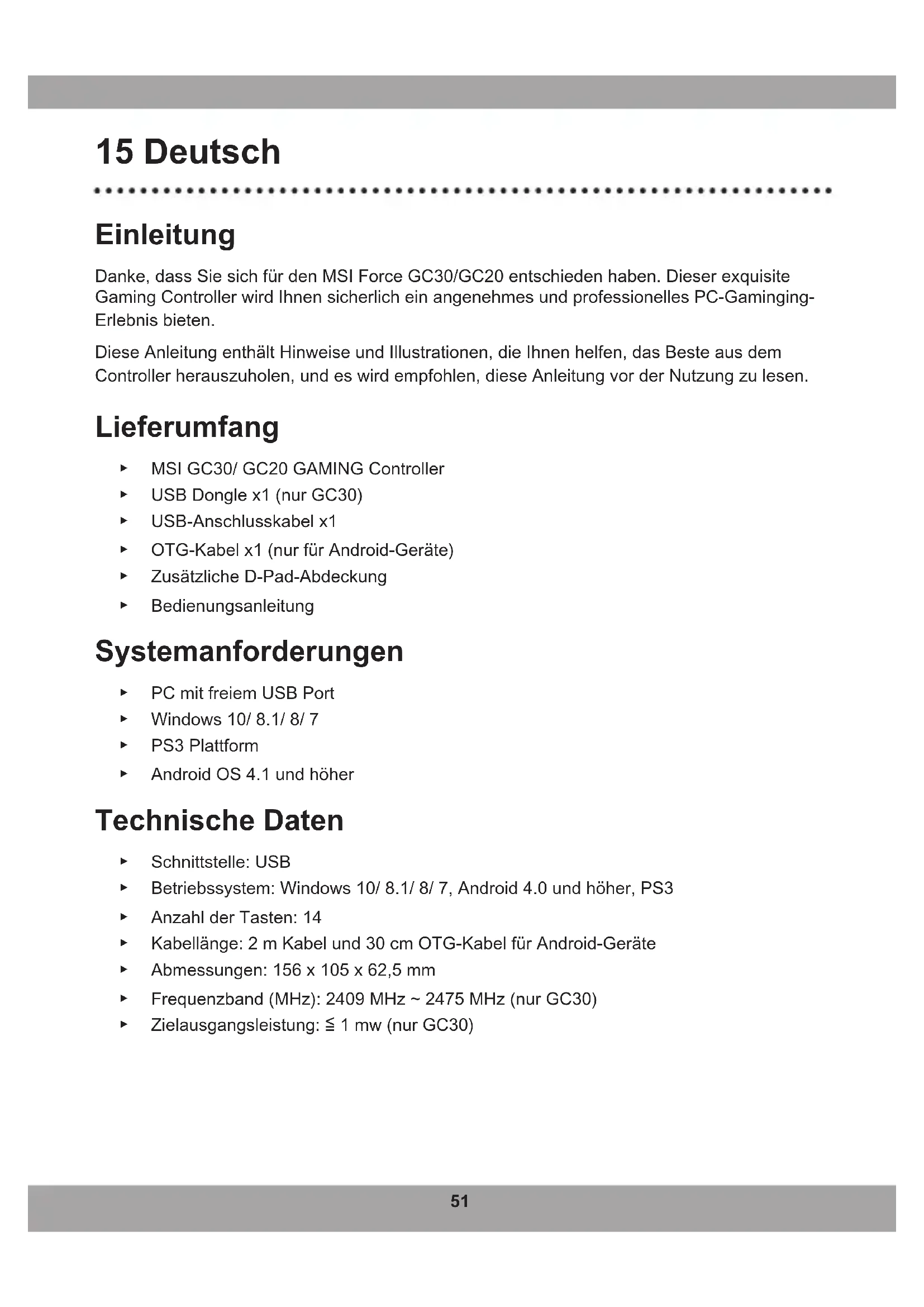 - De derde en vierde Modus LED indicatoren branden als deze modus is geselecteerd.51 15 Deutsch Einleitung Danke,dassSiesichfürdenMSIForceGC30/GC20entschiedenhaben.Dieserexquisite Gaming Controller wird Ihnen sicherlich ein angenehmes und professionelles PC-Gaminging- Erlebnis bieten. Diese Anleitung enthält Hinweise und Illustrationen, die Ihnen helfen, das Beste aus dem Controller herauszuholen, und es wird empfohlen, diese Anleitung vor der Nutzung zu lesen. Lieferumfang ▶ MSI GC30/ GC20 GAMING Controller ▶ USB Dongle x1 (nur GC30) ▶ USB-Anschlusskabel x1 ▶ OTG-Kabelx1(nurfürAndroid-Geräte) ▶ Zusätzliche D-Pad-Abdeckung ▶ Bedienungsanleitung Systemanforderungen ▶ PC mit freiem USB Port ▶ Windows 10/ 8.1/ 8/ 7 ▶ PS3 Plattform ▶ AndroidOS4.1undhöher Technische Daten ▶ Schnittstelle: USB ▶ Betriebssystem:Windows10/8.1/8/7,Android4.0undhöher,PS3 ▶ Anzahl der Tasten: 14 ▶ Kabellänge:2mKabelund30cmOTG-KabelfürAndroid-Geräte ▶ Abmessungen: 156 x 105 x 62,5 mm ▶ Frequenzband (MHz): 2409 MHz ~ 2475 MHz (nur GC30) ▶ Zielausgangsleistung:≦1mw(nurGC30)52 Übersicht