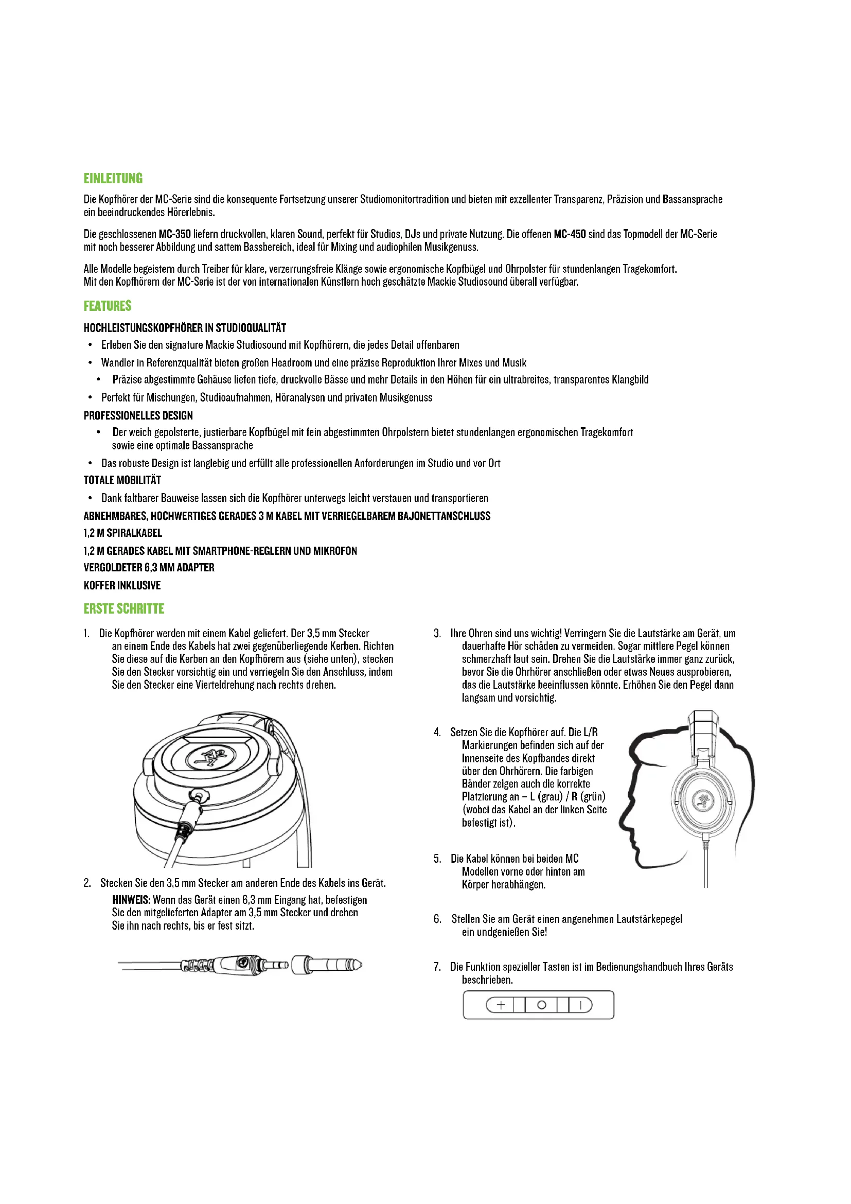 - Unter der Telefonnummer -800-898-32 erreichen Sie unseren technischen Support (Montag bis Freitag zu den üblichen Geschäfszeiten, Pacific Standard Time). Technische Daten MC-350 MC-450 Frequenzgang 20 Hz – 20 kHz Empfindlichkeit 97 dB / mW 101 dB / mW Max. Eingangspegel 20 mW Impedanz 32 Ω 54 Ω Treibertyp Dynamisch Eingangstyp 3,5 mm ou 6,35 mm Stecker, Stereo Ausgangstyp L/R Kopfhörer Kabellänge 117,6 in • 2987 mm 48,0 in • 1219 mm (x2) Gewicht 0,8 lb • 0,4 kg Technische Änderungen und Ergänzungen vorbehalten Diese beschränkte Produktgarantie („Produktgarantie“) wird von LOUD Audio, LLC („LOUD“) gewährt und gilt für Produkte, die in den USA oder Kanada bei einem von LOUD autorisierten Wiederverkäufer oder Einzelhändler gekauf wurden. Die Produktgarantie gilt nur für Erstkäufer des Produkts (im Folgenden „Kunde“, „Sie“ oder „Ihren“).Bei außerhalb der USA oder Kanada gekaufen Produkten informieren Sie sich bitte unter www.mackie.com über die Kontaktdaten unseres örtlichen Vertriebspartners und die Details der Garantieleistungen, die vom Vertriebshändler für Ihren lokalen Markt gewährt werden.LOUD garantiert dem Kunden, dass das Produkt während der Garantiezeit bei normalem Gebrauch frei von Material- und Verarbeitungsfehlern ist. Wenn das Produkt dieser Garantie nicht entspricht, kann LOUD oder ihre autorisierte Service-Vertretung das fehlerhafe Produkt nach ihrer Einschätzung entweder reparieren oder ersetzen, vorausgesetzt dass der Kunde den Defekt innerhalb der Garantiezeit unter www.mackie.com bei der Firma meldet oder indem er den technischen Support von LOUD unter .800.898.32 (gebührenfrei innerhalb der USA und Kanada) während der normalen Geschäfszeiten (SPT), mit Ausnahme von Wochen enden oder LOUD-Betriebsferien, anruf. Bitte bewahren Sie den originalen datierten Kaufbeleg als Nachweis des Kaufdatums auf. Er ist die Voraussetzung für alle Garantieleistungen. Die kompletten Garantiebedingungen sowie die spezielle Garantiedauer für dieses Produkt können Sie unter www.mackie.com nachlesen.Die Produktgarantie zusammen mit Ihrer Rechnung bzw. Ihrem Kaufbeleg sowie die unter www.mackie.com aufgeführten Bedingungen stellen die gesamte Vereinbarung dar, die alle bisherigen Vereinbarungen zwischen LOUD und dem Kunden bezüglich des hier behandelten Gegenstands außer Kraf setzt. Alle Nachträge, Modifikationen oder Verzichtserklärungen bezüglich der Bestimmungen dieser Produktgarantie treten erst in Kraf, wenn sie schriflich niedergelegt und von der sich verpflichtenden Partei unterschrieben wurden.Nutzung pro Tag in StundenSchallpegel8 90 dB6 92 dB4 95 dB3 97 dB2 00 dB,5 02 dB 05 dB0,5 0 dB0,25 oder weniger5 dB