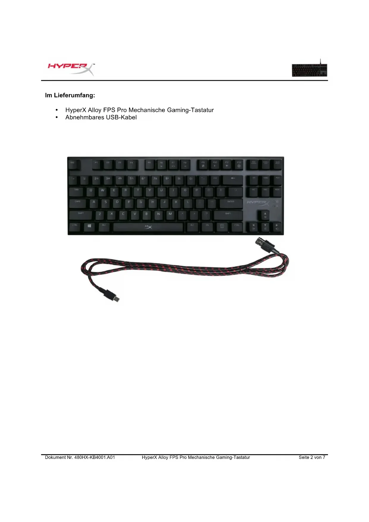 - Abnehmbares USB-KabelDokument Nr. 480HX-KB4001.A01 HyperX Alloy FPS Pro Mechanische Gaming-Tastatur Seite 3 von 7