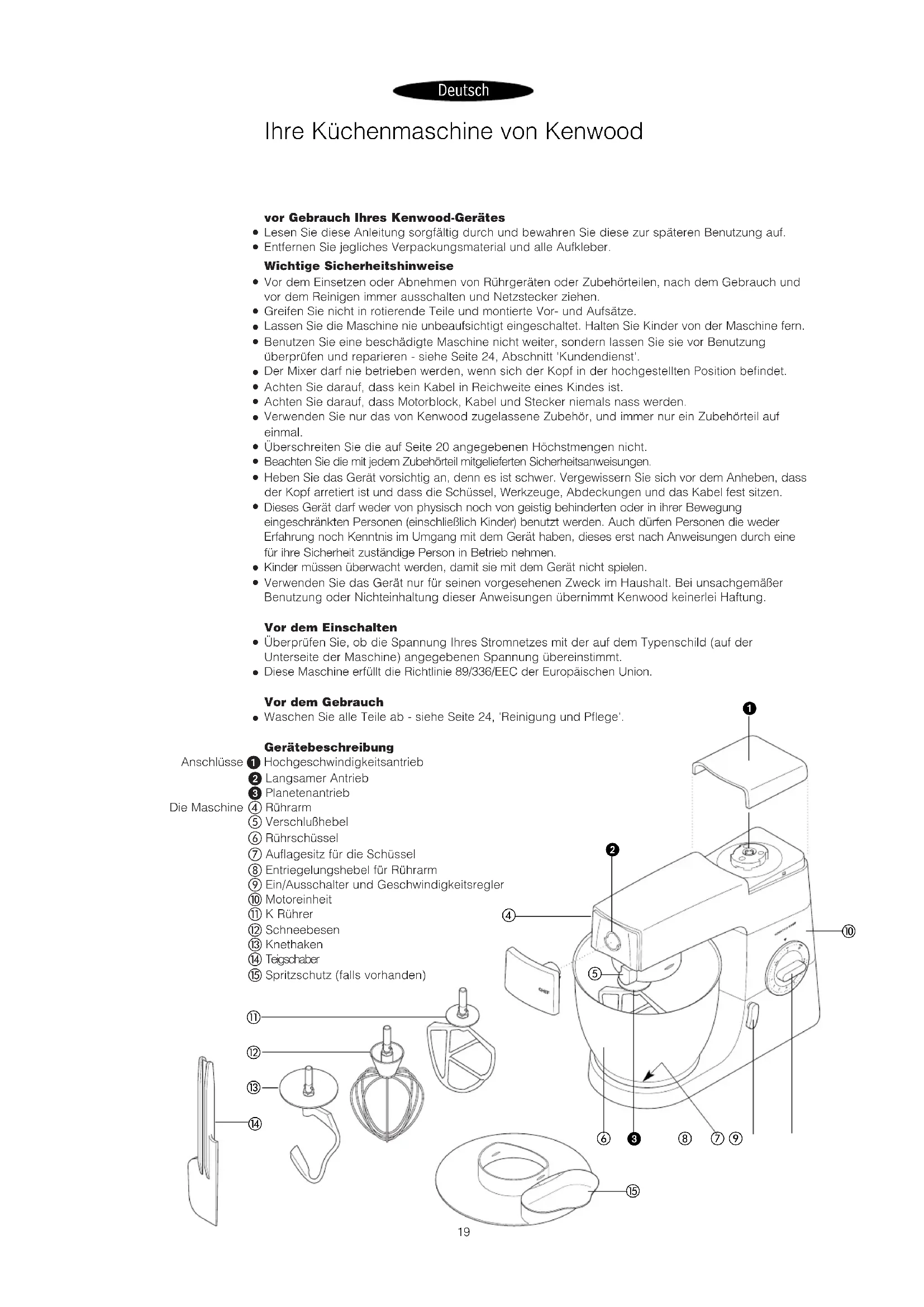 Waschen Sie alle Teile ab - siehe Seite 24, 'Reinigung und Pflege'. Gerätebeschreibung Anschlüsse Hochgeschwindigkeitsantrieb Langsamer Antrieb Planetenantrieb Die Maschine Rührarm Verschlußhebel Rührschüssel Auflagesitz für die Schüssel Entriegelungshebel für Rührarm Ein/Ausschalter und Geschwindigkeitsregler Motoreinheit K Rührer Schneebesen Knethaken Teigschaber Spritzschutz (falls vorhanden) Ihre Küchenmaschine von Kenwood