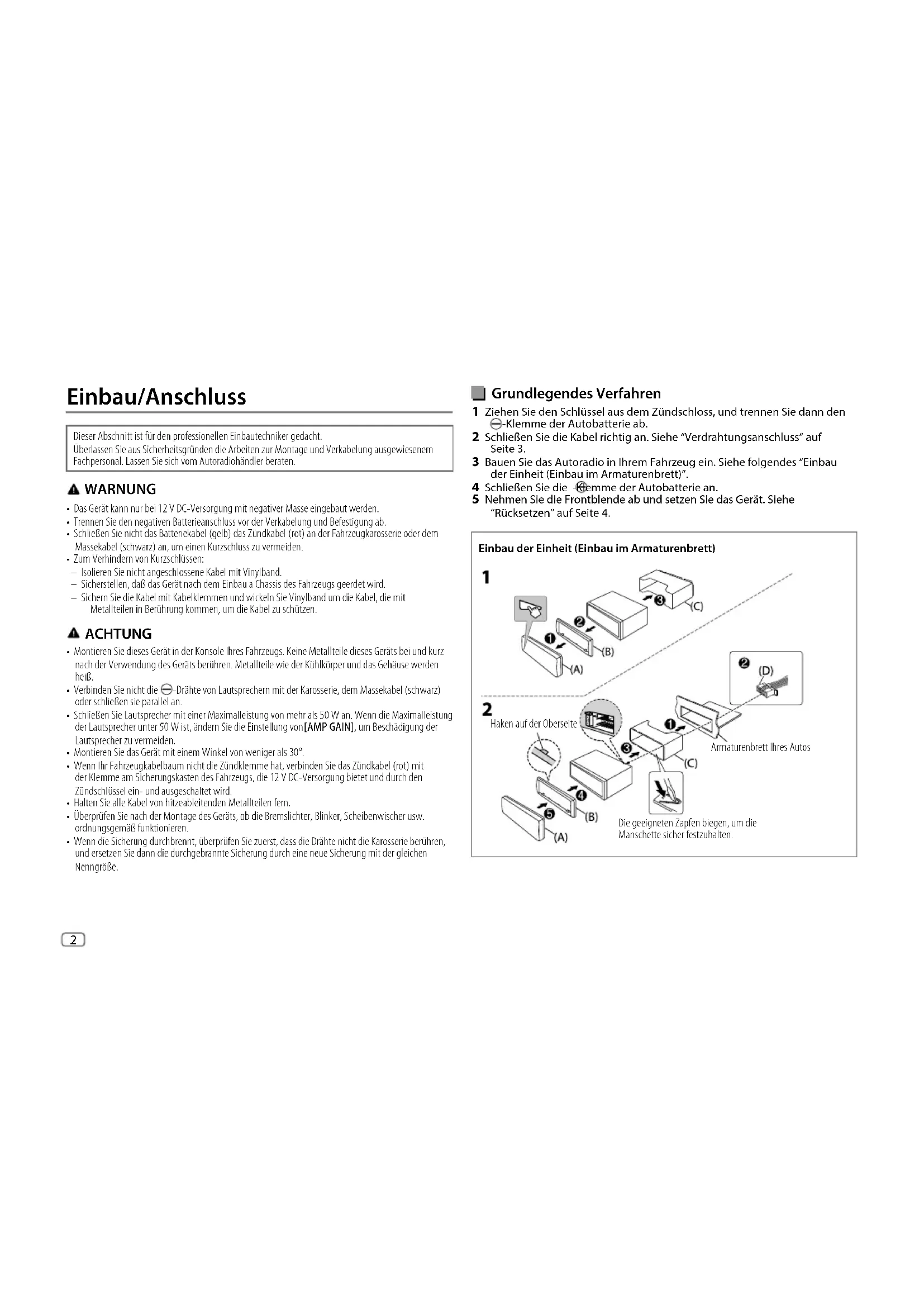[COLORFLOW03] : A cor muda em velocidades diferentes. JS_JVC_QSG_KD_X176_E_PT.indd 8JS_JVC_QSG_KD_X176_E_PT.indd 8 1/7/2019 4:18:34 PM1/7/2019 4:18:34 PMJS_JVC_QSG_KD_X176_E_PT.indd 9JS_JVC_QSG_KD_X176_E_PT.indd 9 1/7/2019 4:18:34 PM1/7/2019 4:18:34 PM2 Data Size: B6L (182 mm x 128 mm)Book Size: B6L (182 mm x 128 mm) Grundlegendes Verfahren 1 Ziehen Sie den Schlüssel aus dem Zündschloss, und trennen Sie dann den -Klemme der Autobatterie ab. 2 Schließen Sie die Kabel richtig an. Siehe “Verdrahtungsanschluss” auf Seite3. 3 Bauen Sie das Autoradio in Ihrem Fahrzeug ein. Siehe folgendes “Einbau der Einheit (Einbau im Armaturenbrett)”. 4 Schließen Sie die -Klemme der Autobatterie an. 5 Nehmen Sie die Frontblende ab und setzen Sie das Gerät. Siehe “Rücksetzen” auf Seite 4. Einbau der Einheit (Einbau im Armaturenbrett) Armaturenbrett Einbau/Anschluss Dieser Abschnitt ist für den professionellen Einbautechniker gedacht. Überlassen Sie aus Sicherheitsgründen die Arbeiten zur Montage und Verkabelung ausgewiesenem Fachpersonal. Lassen Sie sich vom Autoradiohändler beraten. WARNUNG