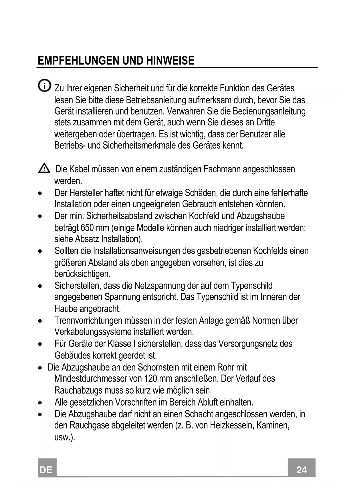 Zu Ihrer eigenen Sicherheit und für die korrekte Funktion des Gerätes lesen Sie bitte diese Betriebsanleitung aufmerksam durch, bevor Sie das Gerät installieren und benutzen. Verwahren Sie die Bedienungsanleitung stets zusammen mit dem Gerät, auch wenn Sie dieses an Dritte weitergeben oder übertragen. Es ist wichtig, dass der Benutzer alle Betriebs- und Sicherheitsmerkmale des Gerätes kennt. Die Kabel müssen von einem zuständigen Fachmann angeschlossen werden. Der Hersteller haftet nicht für etwaige Schäden, die durch eine fehlerhafte Installation oder einen ungeeigneten Gebrauch entstehen könnten. Der min. Sicherheitsabstand zwischen Kochfeld und Abzugshaube beträgt 650 mm (einige Modelle können auch niedriger installiert werden; siehe Absatz Installation). Sollten die Installationsanweisungen des gasbetriebenen Kochfelds einen größeren Abstand als oben angegeben vorsehen, ist dies zu berücksichtigen. Sicherstellen, dass die Netzspannung der auf dem Typenschild angegebenen Spannung entspricht. Das Typenschild ist im Inneren der Haube angebracht. Trennvorrichtungen müssen in der festen Anlage gemäß Normen über Verkabelungssysteme installiert werden. Für Geräte der Klasse I sicherstellen, dass das Versorgungsnetz des Gebäudes korrekt geerdet ist. Die Abzugshaube an den Schornstein mit einem Rohr mit Mindestdurchmesser von 120 mm anschließen. Der Verlauf des Rauchabzugs muss so kurz wie möglich sein. Alle gesetzlichen Vorschriften im Bereich Abluft einhalten. Die Abzugshaube darf nicht an einen Schacht angeschlossen werden, in den Rauchgase abgeleitet werden (z. B. von Heizkesseln, Kaminen, usw.).DE