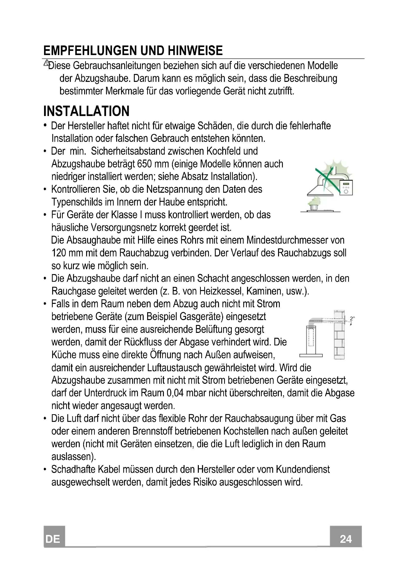 - Für Geräte der Klasse I muss kontrolliert werden, ob das häusliche Versorgungsnetz korrekt geerdet ist. Die Absaughaube mit Hilfe eines Rohrs mit einem Mindestdurchmesser von 120 mm mit dem Rauchabzug verbinden. Der Verlauf des Rauchabzugs soll so kurz wie möglich sein.