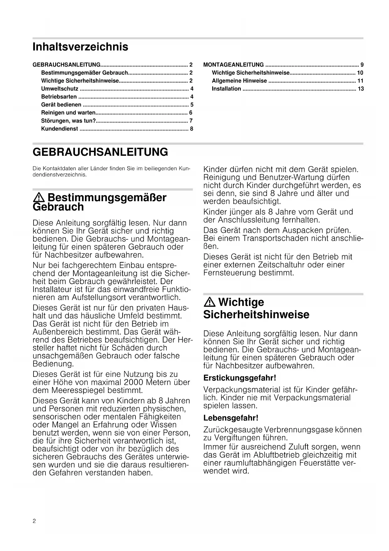 - Installation GEBRAUCHSANLEITUNG Gebrauchsanleitung Die Kontaktdaten aller Länder finden Sie im beiliegenden Kun- dendienstverzeichnis. : Bestimmungsgemäßer Gebrauch Diese Anleitung sorgfältig lesen. Nur dann können Sie Ihr Gerät sicher und richtig bedienen. Die Gebrauchs- und Montagean- leitung für einen späteren Gebrauch oder für Nachbesitzer aufbewahren. Nur bei fachgerechtem Einbau entspre- chend der Montageanleitung ist die Sicher- heit beim Gebrauch gewährleistet. Der Installateur ist für das einwandfreie Funktio- nieren am Aufstellungsort verantwortlich. Dieses Gerät ist nur für den privaten Haus- halt und das häusliche Umfeld bestimmt. Das Gerät ist nicht für den Betrieb im Außenbereich bestimmt. Das Gerät wäh- rend des Betriebes beaufsichtigen. Der Her- steller haftet nicht für Schäden durch unsachgemäßen Gebrauch oder falsche Bedienung. Dieses Gerät ist für eine Nutzung bis zu einer Höhe von maximal 2000 Metern über dem Meeresspiegel bestimmt. Dieses Gerät kann von Kindern ab 8 Jahren und Personen mit reduzierten physischen, sensorischen oder mentalen Fähigkeiten oder Mangel an Erfahrung oder Wissen benutzt werden, wenn sie von einer Person, die für ihre Sicherheit verantwortlich ist, beaufsichtigt oder von ihr bezüglich des sicheren Gebrauchs des Gerätes unterwie- sen wurden und sie die daraus resultieren- den Gefahren verstanden haben. Kinder dürfen nicht mit dem Gerät spielen. Reinigung und Benutzer-Wartung dürfen nicht durch Kinder durchgeführt werden, es sei denn, sie sind 8 Jahre und älter und werden beaufsichtigt. Kinder jünger als 8 Jahre vom Gerät und der Anschlussleitung fernhalten. Das Gerät nach dem Auspacken prüfen. Bei einem Transportschaden nicht anschlie- ßen. Dieses Gerät ist nicht für den Betrieb mit einer externen Zeitschaltuhr oder einer Fernsteuerung bestimmt. : Wichtige Sicherheitshinweise Diese Anleitung sorgfältig lesen. Nur dann können Sie Ihr Gerät sicher und richtig bedienen. Die Gebrauchs- und Montagean- leitung für einen späteren Gebrauch oder für Nachbesitzer aufbewahren. Erstickungsgefahr! Verpackungsmaterial ist für Kinder gefähr- lich. Kinder nie mit Verpackungsmaterial spielen lassen. Lebensgefahr! Zurückgesaugte Verbrennungsgase können zu Vergiftungen führen. Immer für ausreichend Zuluft sorgen, wenn das Gerät im Abluftbetrieb gleichzeitig mit einer raumluftabhängigen Feuerstätte ver- wendet wird.3 Raumluftabhängige Feuerstätten (z. B. gas-, öl-, holz- oder kohlebetriebene Heizgeräte, Durchlauferhitzer, Warmwasserbereiter) beziehen Verbrennungsluft aus dem Auf- stellraum und führen die Abgase durch eine Abgasanlage (z. B. Kamin) ins Freie. In Verbindung mit einer eingeschalteten Dunstabzugshaube wird der Küche und den benachbarten Räumen Raumluft entzogen - ohne ausreichende Zuluft entsteht ein Unterdruck. Giftige Gase aus dem Kamin oder Abzugsschacht werden in die Wohn- räume zurückgesaugt. p. 13