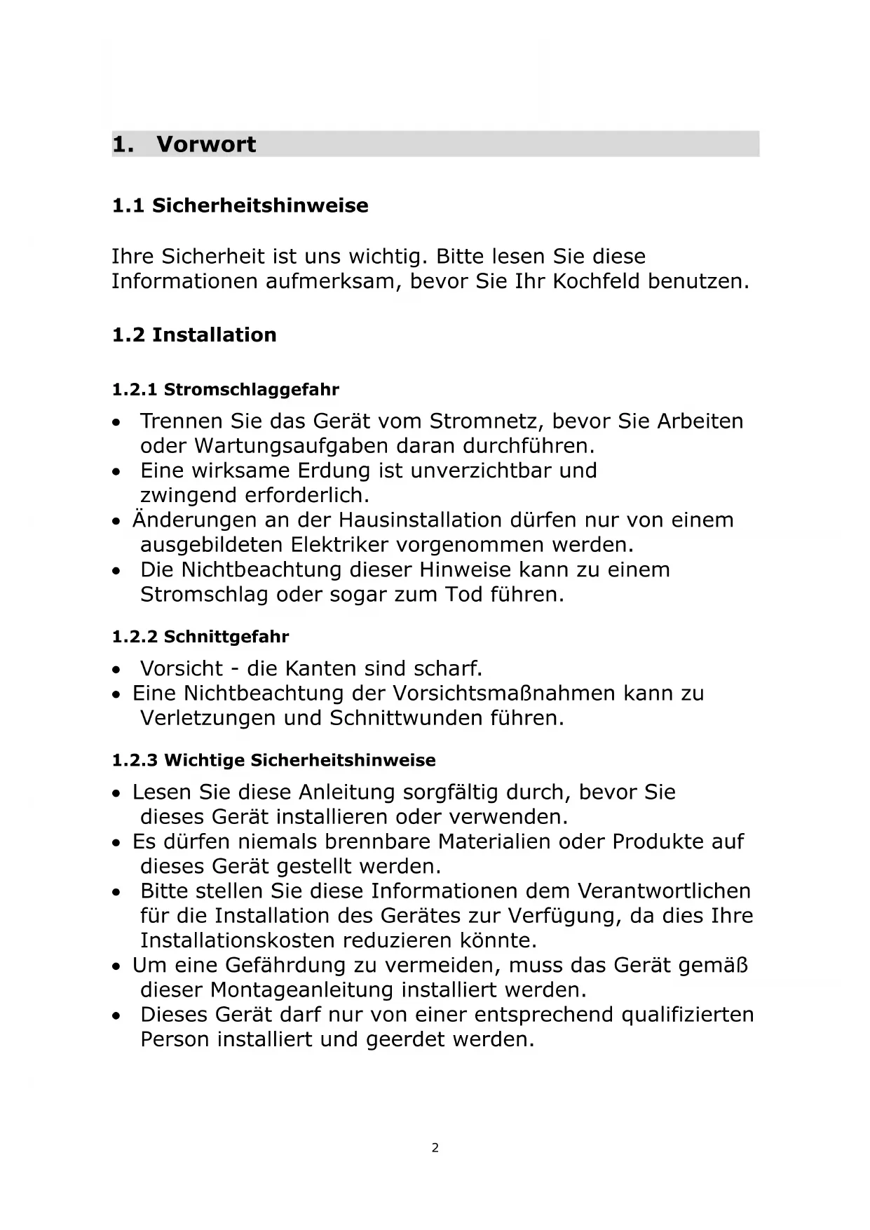 1. Die Installation des Cerankochfeldes muss von qualifiziertem Personal oder Technikern