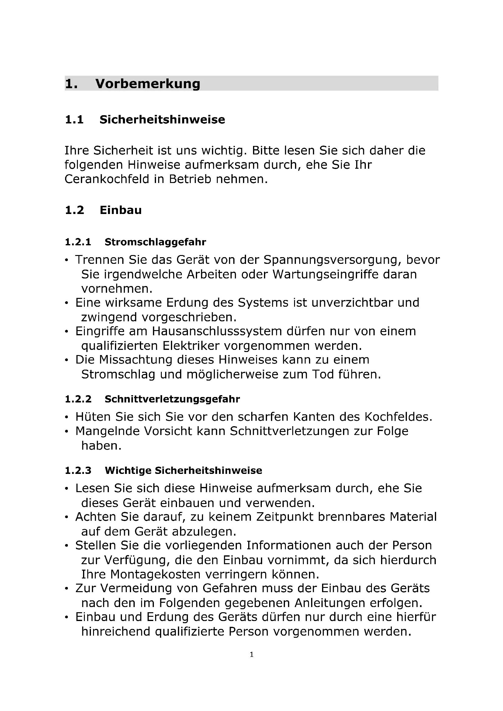1. Das Cerankochfeld darf nur von Fachpersonal oder qualifizierten Technikern eingebaut werden. Wir