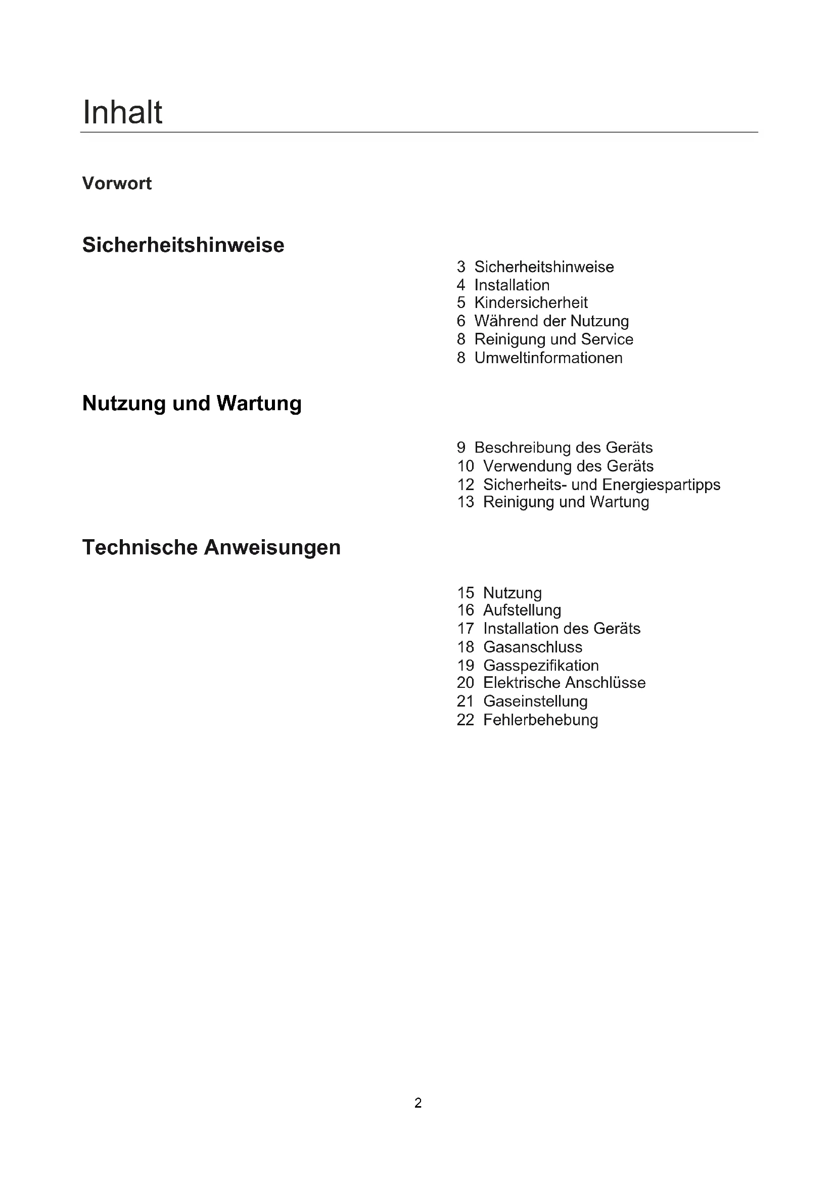 [de] Montage- und Gebrauchsanweisung [en] Instructions on mounting an use [fr] Prescriptions de montage et mode d’emploi [nl] Montagevoorschriften en Gebruiksaanwiizing [it] Istruzioni di montaggio e d’uso [s] Monterings- och bruksanvisningar [e] Montaje y modo de empleo Gaskochfeld 5GB 62190 Gas hob 5GB 62190 Table de cuisson à gaz 5GB 62190 Gaskookplaat 5GB 62190 Piano di cottura a gas 5GB 62190 Matlagningsfält gas 5GB 62190 Placa de gas 5GB 621902 Inhalt Vorwort Sicherheitshinweise 3 Sicherheitshinweise 4 Installation 5 Kindersicherheit 6 Während der Nutzung 8 Reinigung und Service 8 Umweltinformationen Nutzung und Wartung 9 Beschreibung des Geräts 10 Verwendung des Geräts 12 Sicherheits- und Energiespartipps 13 Reinigung und Wartung Technische Anweisungen 15 Nutzung 16 Aufstellung 17 Installation des Geräts 18 Gasanschluss 19 Gasspezifikation 20 Elektrische Anschlüsse 21 Gaseinstellung 22 Fehlerbehebung3 Sicherheitshinweise ■ Bitte nehmen Sie sich die Zeit, diese Bedienungsanleitung zu lesen, bevor Sie das Gerät installieren oder benutzen. ■ Diese Gebrauchsanweisung ist für alle zukünftigen Nachfragen aufzubewahren. Wenn das Gerät verkauft oder an eine andere Person übergeben wird, muss auch diese Bedienungsanleitung an den neuen Benutzer weitergegeben werden. ■ Der Hersteller lehnt jede Haftung bei Nichtbeachtung dieser Sicherheitsmaßnahmen ab. ■ Die folgenden Hinweise sind so gestaltet, dass sie leicht verständlich sind, damit Unfälle durch Missbrauch im Voraus vermieden und das Gerät bequemer bedient werden kann. ■ Lesen Sie die folgenden Kapitel sorgfältig durch.