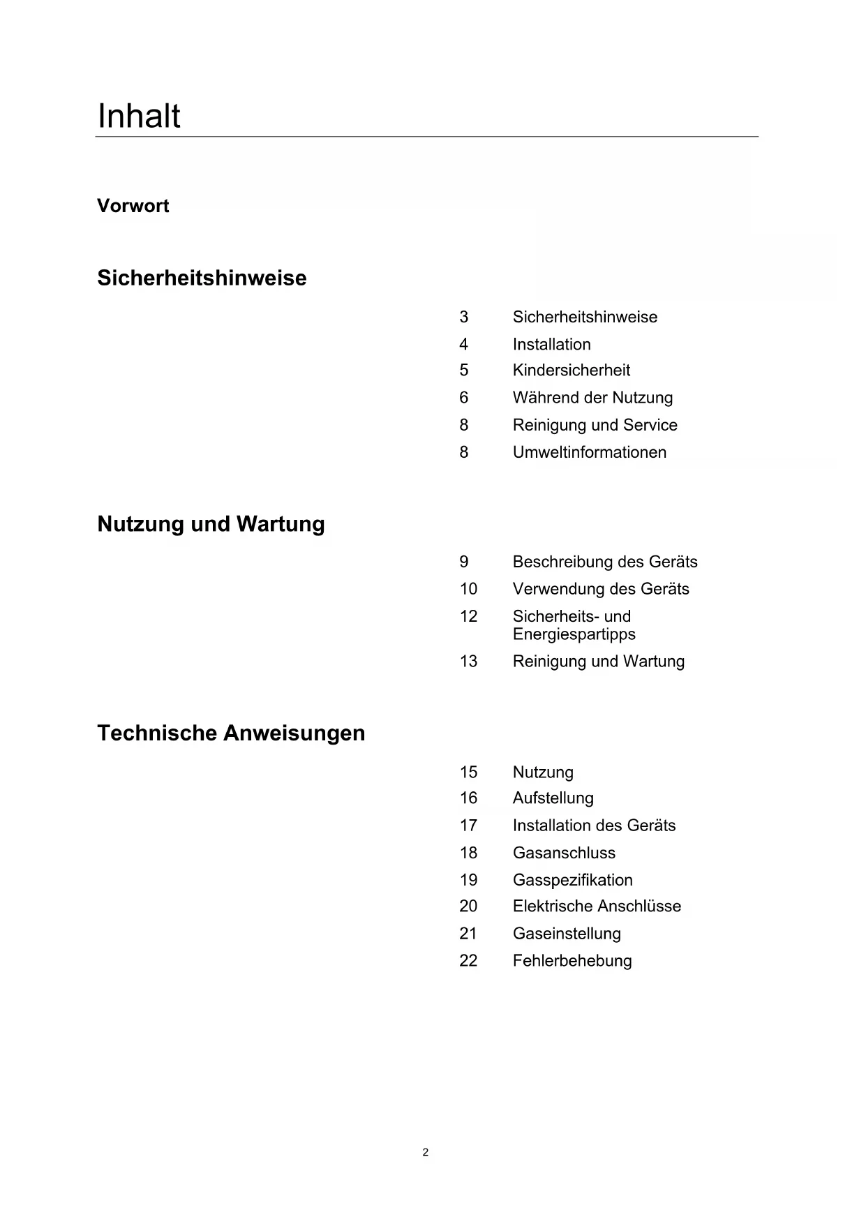 LPG5 Kindersicherheit Warnung Achtung ■ Dieses Gerät ist für die Nutzung durch Erwachsene konzipiert. ■ Kinder können sich auch verletzen, indem sie Pfannen oder Töpfe vom Gerät ziehen. ■ Dieses Gerät darf nicht von Kindern oder anderen Personen, deren körperliche, sensorische oder geistige Fähigkeiten oder mangelnde Erfahrung und Kenntnisse sie daran hindern, das Gerät sicher ohne Aufsicht oder Anleitung durch eine verantwortliche Person zu benutzen, verwendet werden. Lassen Sie keine Kinder in der Nähe des Gerätes spielen. Das Gerät wird heiß, wenn es in Betrieb ist. Kinder sollten bis zur Abkühlung ferngehalten werden.6 Während der Nutzung Warnung ■ Verwenden Sie das Gerät nur zur Zubereitung von Speisen. ■ Nehmen Sie keine Veränderungen am Gerät vor. Der Brennerbereich ist nicht für den Betrieb mit einem externen Timer oder einem separaten Fernbedienungssystem ausgelegt. ■ Die Nutzung eines Gasherdes erzeugt Wärme und Feuchtigkeit in dem Raum, in dem das Gerät installiert ist. Achten Sie auf eine gute Belüftung der Küche: Halten Sie die vorgesehenen Belüftungslöcher offen oder installieren Sie eine mechanische Belüftungsvorrichtung (mechanische Dunstabzugshaube). ■ Verwenden Sie dieses Gerät nicht, wenn es mit Wasser in Berührung kommt. Bedienen Sie dieses Gerät nicht mit nassen Händen. ■ Die Heiz- und Kochflächen des Gerätes werden während des Gebrauchs heiß. Seien Sie stets vorsichtig. ■ Verwenden Sie keine großen Tücher, Geschirrtücher oder ähnliches, da die Enden die Flammen berühren und Feuer fangen können. ■ Lassen Sie das Gerät beim Kochen niemals unbeaufsichtigt. ■ Verwenden Sie keine instabilen oder unförmigen Pfannen, da sie kippen oder versehentlich entleert werden können.7 Während der Nutzung ■ Verwenden oder lagern Sie in der Nähe dieses Gerätes keine brennbaren Materialien. ■ Verderbliche Lebensmittel, Kunststoffartikel und Aerosole können durch die Hitzeeinwirkung beeinträchtigt werden und sollten nicht über oder unter dem Gerät gelagert werden. ■ Versprühen Sie während des Betriebs keine Aerosole in der Nähe dieses Gerätes. ■ Achten Sie darauf, dass sich die Bedienknöpfe bei Nichtgebrauch in der Position l befinden. Achtung ■ Dieses Gerät ist ausschließlich für das Kochen zu Hause bestimmt. Es ist nicht für gewerbliche oder industrielle Zwecke ausgelegt. ■ Eine längere intensive Nutzung des Gerätes kann eine zusätzliche Belüftung erfordern, z. B. das Öffnen eines Fensters oder eine stärkere mechanische Belüftung, falls vorhanden. ■ Verwenden Sie beim Berühren von heißen Töpfen und Pfannen hitzebeständige Topflappen oder Handschuhe. ■ Lassen Sie beim Anheben von Kochgeschirr keine Topflappen in die Nähe offener Flammen gelangen. ■ Achten Sie darauf, dass Topflappen oder Handschuhe nicht feucht oder nass werden, da dadurch die Wärme schneller durch das Material transportiert wird und die Gefahr besteht, dass Sie sich verbrennen. ■ Verwenden Sie die Brenner nur, wenn Sie Töpfe und Pfannen darauf gestellt haben. Erhitzen Sie keine leeren Töpfe oder Pfannen. ■ Verwenden Sie auf dem Gerät niemals Kunststoff- oder Aluminiumfolienschalen. ■ Bei der Verwendung anderer Elektrogeräte ist darauf zu achten, dass das Kabel nicht mit den Oberflächen des Kochbereichs in Berührung kommt. ■ Wenn Sie mechanische Teile in Ihrem Körper haben, z. B. eine künstliche Herzklappe, konsultieren Sie vor der Benutzung des Gerätes einen Arzt. ■ Verwenden Sie keine Geschirrtücher oder ähnliche Materialien anstelle eines Topflappens. Diese Tücher können über einem heißen Brenner Feuer fangen. ■ Bei der Verwendung von Glaskochgeschirr ist darauf zu achten, dass es für das Kochen auf der oberen Platte ausgelegt ist. Wenn die Oberfläche aus gesprungenem Glas besteht, schalten Sie das Gerät aus, um einen Stromschlag zu vermeiden. ■ Drehen Sie die Griffe des Kochgeschirrs zur Seite oder zur Mitte, sodass sie sich nicht über benachbarte Brenner erstrecken, um Verbrennungen, die Entflammung brennbarer Materialien und Verschüttungen zu minimieren. ■ Schalten Sie die Brenner immer aus, bevor Sie das Kochgeschirr entfernen. ■ Seien Sie stets wachsam, wenn Lebensmittel bei hoher Flammenintensität gebraten werden. ■ Erwärmen Sie Fett immer langsam und passen Sie auf, während es erhitzt wird. ■ Lebensmittel, die frittiert werden sollen, sollten so trocken wie möglich sein. Frost auf Tiefkühlkost oder Feuchtigkeit auf frischen Lebensmitteln kann dazu führen, dass heißes Fett aus der Pfanne spritzt. ■ Versuchen Sie niemals, eine Pfanne mit heißem Fett, insbesondere eine Fritteuse, zu bewegen. Warten Sie, bis das Fett vollständig abgekühlt ist.8 Reinigung und Service Umweltinformationen ■ Verwenden Sie niemals scheuernde oder ätzende Reinigungsmittel. Warnung Achtung ■ Dieses Gerät darf nur von einem autorisierten Servicetechniker repariert oder gewartet werden und es dürfen nur Originalersatzteile verwendet werden. ■ Bevor Sie das Gerät reinigen, sollten Sie es vom Netz trennen und abkühlen lassen. ■ Zur Reinigung des Gerätes sollten Sie keinen Dampfstrahler oder andere Hochdruckreinigungsgeräte verwenden. ■ Bitte entsorgen Sie die Verpackung nach der Installation unter Berücksichtigung von Sicherheit und Umwelt. ■ Wenn Sie ein altes Gerät entsorgen, machen Sie es unbrauchbar, indem Sie das Kabel abschneiden. Korrekte Entsorgung dieses Produkts (Entsorgung von Elektro- und Elektronik-Altgeräten) ■ Diese Kennzeichnung auf dem Produkt oder seinen Handbüchern weist darauf hin, dass es am Ende seiner Lebensdauer nicht zusammen mit anderen Haushaltsabfällen entsorgt werden darf. Um mögliche Schäden für die Umwelt oder die menschliche Gesundheit durch unkontrollierte Abfallentsorgung zu vermeiden, recyceln Sie das Gerät verantwortungsbewusst, um die nachhaltige Wiederverwendung von Ressourcen zu fördern. ■ Private Nutzer sol