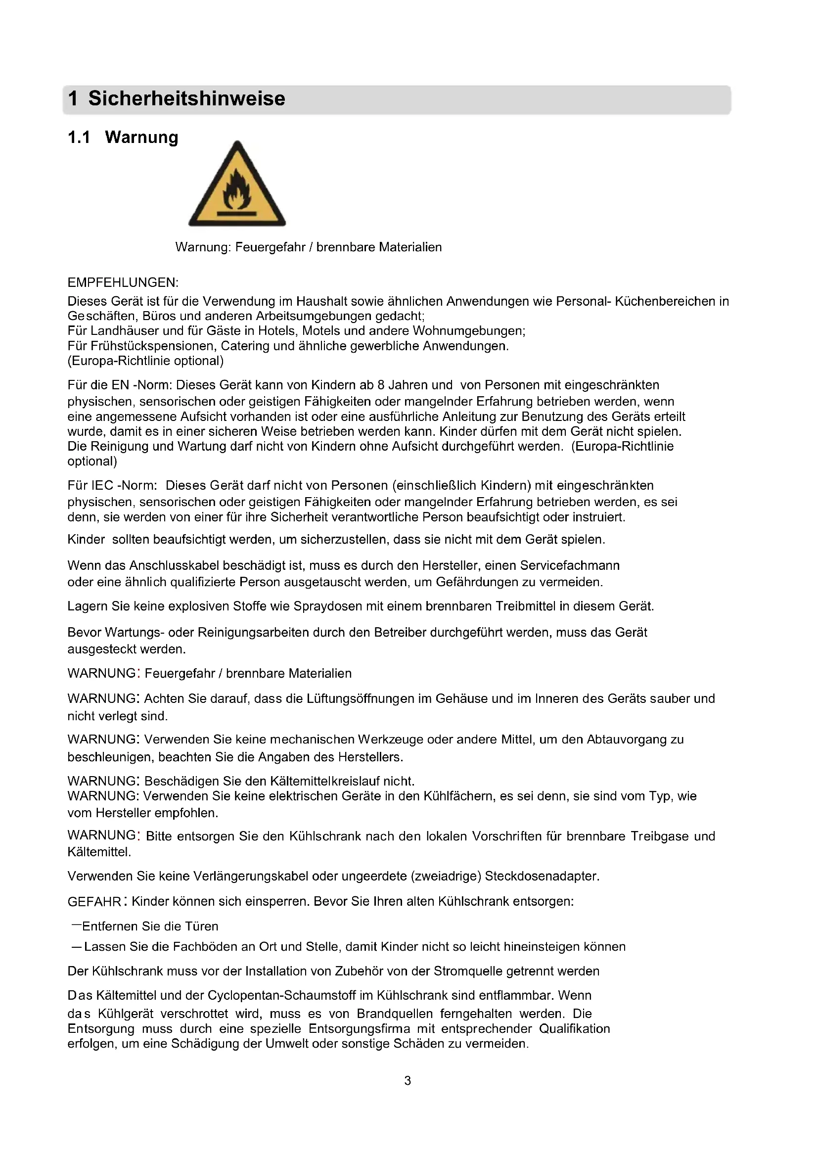 schäften, Büros und anderen Arbeitsumgebungen gedacht; Für Landhäuser und für Gäste in Hotels, Motels und andere Wohnumgebungen; Für Frühstückspensionen, Catering und ähnliche gewerbliche Anwendungen. (Europa-Richtlinie optional) Für die EN -Norm: Dieses Gerät kann von Kindern ab 8 Jahren und von Personen mit eingeschränkten physischen, sensorischen oder geistigen Fähigkeiten oder mangelnder Erfahrung betrieben werden, wenn eine angemessene Aufsicht vorhanden ist oder eine ausführliche Anleitung zur Benutzung des Geräts erteilt wurde, damit es in einer sicheren Weise betrieben werden kann. Kinder dürfen mit dem Gerät nicht spielen. Die Reinigung und Wartung darf nicht von Kindern ohne Aufsicht durchgeführt werden. (Europa-Richtlinie optional) Für IEC -Norm: Dieses Gerät darf nicht von Personen (einschließlich Kindern) mit eingeschränkten physischen, sensorischen oder geistigen Fähigkeiten oder mangelnder Erfahrung betrieben werden, es sei denn, sie werden von einer für ihre Sicherheit verantwortliche Person beaufsichtigt oder instruiert. Kinder sollten beaufsichtigt werden, um sicherzustellen, dass sie nicht mit dem Gerät spielen. Wenn das Anschlusskabel beschädigt ist, muss es durch den Hersteller, einen Servicefachmann oder eine ähnli ch qualifizierte Person ausgetauscht werden, um Gefährdungen zu vermeiden. Lagern Sie keine explosiven Stoffe wie Spraydosen mit einem brennbaren Treibmittel in diesem Gerät. Bevor Wartungs- oder Reinigungsarbeiten durch den Betreiber durchgeführt werden, muss das Gerät ausgesteckt werden. WARNUNG : Feuergefahr / brennbare Materialien WARNUNG: Achten Sie darauf, dass die Lüftungsöffnungen im Gehäuse und im Inneren des Geräts sauber und nicht verlegt sind. WARNUNG: Verwenden Sie keine mechanischen Werkzeuge oder andere Mittel, um den Abtauvorgang zu beschleunigen, beachten Sie die Angaben des Herstellers. WARNUNG: Beschädigen Sie den Kältemittelkreislauf nicht. WARNUNG: Verwenden Sie keine elektrischen Geräte in den Kühlfächern, es sei denn, sie sind vom Typ, wie vom Hersteller empfohlen. WARNUNG : Bitte entsorgen Sie den Kühlschrank nach den lokalen Vorschriften für brennbare Treibgase und Kältemittel. Verwenden Sie keine Verlängerungskabel oder ungeerdete (zweiadrige) Steckdosenadapter. GEFAHR : Kinder können sich einsperren. Bevor Sie Ihren alten Kühlschrank entsorgen: Entfernen Sie die Türen Lassen Sie die Fachböden an Ort und Stelle, damit Kinder nicht so leicht hineinsteigen können Der Kühlschrank muss vor der Installation von Zubehör von der Stromquelle getrennt werden