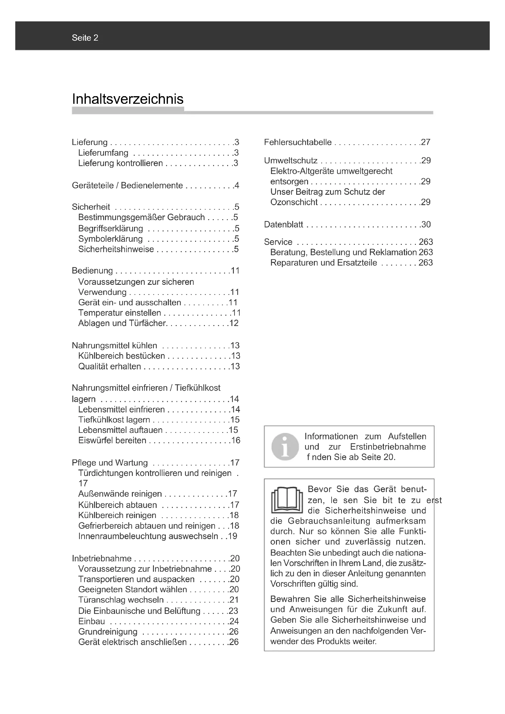 das Gerät einen Transportschaden aufweisen, nehmen Sie bitte Kontakt mit unserem Service auf (siehe Seite 236). WARNUNG! Stromschlaggefahr! Nie ein beschädigtes Gerät in Betrieb nehmen. (a) (b) (c) (d) (e) (f) 92701 20170913.indd 392701 20170913.indd 3 13.09.2017 12:56:0613.09.2017 12:56:06Geräteteile / BedienelementeSeite 4 Geräteteile / Bedienelemente (1) Gefrierfach (2) Innenbeleuchtung (3) Temperaturregler (4) Türablage (5) Türfach (6) Flaschenfach (7) Obst-/Gemüseschubladen (8) Glasablage, fest (9) Glasablage, verstellbar 92701 20170913.indd 492701 20170913.indd 4 13.09.2017 12:56:0613.09.2017 12:56:06 (1) (2) (3) (7) (8) (9) (4) (5) (6)SicherheitSeite 5 Bestimmungsgemäßer Gebrauch Das Gerät ist geeignet, um frische Le- bensmittel zu kühlen, handelsübliche Tief kühl kost ein zu la gern, zum Tief ge- frie ren frischer, zimmerwarmer Lebens- mittel sowie zur Eisbereitung. Das Gerät ist nur zur Verwendung im privaten Haushalt bestimmt. Eine ge- werbliche Nutzung ist ausgeschlossen. Verwenden Sie das Gerät ausschließ- lich wie in dieser Gebr auchsanleitung beschrieben. Jede andere Verwendung gilt als nicht bestimmungsgemäß und kann zu Sachschäden oder sogar zu Personenschäden führen. Der Hersteller übernimmt keine Haftung für Schäden, die durch nicht bestimmungsgemäßen Gebrauch entstanden sind. Begriffserklärung Folgende Si gnal begriffe fi nden Sie in dieser Gebrauchsanleitung. WARNUNG Dieser Signalbegriff bezeichnet eine Gefährdung mit einem mittleren Risiko- grad, die, wenn sie nicht vermieden wird, den Tod oder eine schwere Verlet- zung zur Folge haben kann. VORSICHT Dieser Signalbegriff bezeichnet eine Gefährdung mit einem niedrigen Risiko- grad, die, wenn sie nicht vermieden wird, eine geringfügige oder mäßige Verletzung zur Folge haben kann. HINWEIS Dieser Signalbegriff warnt vor mög- lichen Sachschäden. Dieses Symbol verweist auf nütz- liche Zusatzinformationen. Symbolerklärung Vorsicht: Brandgefahr!Gefrierfach mit -18 °C oder käl ter Sicherheitshinweise In diesem Kapitel fi nden Sie allgemeine Sicherheitshinweise, die Sie zu Ihrem eigenen Schutz und zum Schutz Dritter stets beachten müssen. Beachten Sie auch die Warnhinweise in den einzel- nen Kapiteln zu Bedienung, Einbau etc. WARNUNG Risiken im Umgang mit elektrischen Haushaltsgeräten Stromschlaggefahr! Das Berühren von spannungsführenden Teilen kann zu schweren Verletzungen oder zum Tod führen. ■ Gerät nur in Innenräumen verwen- den. Nicht in Feuchträumen oder im Regen betreiben. ■ Gerät nicht in Betrieb nehmen oder weiter betreiben, wenn es – sichtbare Schäden aufweist, z. B. die Anschlussleitung defekt ist, – Rauch entwickelt oder verbrannt riecht, Sicherheit 92701 20170913.indd 592701 20170913.indd 5 13.09.2017 12:56:0713.09.2017 12:56:07SicherheitSeite 6 – ungewohnte Geräusche von sich gibt. In einem solchen Fall Netzstecker ziehen bzw. Sicherung herausschrau- ben/ausschalten und unseren Service kontaktieren (siehe Seite 236). ■ Das Gerät entspricht der Schutz klasse I und darf nur an eine Steck dose mit ord- nungsgemäß installiertem Schutzleiter angeschlossen werden. Beim Anschlie- ßen darauf achten, dass die richtige Spannung anliegt. Nähere Informatio- nen hierzu fi nden Sie auf dem Typen- schild. ■ Der Anschluss an eine Zeitschaltuhr oder ein separates Fernwirksystem zur Fernüberwachung und -steuerung ist unzulässig. ■ Die vollständige Trennung vom Strom- netz erfolgt bei diesem Gerät nur durch Ziehen des Netzsteckers. Gerät daher nur an eine gut zugängliche Steckdo- se anschließen, damit es im Störfall schnell vom Stromnetz getrennt wer- den kann. ■ Falls der Netzstecker nach dem Auf- stellen nicht mehr zugänglich ist, muss eine allpolige Trennvorrichtung gemäß Überspannungskategorie III in der Hausinstallation mit min- destens 3 mm Kontaktabstand vor- geschaltet sein; hierzu zählen Siche- rungen, LS-Schalter und Schütze. ■ Netzkabel nicht knicken oder klem- men und nicht über scharfe Kanten legen. Die Folge kann ein Kabelbruch sein. ■ Gerät, Netzstecker und Netzkabel von offenem Feuer und heißen Flächen fernhalten. ■ Immer am Netzstecker selbst, nicht am Netzkabel anfassen. ■ Netzstecker niemals mit feuchten Händen anfassen. ■ Netzkabel und -stecker nie in Wasser oder andere Flüssigkeiten tauchen. ■ Wenn das Netzkabel des Geräts be- schädigt ist, muss es durch den Her- steller, dessen Kundendienst oder eine qualifi zierte Fachkraft ausge- tauscht werden. ■ Eingriffe und Reparaturen am Gerät dürfen ausschließlich autorisierte Fachkräfte vornehmen (siehe „Ser- vice“ auf Seite 236). ■ Wenn eigenständige oder unsachge- mäße Reparaturen am Gerät vorge- nommen werden, können Sach- und Personenschäden entstehen und die Haftungs- und Garantieansprüche verfallen. Niemals versuchen, das de- fekte – oder vermeintlich defekte – Gerät selbst zu reparieren. ■ Bei Reparaturen dürfen ausschließ- lich Teile verwendet werden, die den ursprünglichen Gerätedaten entspre- chen. In diesem Gerät befi nden sich elektrische und mechanische Teile, die zum Schutz gegen Gefahrenquel- len unerlässlich sind. ■ Im Fehlerfall sowie vor umfangreichen Reinigungsarbeiten den Netzstecker ziehen bzw. die Sicherung ausschal-ten/ herausdrehen. ■ Keine Gegenstände in oder durch die Gehäuseöffnungen stecken und sicherstellen, dass auch Kinder keine Gegenstände einstecken können. ■ Gerät regelmäßig auf Schäden prüfen. 92701 20170913.indd 692701 20170913.indd 6 13.09.2017 12:56:0713.09.2017 12:56:07Sicherheit Seite 7 Risiken für Kinder Erstickungsgefahr! Kinder können sich in der Verpackungs- folie verfangen oder Kleinteile verschlu- cken und ersticken. ■ Kinder nicht mit der Verpackungsfolie spielen lassen. ■ Kinder daran hindern, Kleinteile vom Gerät abzuziehen oder aus dem Zu- behörbeutel zu nehmen und in den Mund zu stecken. Risiken im Umgang mit chemischen Stoffen Explosionsgefahr! Unsachgemä