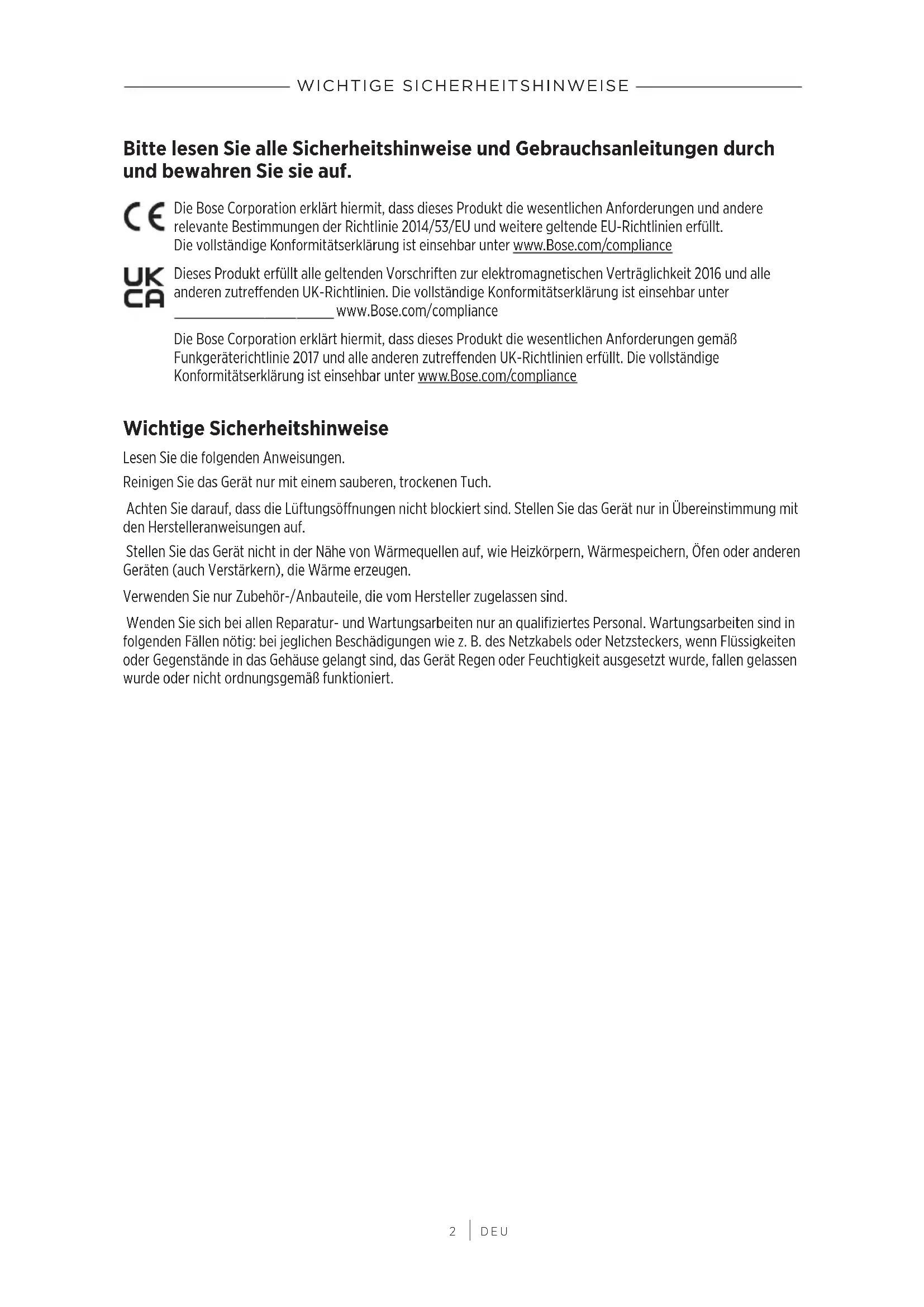 DEU Bitte lesen Sie alle Sicherheitshinweise und Gebrauchsanleitungen durch und bewahren Sie sie auf. Die Bose Corporation erklärt hiermit, dass dieses Produkt die wesentlichen Anforderungen und andere relevante Bestimmungen der Richtlinie 2014/53/EU und weitere geltende EU-Richtlinien erfüllt. Dievollständige Konformitätserklärung ist einsehbar unter www.Bose.com/compliancewww.Bose.com/compliance Dieses Produkt erfüllt alle geltenden Vorschriften zur elektromagnetischen Verträglichkeit 2016 und alle anderen zutreffenden UK-Richtlinien. Die vollständige Konformitätserklärung ist einsehbar unter www.Bose.com/compliancewww.Bose.com/compliance Die Bose Corporation erklärt hiermit, dass dieses Produkt die wesentlichen Anforderungen gemäß Funkgeräterichtlinie 2017 und alle anderen zutreffenden UK-Richtlinien erfüllt. Die vollständige Konformitätserklärung ist einsehbar unter www.Bose.com/compliancewww.Bose.com/compliance Wichtige Sicherheitshinweise Lesen Sie die folgenden Anweisungen. Reinigen Sie das Gerät nur mit einem sauberen, trockenen Tuch. Achten Sie darauf, dass die Lüftungsöffnungen nicht blockiert sind. Stellen Sie das Gerät nur in Übereinstimmung mit den Herstelleranweisungen auf. Stellen Sie das Gerät nicht in der Nähe von Wärmequellen auf, wie Heizkörpern, Wärmespeichern, Öfen oder anderen Geräten (auch Verstärkern), die Wärme erzeugen. Verwenden Sie nur Zubehör-/Anbauteile, die vom Hersteller zugelassen sind. Wenden Sie sich bei allen Reparatur- und Wartungsarbeiten nur an qualifiziertes Personal. Wartungsarbeiten sind in folgenden Fällen nötig: bei jeglichen Beschädigungen wie z.B. des Netzkabels oder Netzsteckers, wenn Flüssigkeiten oder Gegenstände in das Gehäuse gelangt sind, das Gerät Regen oder Feuchtigkeit ausgesetzt wurde, fallen gelassen wurde oder nicht ordnungsgemäß funktioniert.WICHTIGE SICHERHEITSHINWEISE