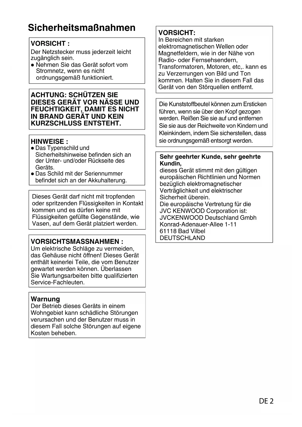 Sehr geehrter Kunde, sehr geehrte Kundin, dieses Gerät stimmt mit den gültigen europäischen Richtlinien und Normen bezüglich elektromagnetischer Verträglichkeit und elektrischer Sicherheit überein. Die europäische Vertretung für die JVC KENWOOD Corporation ist: JVCKENWOOD Deutschland Gmbh Konrad-Adenauer-Allee 1-11 61118 Bad Vilbel DEUTSCHLAND DE 2Inhalt Sicherheitsmaßnahmen .................................... 2 Inhalt .................................................................. 3 Vorsichtsmaßnahmen beim Einsatz des Systems