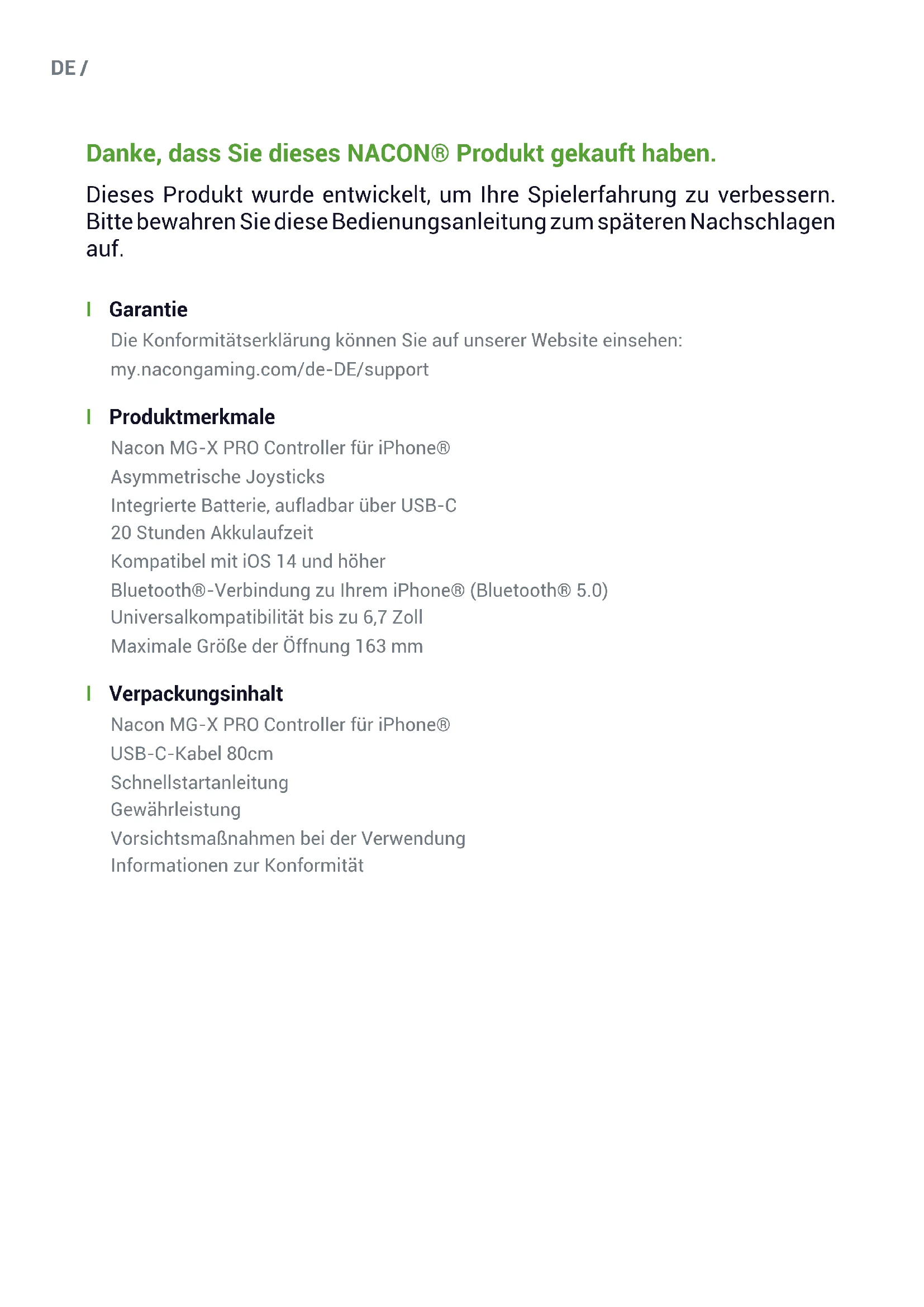 @NaconFR NacongamingFr NaconFR MG-X est une marque déposée. Compact size = Format compact / Wireless = Sans-l / Universal = UniverselMicrosoft, Xbox “Sphere” Design, the Xbox, Xbox Series X, Xbox Series S, Xbox Series X|S, Xbox One and Windows 10/11 are trademarks of the Microsoft group of companies. - iPhone® and iPod touch® are trademarks of Apple Inc, registered in the U.S. and other countries and regions. - iPhone® et iPod touch® sont des marques déposées par Apple Inc, enregistrées aux États-Unis et dans d’autres pays et régions. - All other trademarks are the property of their respective owners. © 2022 NACON Made in ChinaDE / Danke, dass Sie dieses NACON® Produkt gekauft haben. Dieses Produkt wurde entwickelt, um Ihre Spielerfahrung zu verbessern. Bitte bewahren Sie diese Bedienungsanleitung zum späteren Nachschlagen auf. I Garantie Die Konformitätserklärung können Sie auf unserer Website einsehen: my.nacongaming.com/de-DE/support I Produktmerkmale Nacon MG-X PRO Controller für iPhone® Asymmetrische Joysticks Integrierte Batterie, aufladbar über USB-C 20 Stunden Akkulaufzeit Kompatibel mit iOS 14 und höher Bluetooth®-Verbindung zu Ihrem iPhone® (Bluetooth® 5.0) Universalkompatibilität bis zu 6,7 Zoll Maximale Größe der Öffnung 163 mm I Verpackungsinhalt Nacon MG-X PRO Controller für iPhone® USB-C-Kabel 80cm Schnellstartanleitung Gewährleistung Vorsichtsmaßnahmen bei der Verwendung Informationen zur KonformitätDE / I Kontrollelemente L1/L2 R1/R2 Linker Joystick Steuerkreuz Rechter Joystick Aktionstasten Home-Taste Menütaste Status-LEDs & Batterieanzeige USB-C-Ladeanschluss Bluetooth®-Synchronisationsknopf Optionstaste I Ein-/Ausschalten des Controllers Um den Controller einzuschalten, drücken Sie auf die Home-Taste und der Controller wird sich mit dem iPhone® verbinden, mit dem er zuletzt synchronisiert wurde. Um den Controller auszuschalten, halten Sie die Home-Taste 6 Sekunden lang gedrückt. Bitte beachten: der Controller schaltet sich bei Inaktivität nach 15 Minuten automatisch aus, um die Batterie zu schonen. I Erstmaliges Einschalten des Controllers Schalten Sie den Controller ein und er wechselt direkt in den Pairing-Modus. Die 4 LEDs müssen alle gleichzeitig blinken. Rufen Sie das Bluetooth®-Menü Ihres iPhone® auf und starten Sie die Suche nach einem Peripherie-Gerät mit Bluetooth®. Auf Ihrem iPhone® sollte der Controller unter dem Namen „MG-X PRO MFi“ angezeigt werden. Wählen Sie ihn aus und warten Sie, bis der Controller in der Liste der verbundenen Geräte erscheint. I Synchronisieren Ihres iPhone® mit dem Nacon MG-X Pro Controller Rufen Sie das Bluetooth®-Menü Ihres iPhone® auf und starten Sie die Suche nach einem Peripherie-Gerät mit Bluetooth®. Drücken Sie die Home-Taste auf Ihrem Controller und die Status-LEDs sollten nacheinander aufleuchten. Drücken Sie die Bluetooth®-Taste auf der unteren rechten Seite für 2 Sekunden, um das Pairing zu starten. Die 4 LEDs müssen alle gleichzeitig blinken.DE / Auf Ihrem iPhone® sollte der Controller unter dem Namen „MG-X PRO MFi“ angezeigt werden. Wählen Sie ihn aus und warten Sie, bis der Controller in der Liste der verbundenen Geräte erscheint. Der Controller kann bis zu 5 Geräte speichern. Er wird sich vorzugsweise immer mit dem letzten Gerät verbinden. Wenn Sie die Liste der im Controller gespeicherten Geräte zurücksetzen möchten: -Schalten Sie den Controller ein, indem Sie die Home-Taste gedrückt halten. Lassen Sie nach dem Einschalten die Home-Taste los. - Halten Sie die Home-Taste und die Bluetooth®-Taste 5 Sekunden lang gedrückt. Der Controller wird wieder in den Pairing-Modus versetzt und sollte in der Liste der für das Pairing verfügbaren Geräte erscheinen. I Batterieanzeige Während der Nutzung des Produkts können Sie jederzeit den Ladezustand der Batterie sehen. Um dies zu tun, drücken zweimal schnell hintereinander auf die Home-Taste. Die LEDs schalten um, und zeigen den Ladezustand der Batterie gemäß den folgenden Codes an: - Volle Batterie (100%): alle 4 LEDs leuchten - Beinahe volle Batterie (≥75%): 3 LEDs leuchten - Halbvolle Batterie (≥50%): 2 LEDs leuchten - Schwache Batterie (≥25%): 1 LED leuchtet - Sehr schwache Batterie (<25%): keine LED leuchtet - Kritischer Batteriestand (<10%) LED 1 blinkt I Aufladen des Controllers In diesem Fall nehmen Sie das mitgelieferte USB-C-Kabel und schließen es an den Anschluss unten am linken Griff an. Schließen Sie dann das andere Ende an einen der freien USB-Ports Ihres PCs oder an ein Ladegerät an. Die LEDs leuchten nacheinander auf, um den Ladevorgang anzuzeigen. Wenn alle vier LEDs leuchten, ist Ihr Controller vollständig aufgeladen. I Schneller Wechsel des iPhone®, das mit Ihrem Controller verbunden ist Sie können während der Nutzung des Produkts jederzeit zwischen einem iPhone® und dem vorherigen verbundenen iPhone® umschalten, indem Sie schnell zweimal auf die Bluetooth®-Taste drücken. I Zurücksetzen des Produkts Wenn Sie während der Nutzung des Produkts auf Funktionsstörungen stoßen, haben SieDE / jederzeit die Möglichkeit, die Funktionen des Controllers zu unterbrechen. Verwenden Sie dazu eine Büroklammer oder das Werkzeug zum Entfernen der SIM-Karte Ihres Telefons und stecken die Spitze in die Öffnung auf der Rückseite des Controllers, bis Sie den Knopf eindrücken, der sich darunter bendet. Nach dem Drücken des Knopfs schaltet sich Ihr Controller aus und Sie können ihn normal über die Home-Taste wieder einschalten. I Kompatibilität Der Nacon MG-X PRO Controller ermöglicht es im Cloud-Spieledienst von Microsoft zu spielen. Für den Zugriff auf den Spieledienst ist ein Xbox Game Pass-Abonnement erforderlich. Der Nacon MG-X PRO ist mit den Spielen im App-Store kompatibel, die Controller unterstützen. Um herauszunden, ob das Spiel, das Sie spielen möchten, den MG-X Pro Controller unterstützt, gehen Sie auf die Seite des Spiels im App-Store von Apple und