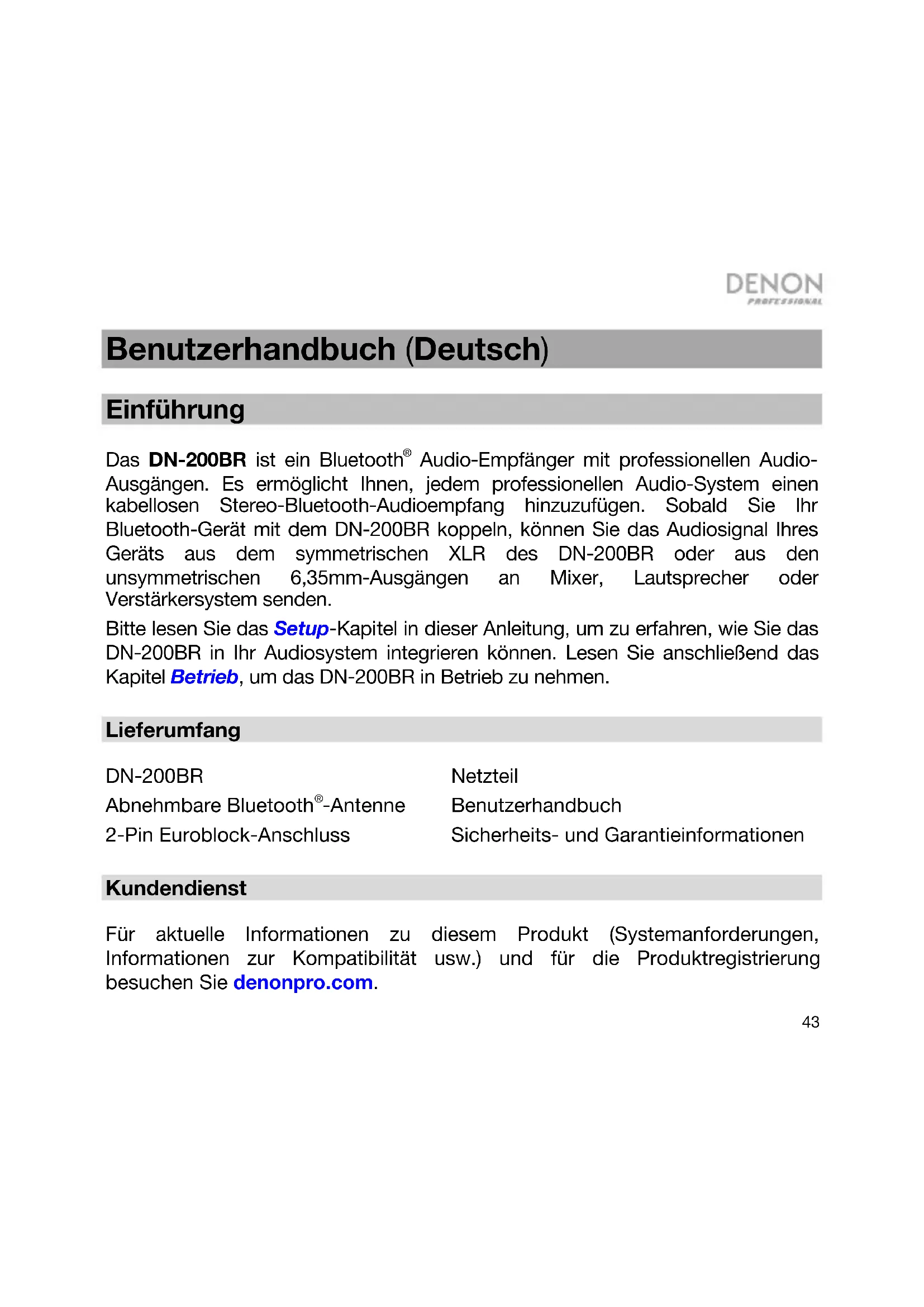 -Antenne 2-Pin Euroblock-Anschluss Netzteil Benutzerhandbuch Sicherheits- und Garantieinformationen Kundendienst Für aktuelle Informationen zu diesem Produkt (Systemanforderungen, Informationen zur Kompatibilität usw.) und für die Produktregistrierung besuchen Sie denonpro.com.44