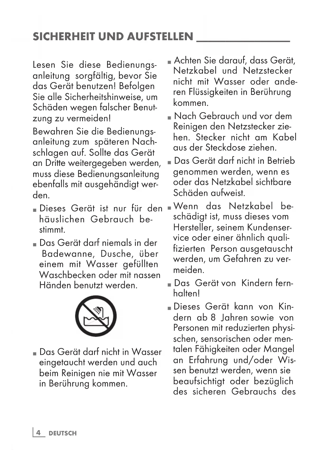 DEUTSCH Lesen Sie diese Bedienungs- anleitung sorgfältig, bevor Sie das Gerät benutzen! Befolgen Sie alle Sicherheitshinweise, um Schäden wegen falscher Benut- zung zu vermeiden! Bewahren Sie die Bedienungs- anleitung zum späteren Nach- schlagen auf. Sollte das Gerät an Dritte weitergegeben werden, muss diese Bedienungsanleitung ebenfalls mit ausgehändigt wer- den. 7 Dieses Gerät ist nur für den häuslichen Gebrauch be- stimmt. 7 Das Gerät darf niemals in der Badewanne, Dusche, über einem mit Wasser gefüllten Waschbecken oder mit nassen Händen benutzt werden. 7 Das Gerät darf nicht in Wasser eingetaucht werden und auch beim Reinigen nie mit Wasser in Berührung kommen. 7 Achten Sie darauf, dass Gerät, Netzkabel und Netzstecker nicht mit Wasser oder ande- ren Flüssigkeiten in Berührung kommen. 7 Nach Gebrauch und vor dem Reinigen den Netzstecker zie- hen. Stecker nicht am Kabel aus der Steckdose ziehen. 7 Das Gerät darf nicht in Betrieb genommen werden, wenn es oder das Netzkabel sichtbare Schäden aufweist. 7 Wenn das Netzkabel be- schädigt ist, muss dieses vom Hersteller, seinem Kundenser- vice oder einer ähnlich quali- fizierten Person ausgetauscht werden, um Gefahren zu ver- meiden. 7 Das Gerät von Kindern fern- halten! 7 Dieses Gerät kann von Kin- dern ab 8 Jahren sowie von Personen mit reduzierten physi- schen, sensorischen oder men- talen Fähigkeiten oder Mangel an Erfahrung und/oder Wis- sen benutzt werden, wenn sie beaufsichtigt oder bezüglich des sicheren Gebrauchs des
