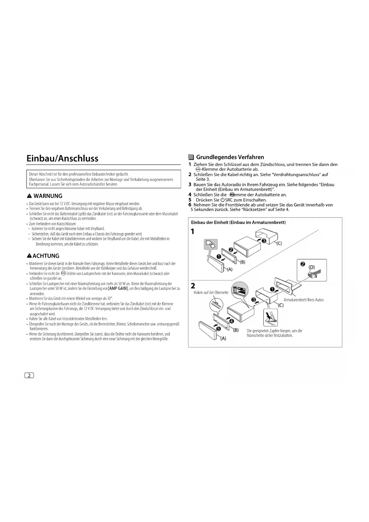 - Das Gerät kann nur bei 12 V DC-Versorgung mit negativer Masse eingebaut werden.