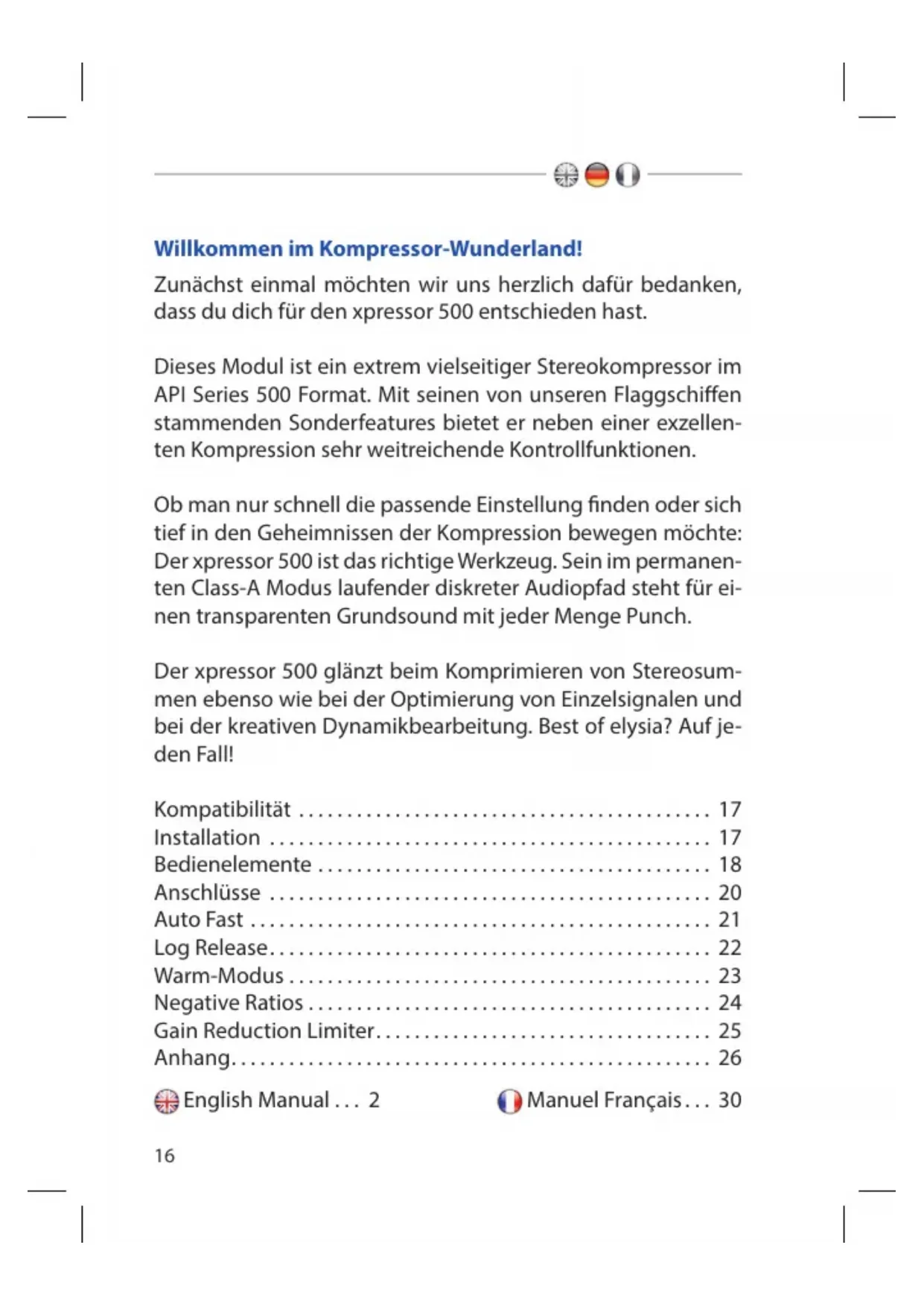 Finden Sie kostenlos die Bedienungsanleitung des Geräts Xpressor 500 Elysia als PDF.