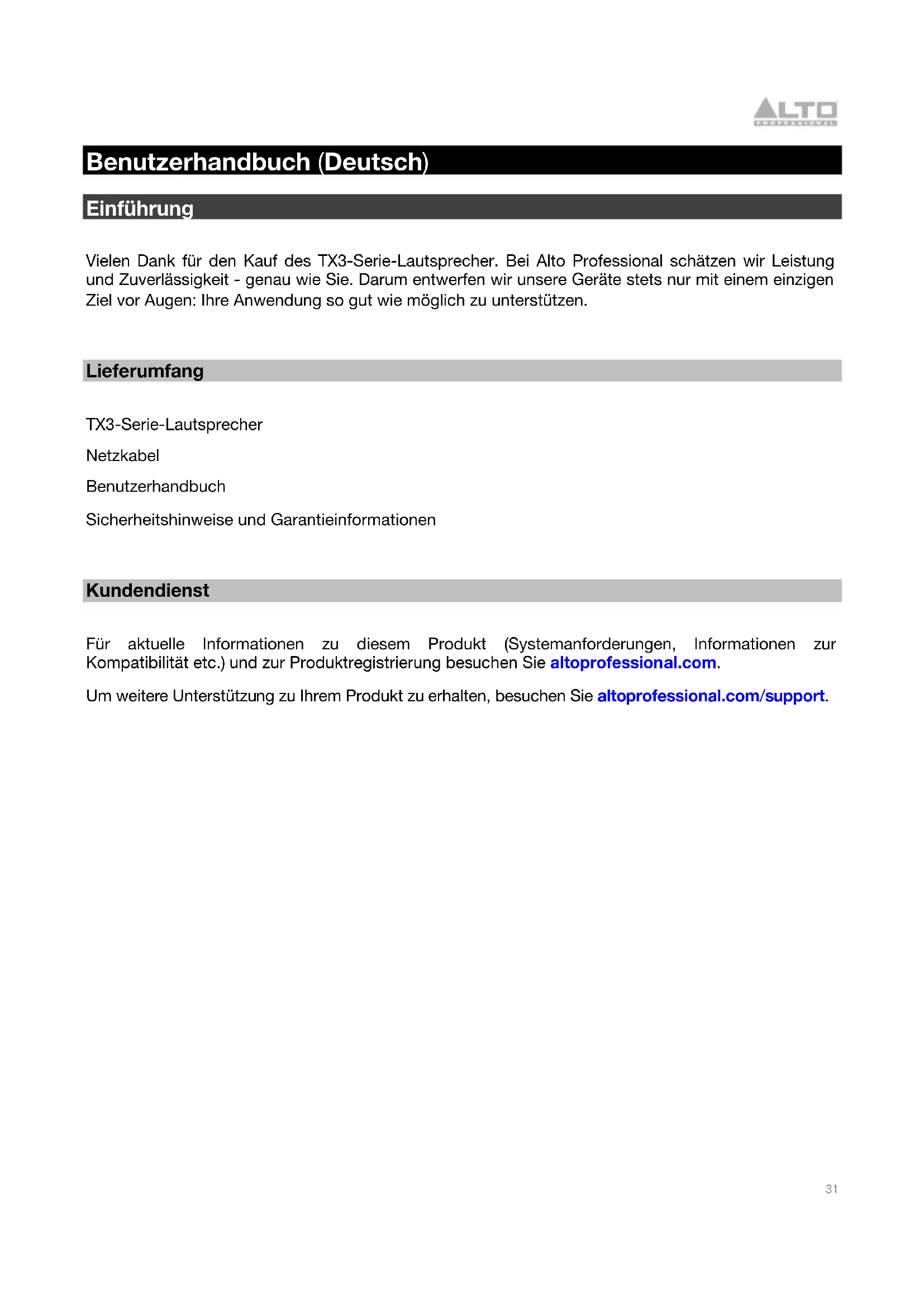 Benutzerhandbuch (Deutsch) Einführung Vielen Dank für den Kauf des TX3-Serie-Lautsprecher. Bei Alto Professional schätzen wir Leistung und Zuverlässigkeit - genau wie Sie. Darum entwerfen wir unsere Geräte stets nur mit einem einzigen Ziel vor Augen: Ihre Anwendung so gut wie möglich zu unterstützen.