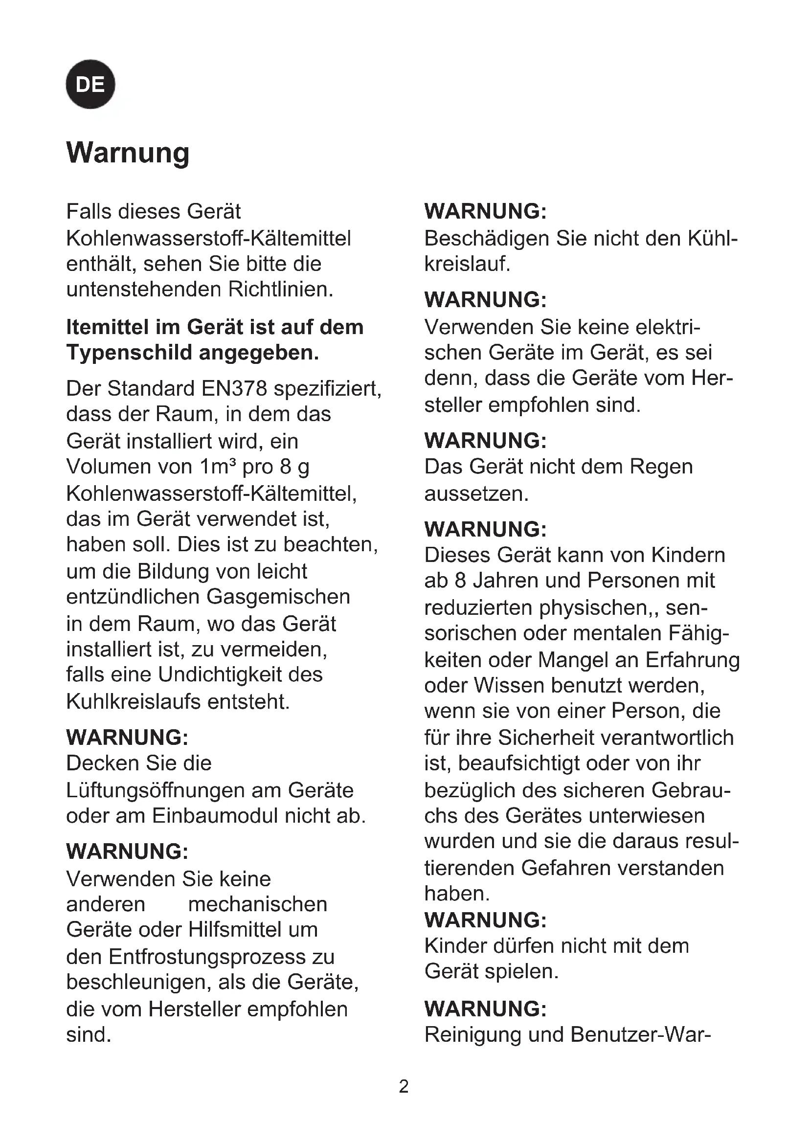WARNUNG: Beschädigen Sie nicht den Kühl- kreislauf. WARNUNG: Verwenden Sie keine elektri- schen Geräte im Gerät, es sei denn, dass die Geräte vom Her- steller empfohlen sind. WARNUNG: Das Gerät nicht dem Regen aussetzen. WARNUNG: Dieses Gerät kann von Kindern ab 8 Jahren und Personen mit reduzierten physischen,, sen- sorischen oder mentalen Fähig- keiten oder Mangel an Erfahrung oder Wissen benutzt werden, wenn sie von einer Person, die für ihre Sicherheit verantwortlich ist, beaufsichtigt oder von ihr bezüglich des sicheren Gebrau- chs des Gerätes unterwiesen wurden und sie die daraus resul- tierenden Gefahren verstanden haben. WARNUNG: Kinder dürfen nicht mit dem Gerät spielen. WARNUNG: Reinigung und Benutzer-War- Falls dieses Gerät Kohlenwassersto-Kältemittel enthält, sehen Sie bitte die untenstehenden Richtlinien. ltemittel im Gerät ist auf dem Typenschild angegeben. Der Standard EN378 speziziert, dass der Raum, in dem das Gerät installiert wird, ein Volumen von 1m³ pro 8 g Kohlenwassersto-Kältemittel, das im Gerät verwendet ist, haben soll. Dies ist zu beachten, um die Bildung von leicht entzündlichen Gasgemischen in dem Raum, wo das Gerät installiert ist, zu vermeiden, falls eine Undichtigkeit des Kuhlkreislaufs entsteht. WARNUNG: Decken Sie die Lüftungsönungen am Geräte oder am Einbaumodul nicht ab. WARNUNG: Verwenden Sie keine anderen mechanischen Geräte oder Hilfsmittel um den Entfrostungsprozess zu beschleunigen, als die Geräte, die vom Hersteller empfohlen sind. Warnung3