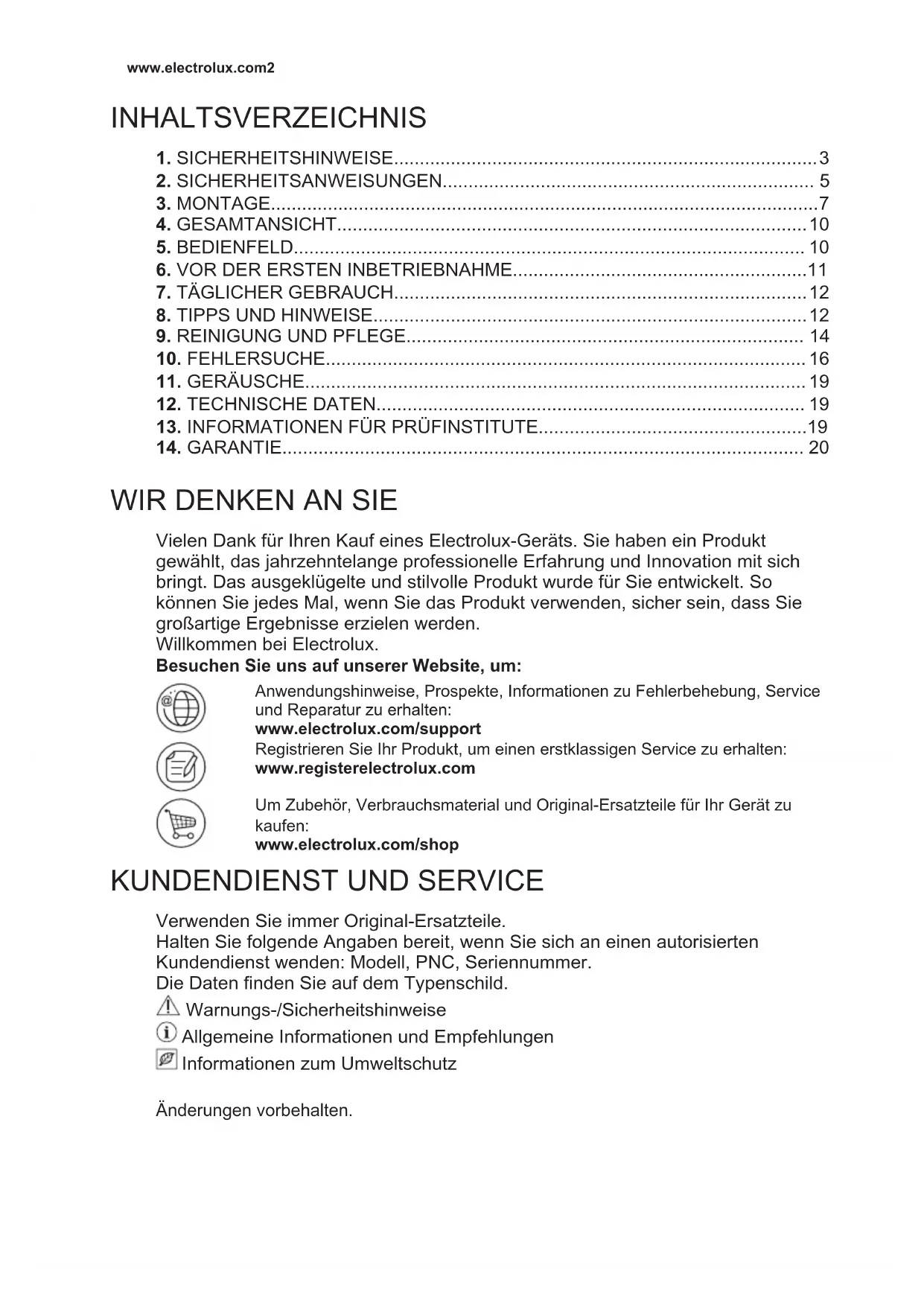 Verwenden Sie immer Original-Ersatzteile. Halten Sie folgende Angaben bereit, wenn Sie sich an einen autorisierten Kundendienst wenden: Modell, PNC, Seriennummer. Die Daten finden Sie auf dem Typenschild. Warnungs-/Sicherheitshinweise Allgemeine Informationen und Empfehlungen Informationen zum Umweltschutz Änderungen vorbehalten. www.electrolux.com21. SICHERHEITSHINWEISE Lesen Sie vor der Montage und dem Gebrauch des Geräts zuerst die Bedienungsanleitung. Bei Verletzungen oder Schäden infolge nicht ordnungsgemäßer Montage oder Verwendung übernimmt der Hersteller keine Haftung. Bewahren Sie die Anleitung zum Nachschlagen an einem sicheren und zugänglichen Ort auf.